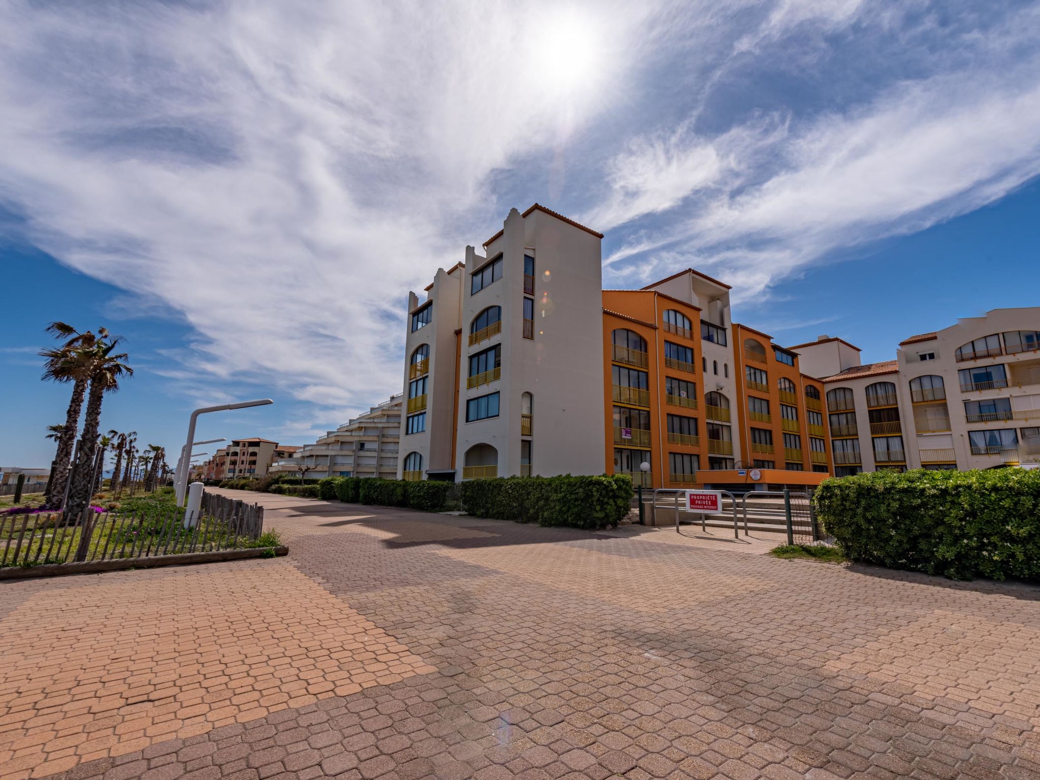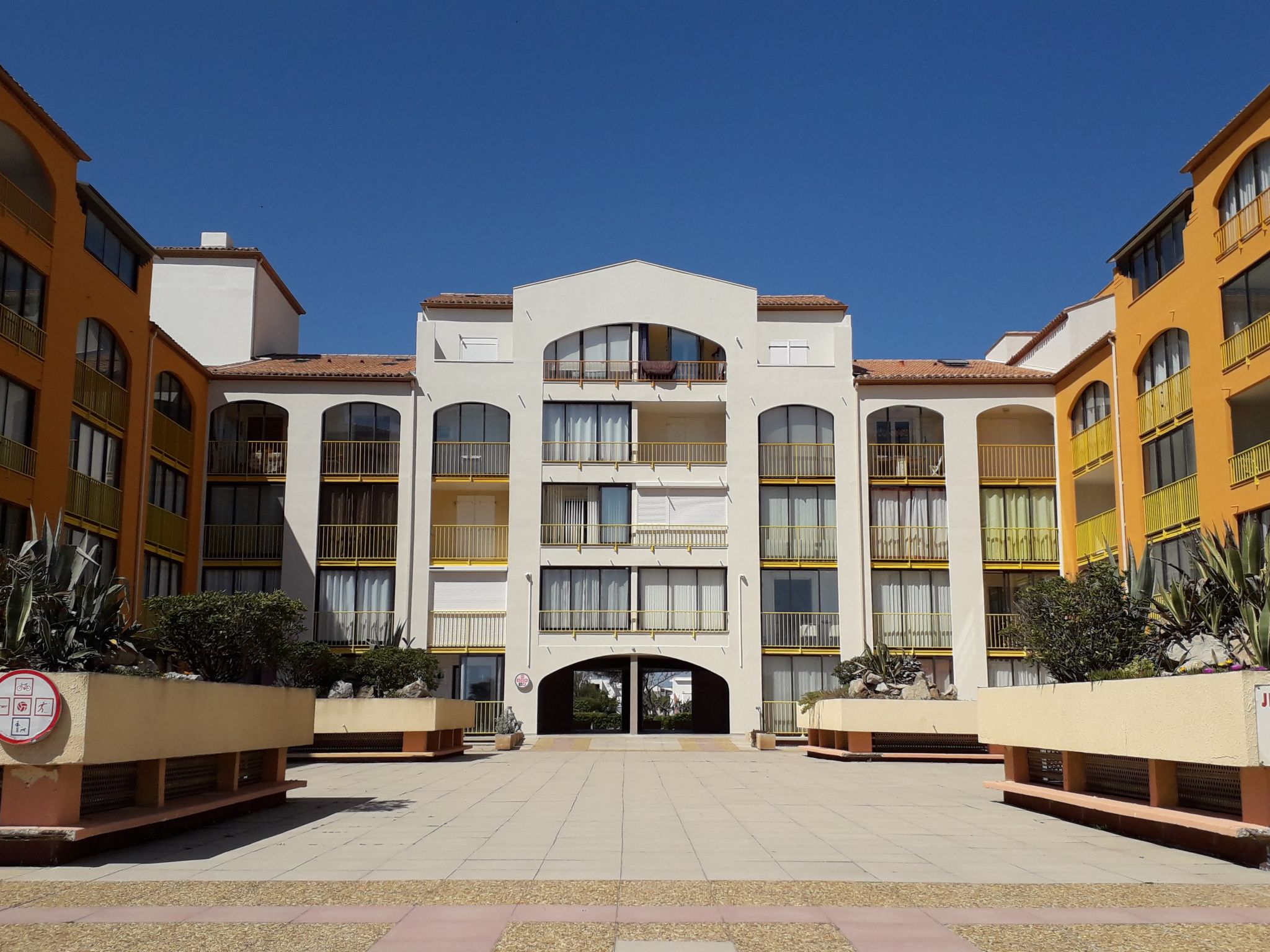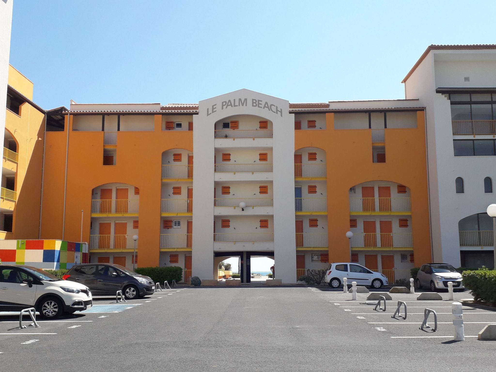Résidence "Palm Beach", de 3 étages. 300 appartements dans la résidence. Dans le quartier de La Grande Plage, à 100 m de la mer, à 100 m de la plage. Parking public 150 m. Magasins, magasin d'alimentation, centre commercial, restaurant, bar, café, location de bicyclettes 150 m, arrêt de bus "Les Marines" 650 m, gare ferroviaire "de la Franqui" 15 km. Port plaisance 4 km. Attractions à proximité: Aqualand Port Leucate 2 km, Réserve Africaine de Sigean 41 km, site des dosses 4 km, téléski nautique 5 km. Les lacs connus sont facilement accessibles: Etang de Leucate ou salses 8 km, Lac de Villeneuve de la Raho 28 km. Région de randonnées: Sentier du guetteur 8 km, la forteresse de salses 15 km, Sentier du littoral Collioure 40 km. Veuillez noter: D’autres appartements sont également proposés à la location dans cette maison de vacances.