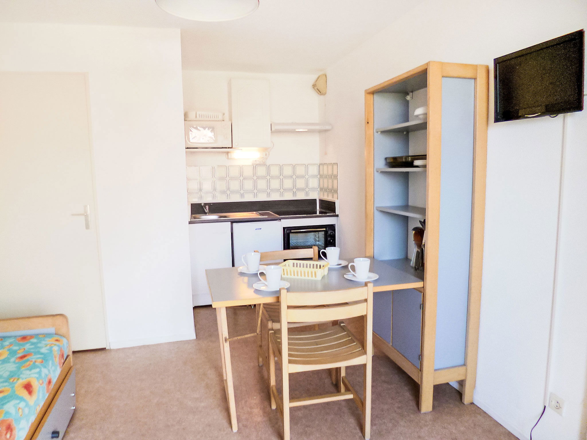 Appartement de 2 pièces 25 m2 au 1er étage. Aménagement fonctionnel: séjour/salle à manger avec 1 divan-lit double (1 x 140 cm, longueur 190 cm), TV. Sortie sur le balcon. 1 chambre avec 1 grand-lit (140 cm, longueur 190 cm). Coin cuisine (mini-four, four, 4 plaques vitrocéramiques, grille-pain, bouilloire électrique, micro-ondes, cafetière électrique). Bain/WC. Chauffage électrique. Balcon 7 m2, situation nord. Meubles de terrasse. Vue latérale sur la mer. A disposition: Internet (Connexion WIFI, en sus). Veuillez noter: maximum 1 animal/ chien autorisé. Détecteur de fumée. Accès à la salle de bains par la chambre à grand lit.