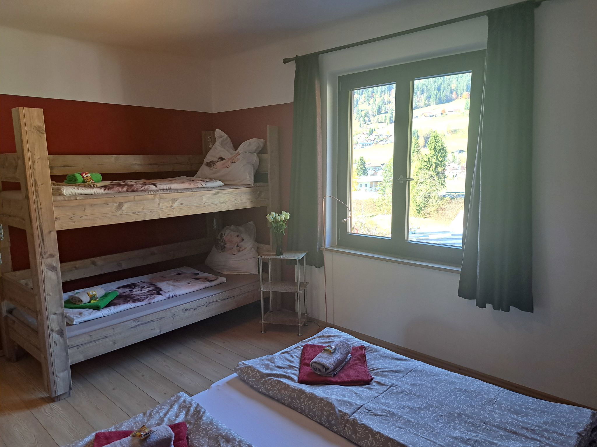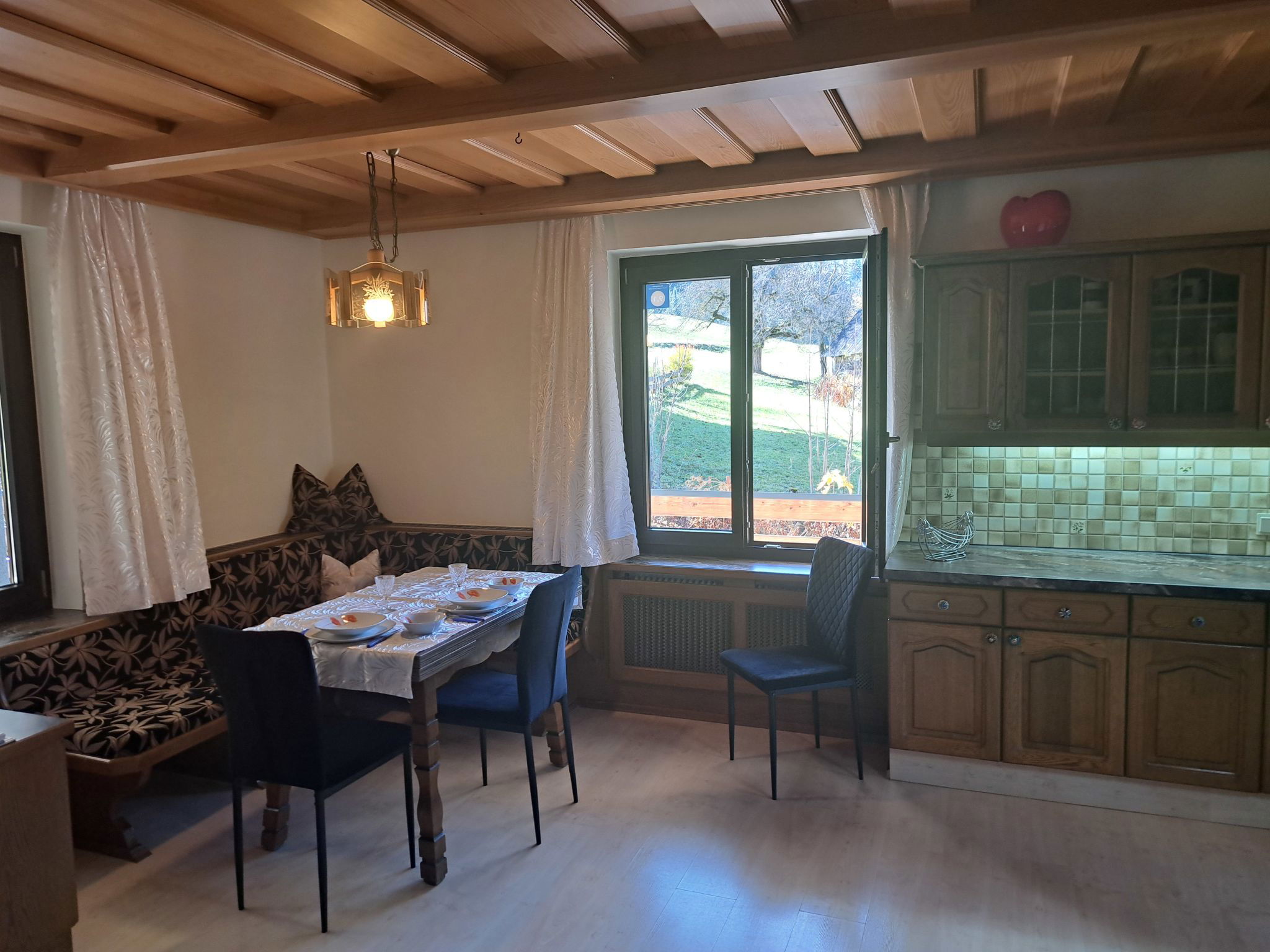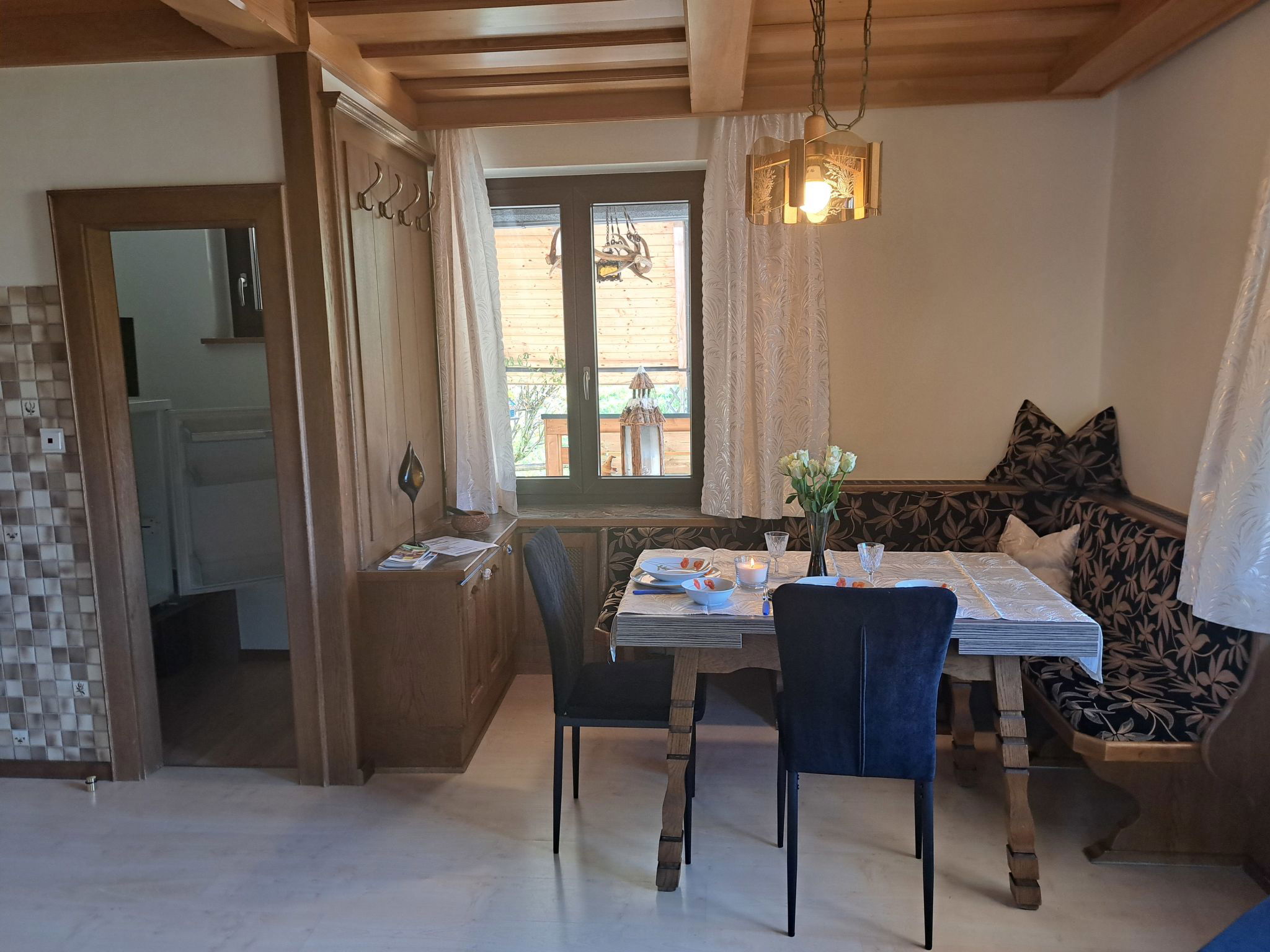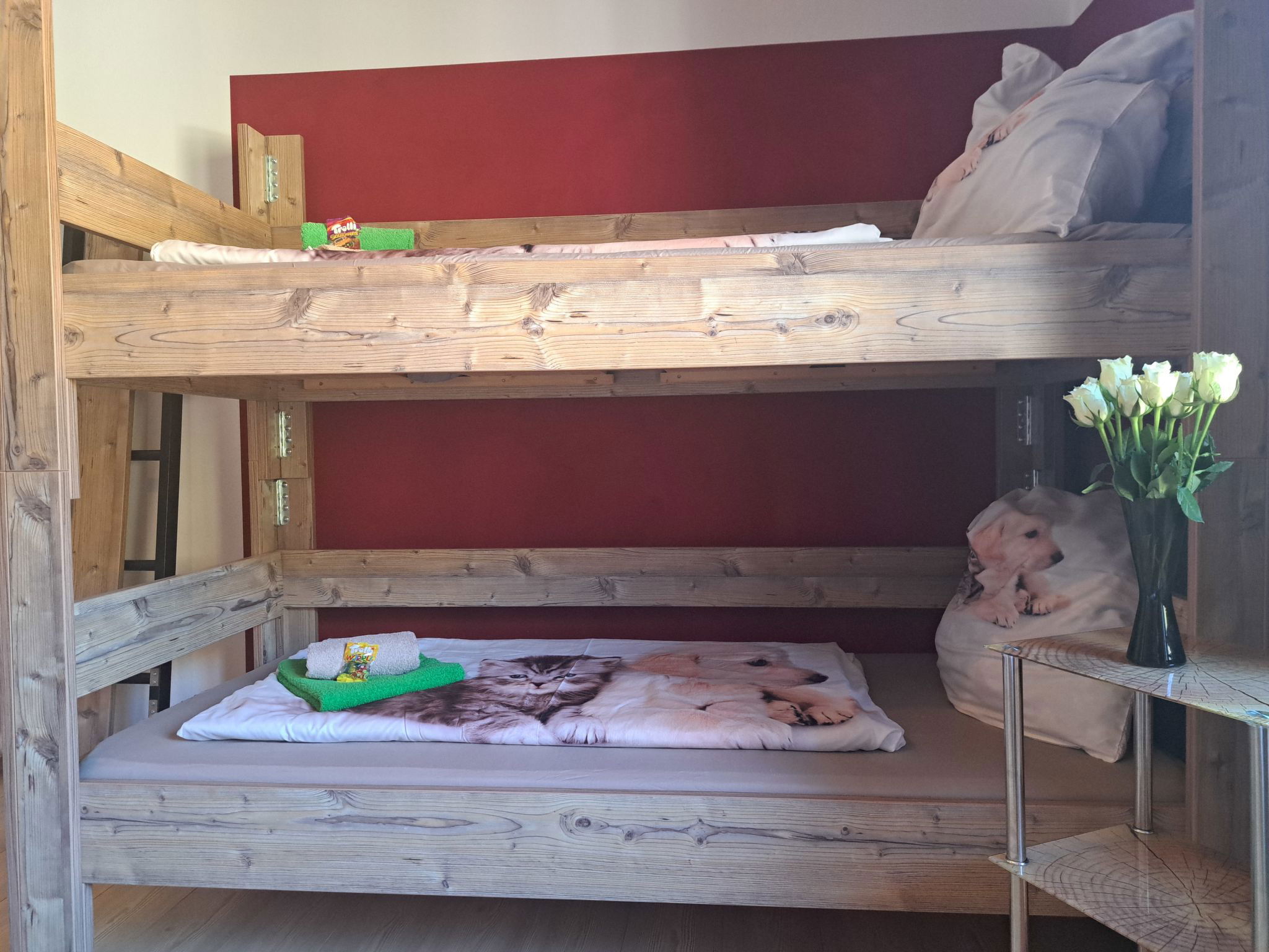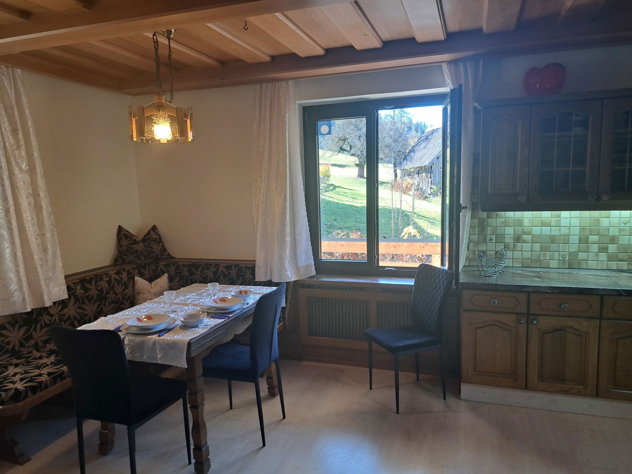 "Appartement 2", Appartement de 3 pièces 70 m2 au 1er étage. Aménagement plaisant: entrée. 1 chambre double. 1 chambre avec 1 x 2 lits superposés, 1 lit double. Grande cuisine (four, lave-vaisselle, 4 plaques vitrocéramiques, grille-pain, bouilloire électrique, micro-ondes, congélateur, cafetière électrique) avec coin repas. Douche, WC séparé. Chauffage. Sol en parquet. Grande terrasse. Veuillez noter: maison non-fumeur. Maximum 2 animaux/ chiens autorisés. // Reg. Nr.: 502100001702020