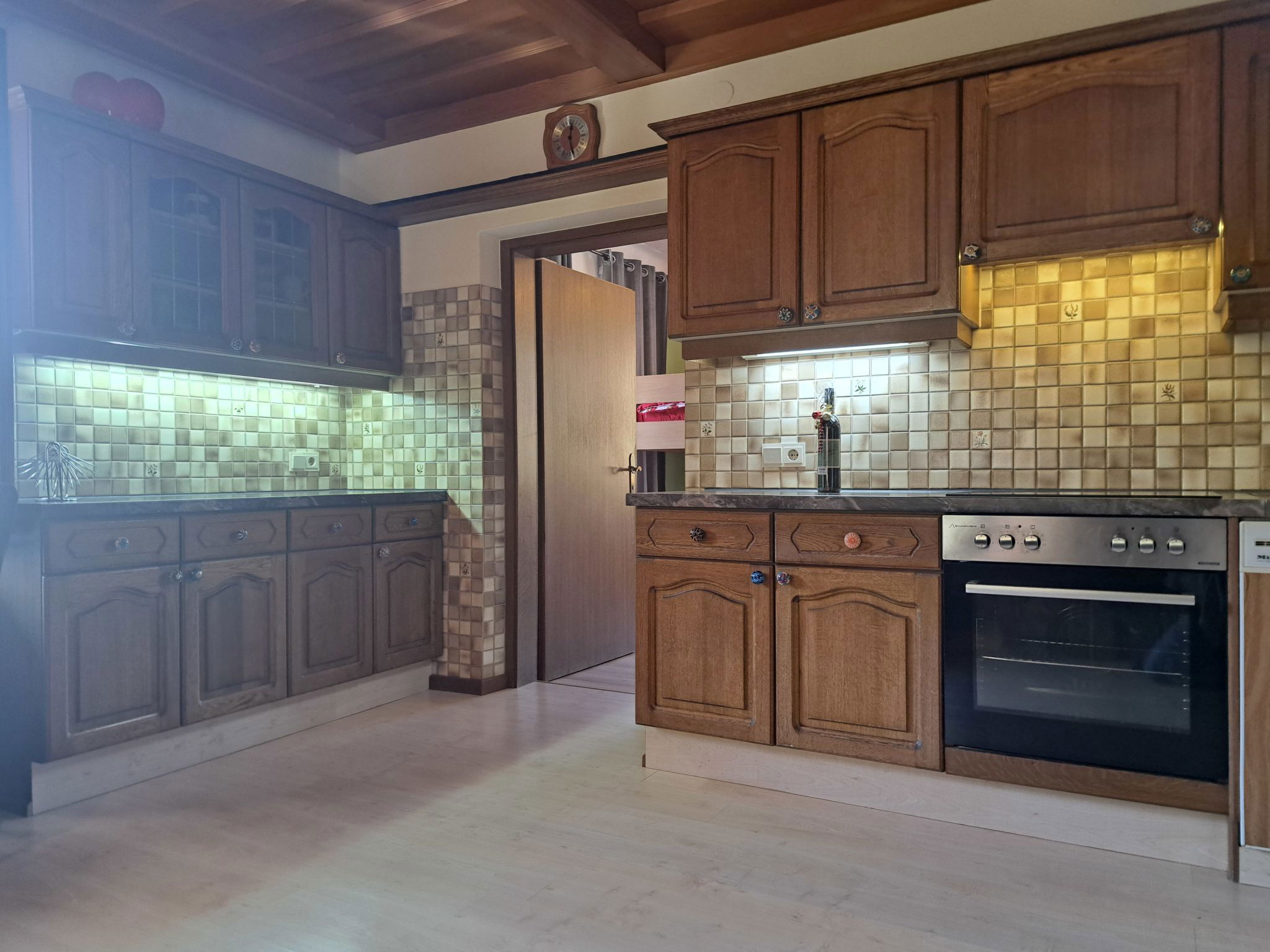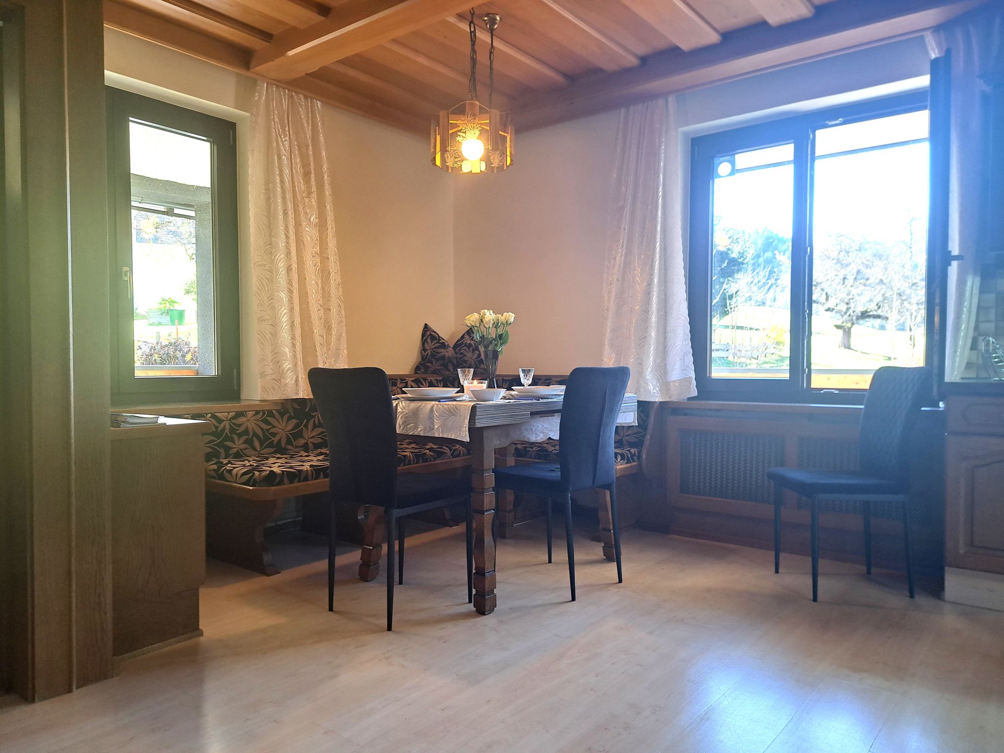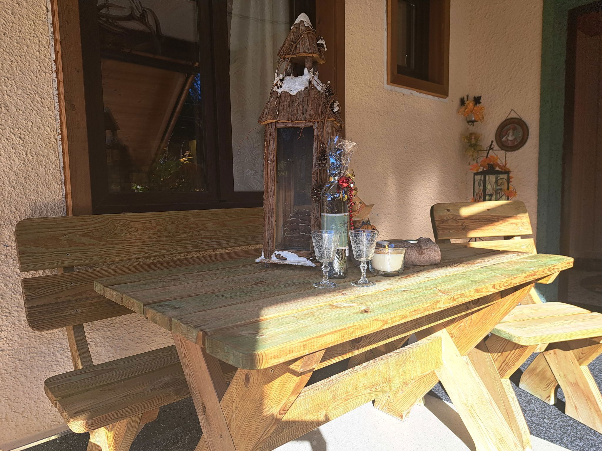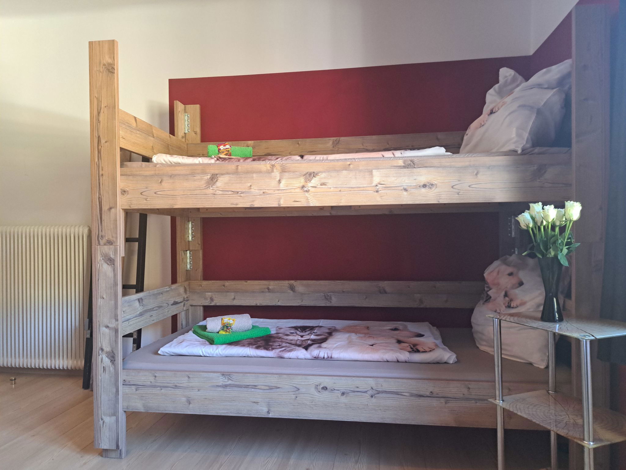 "Appartement 2", Appartement de 3 pièces 70 m2 au 1er étage. Aménagement plaisant: entrée. 1 chambre double. 1 chambre avec 1 x 2 lits superposés, 1 lit double. Grande cuisine (four, lave-vaisselle, 4 plaques vitrocéramiques, grille-pain, bouilloire électrique, micro-ondes, congélateur, cafetière électrique) avec coin repas. Douche, WC séparé. Chauffage. Sol en parquet. Grande terrasse. Veuillez noter: maison non-fumeur. Maximum 2 animaux/ chiens autorisés. // Reg. Nr.: 502100001702020