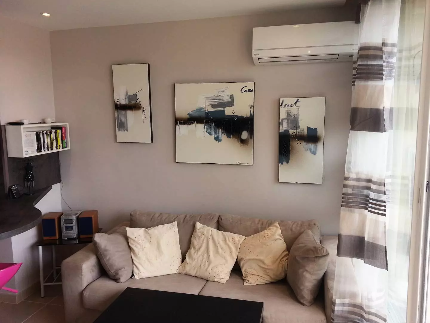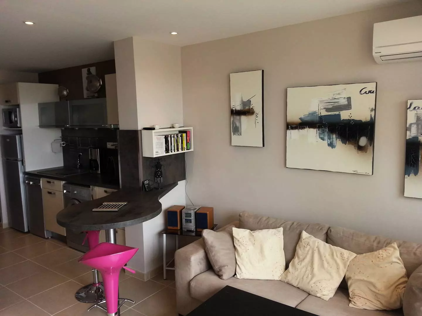 Grand studio joliment aménagé. Orienté sud, grand séjour ouvert sur une terrasse bien ensoleillée. Dans l'entrée, il y a un grand placard. Dans le séjour, un lit en 160 et un canapé.