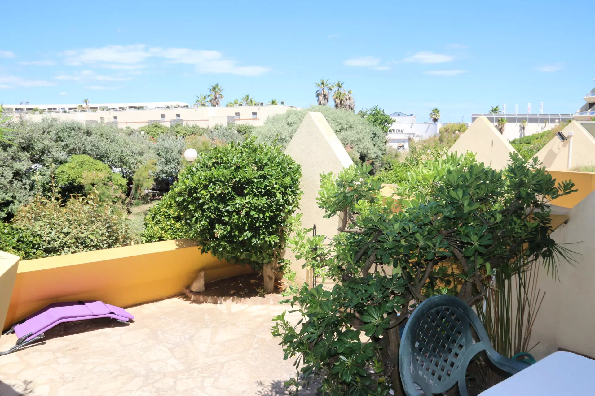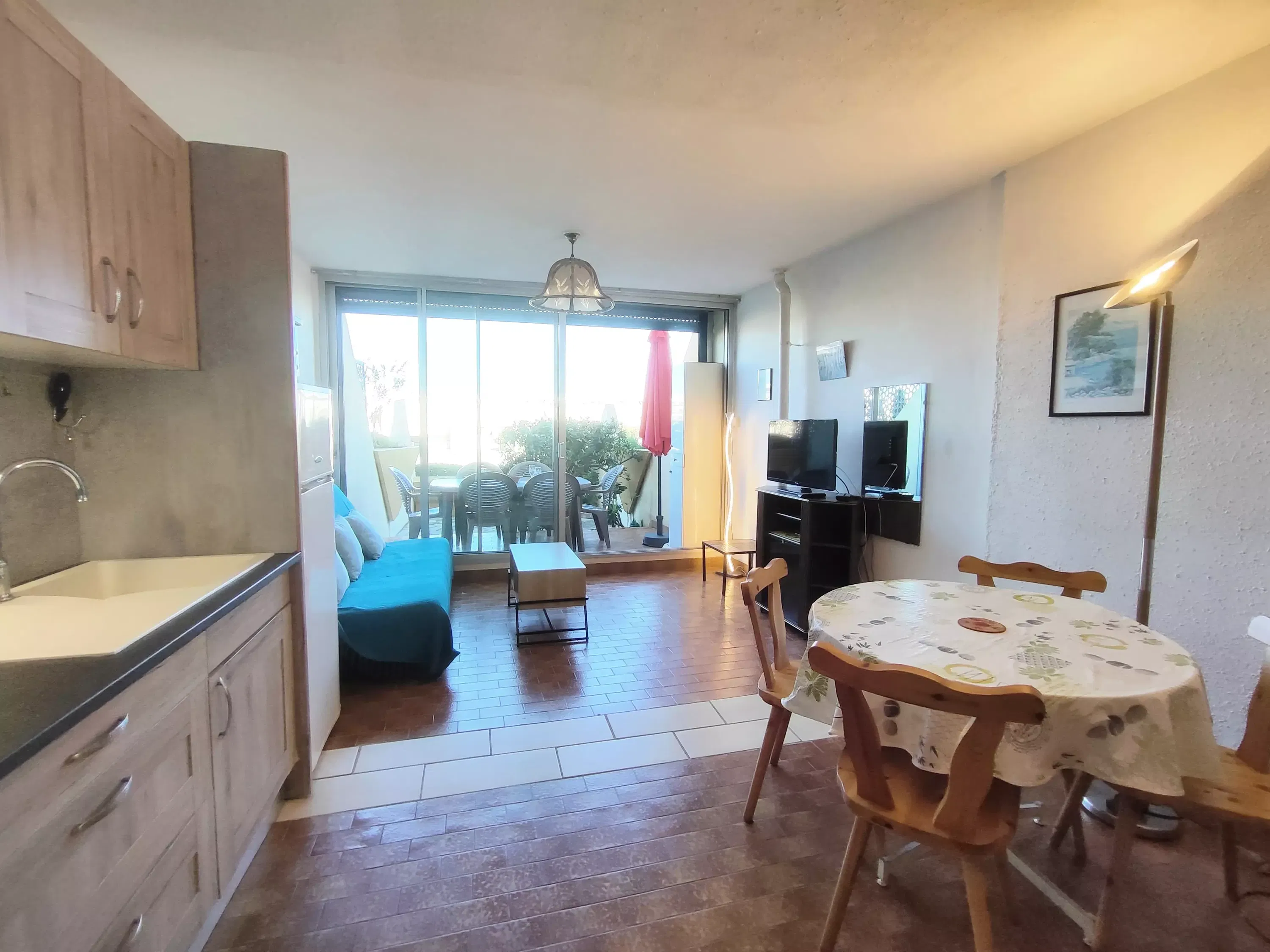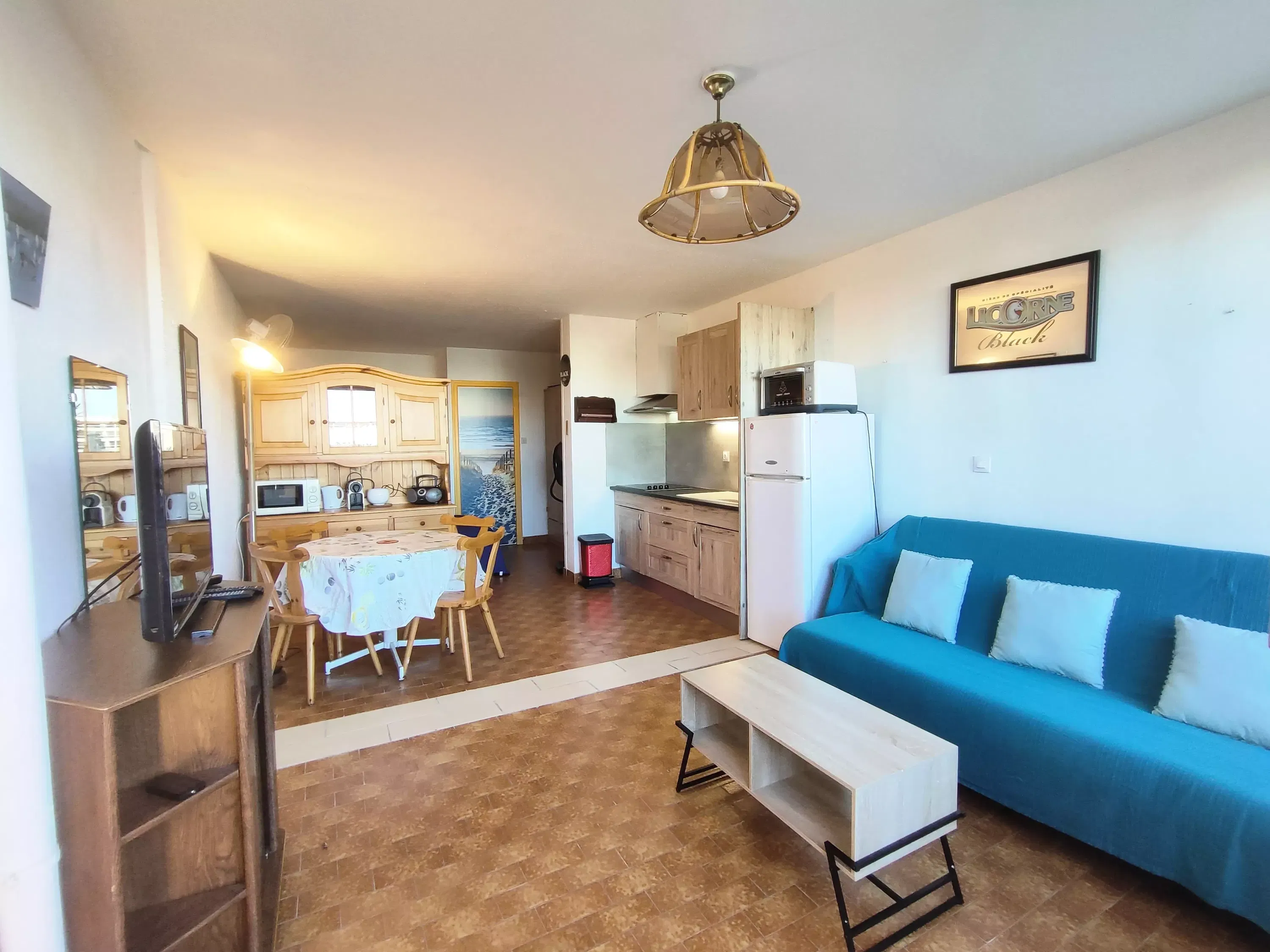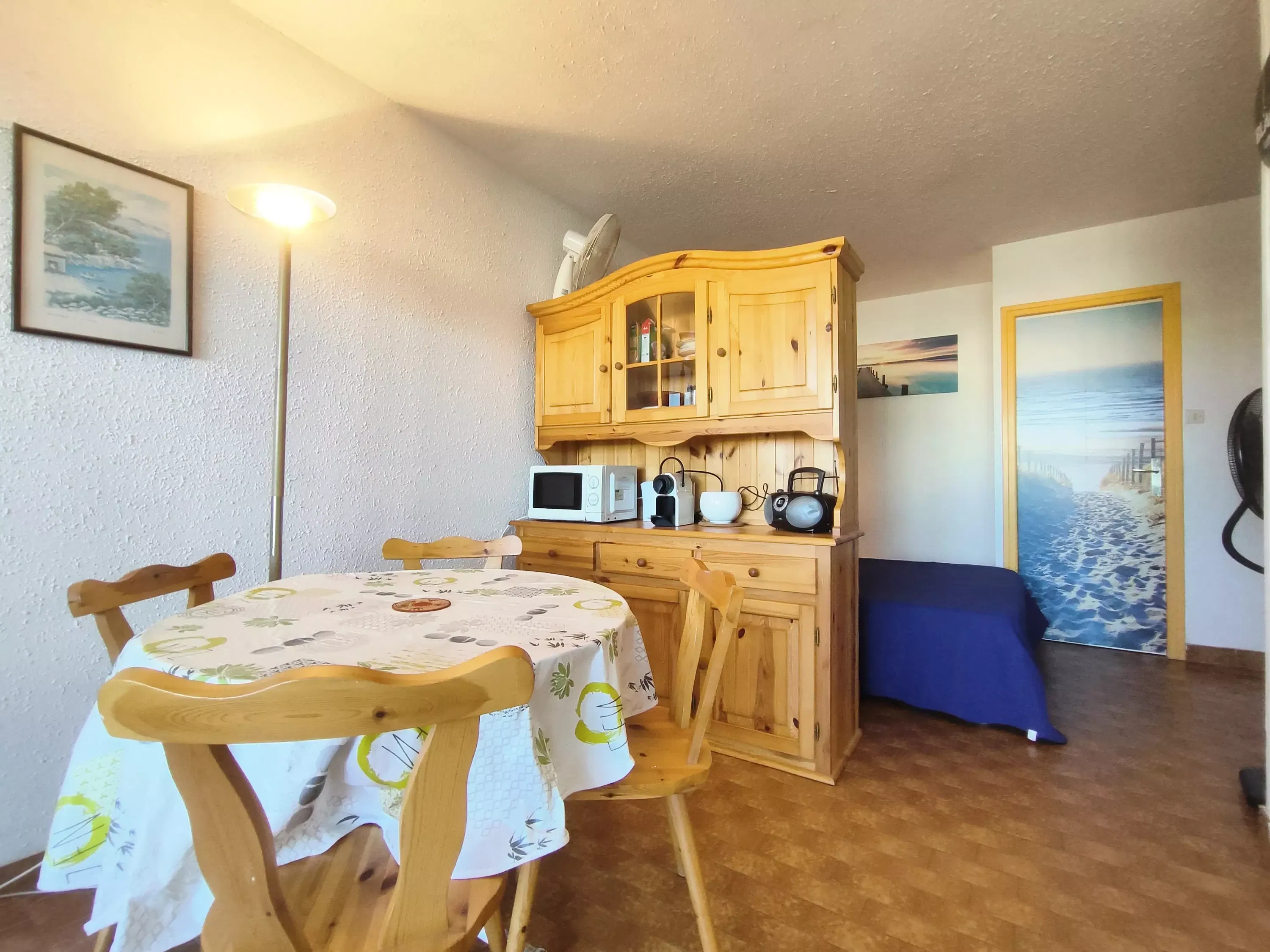 Grand Studio 2 personnes , état d'usage, situé à Héliopolis Entrée E, au 1er étage avec ascenseur, côté intérieur. Séjour avec un lit en 140 cm. Coin cuisine avec grand réfrigérateur, micro-ondes, cafetière Nespresso et télévision. Salle d'eau et WC séparés. Terrasse. Pas de parking.