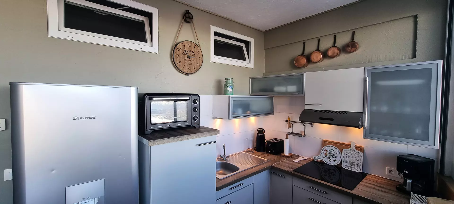 La cuisine américaine est équipée d'un mini four électrique et d'un micro-onde, de 4 plaques vitro céramiques, un réfrigérateur et lave vaisselle.