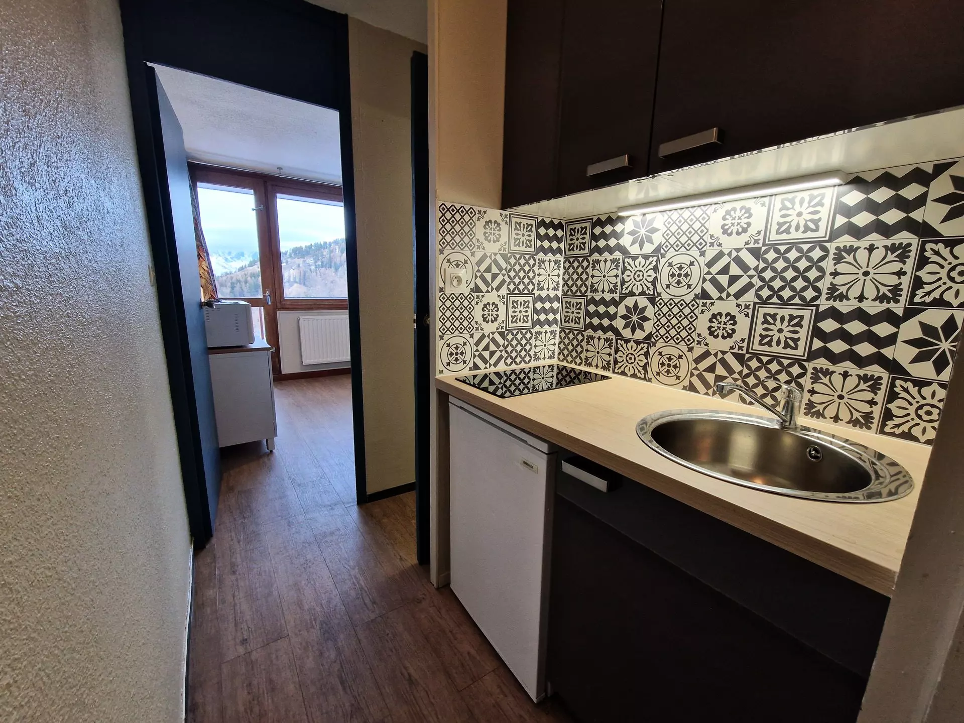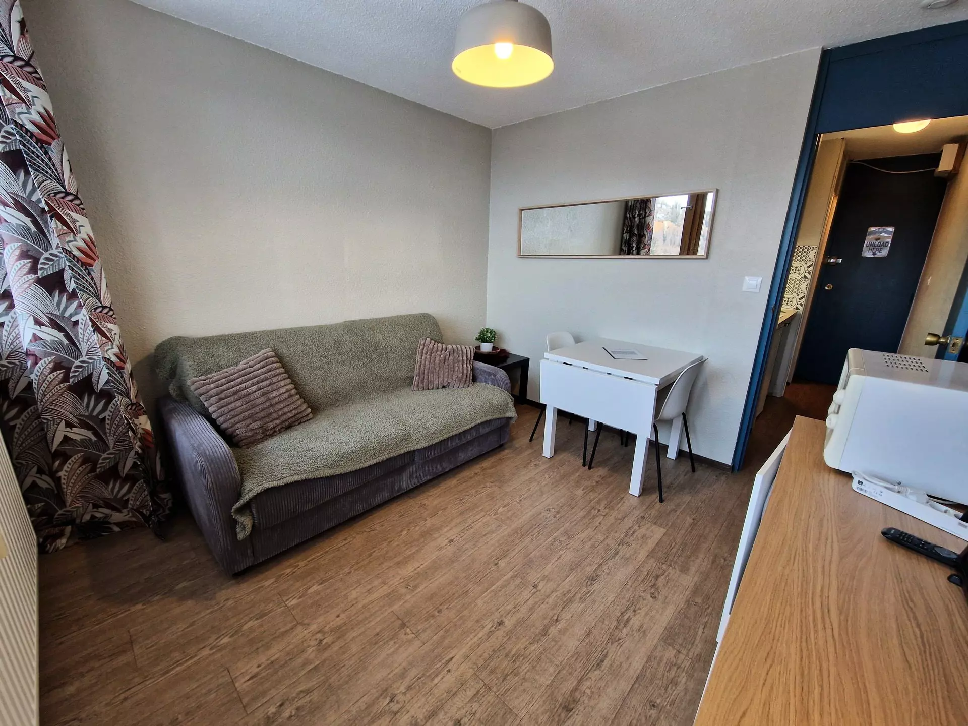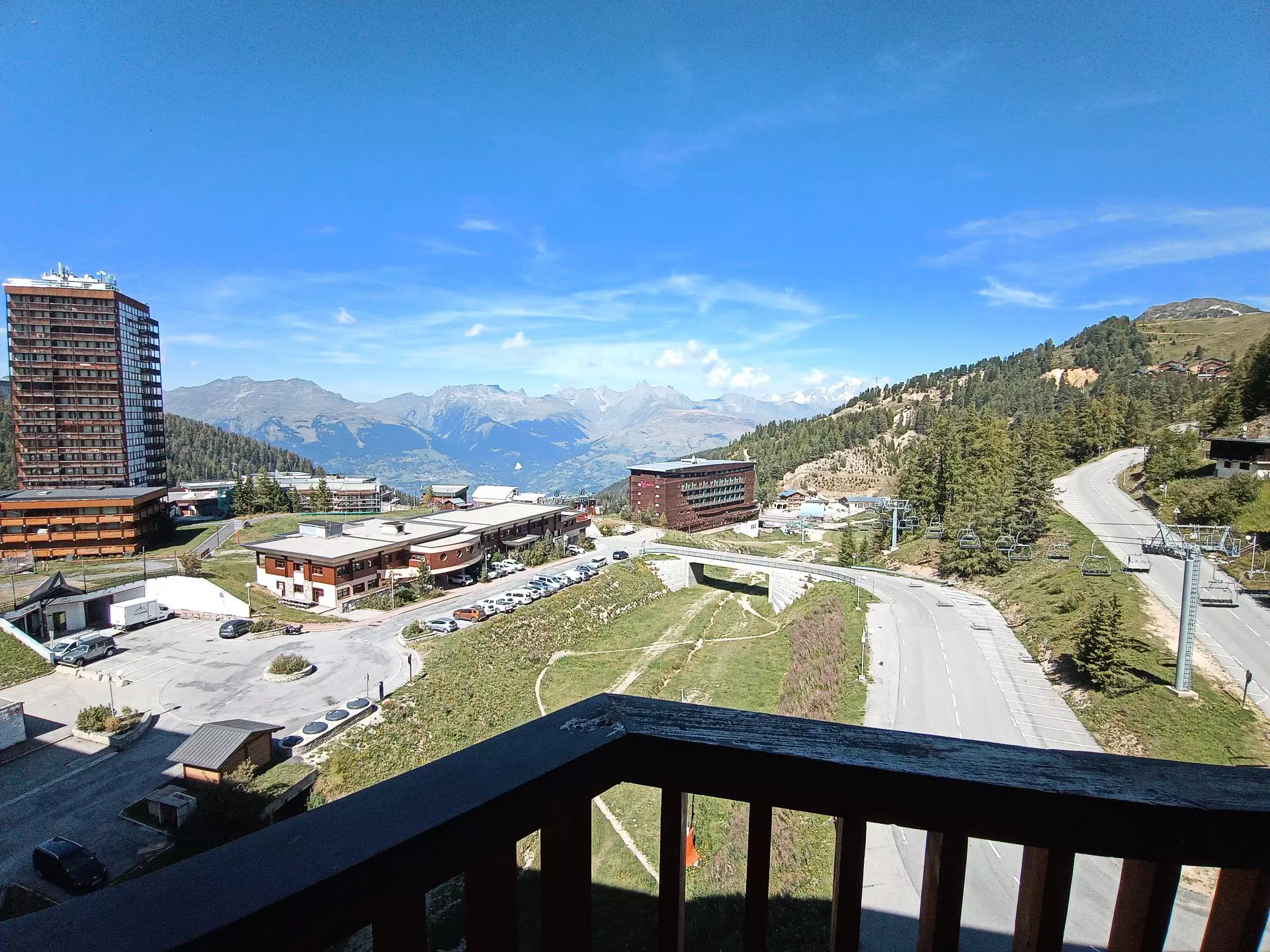 Stué dans la résidence Le France au pied des pistes de Plagne Centre. Studio rénové en automne 2023 de 16m² pour 2 personnes, au 7ème étage, avec balcon et vue sur la vallée.