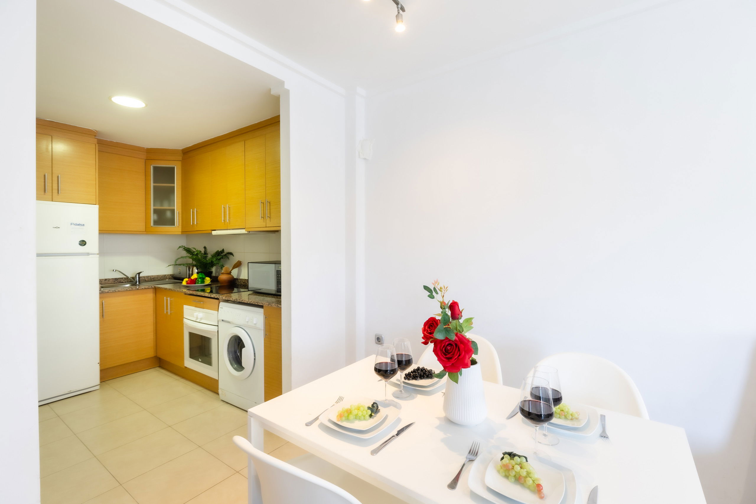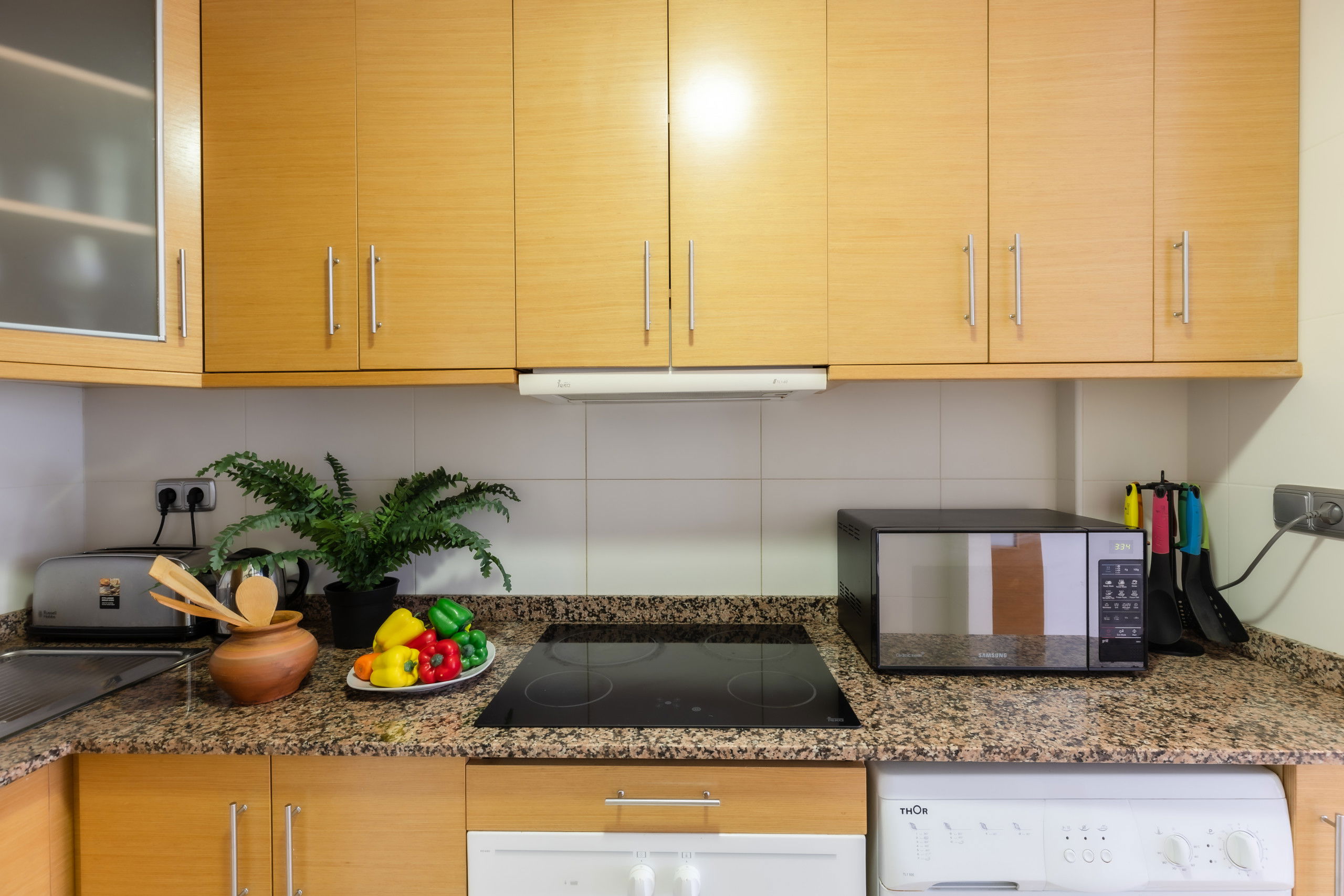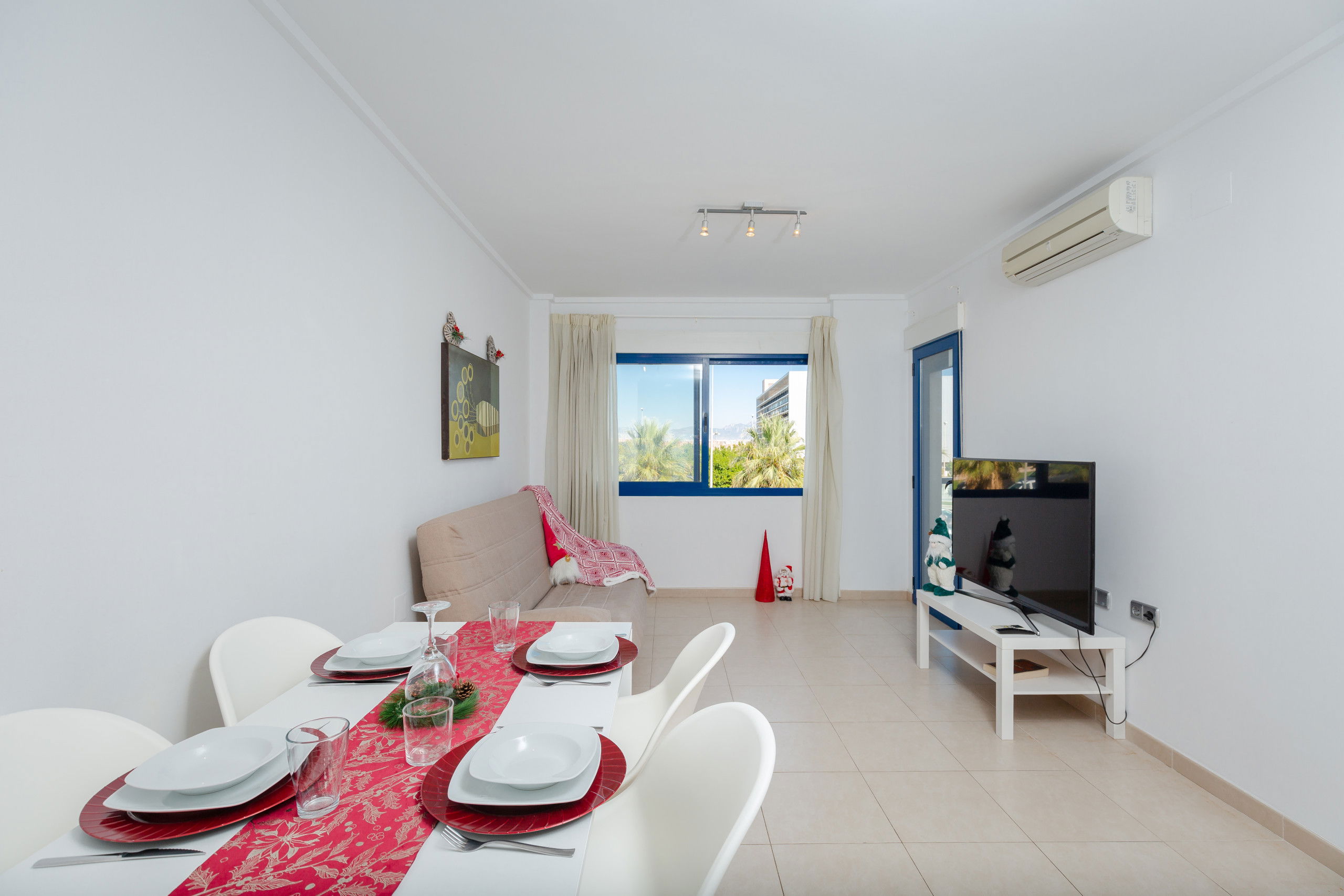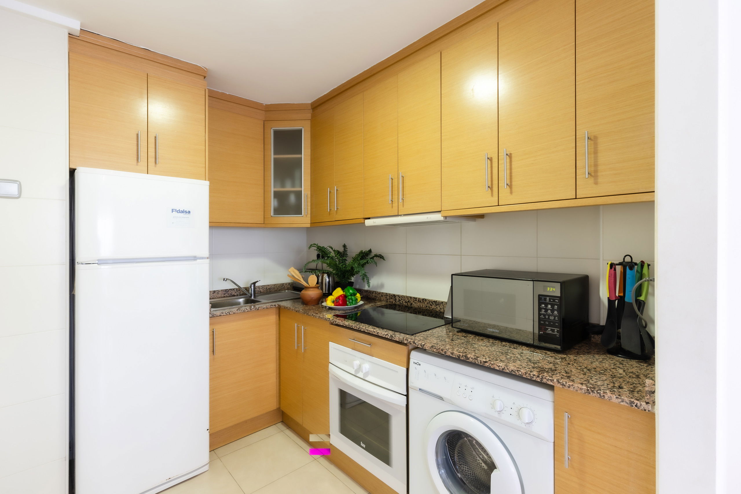 Cet appartement en bord de mer à Alicante dispose d'une terrasse, cuisine américaine équipée d'un réfrigérateur, four, congélateur, lave-linge, vaisselle, couverts,