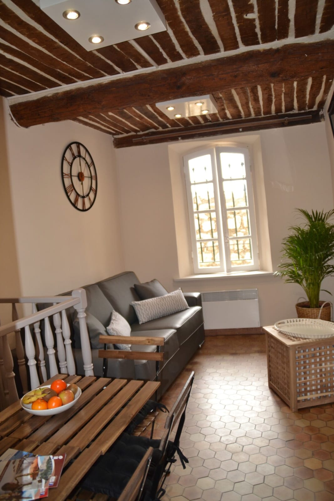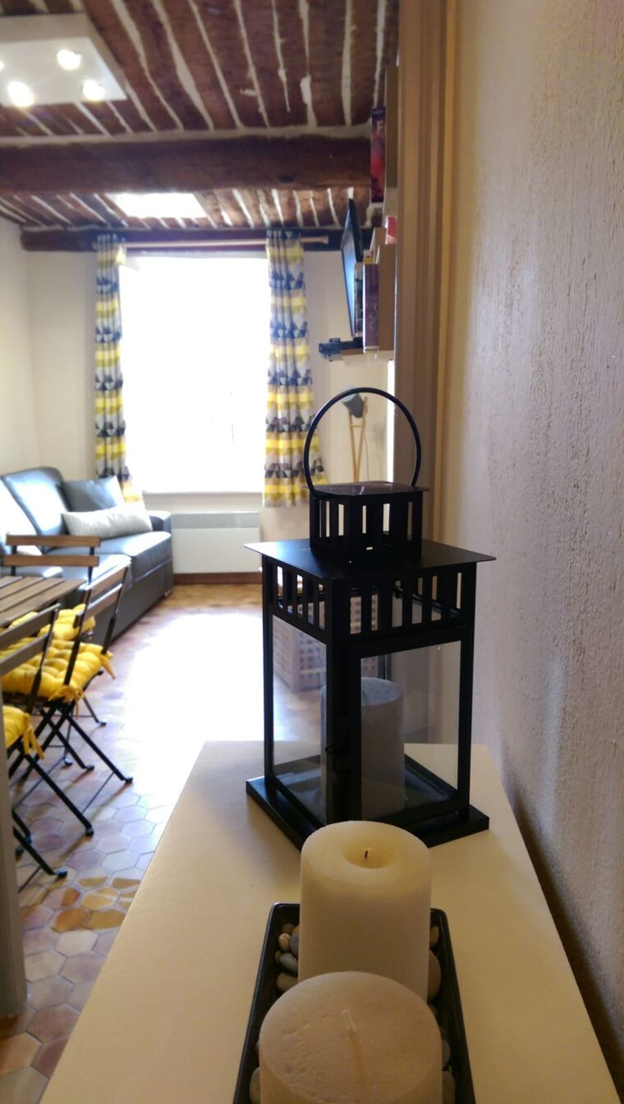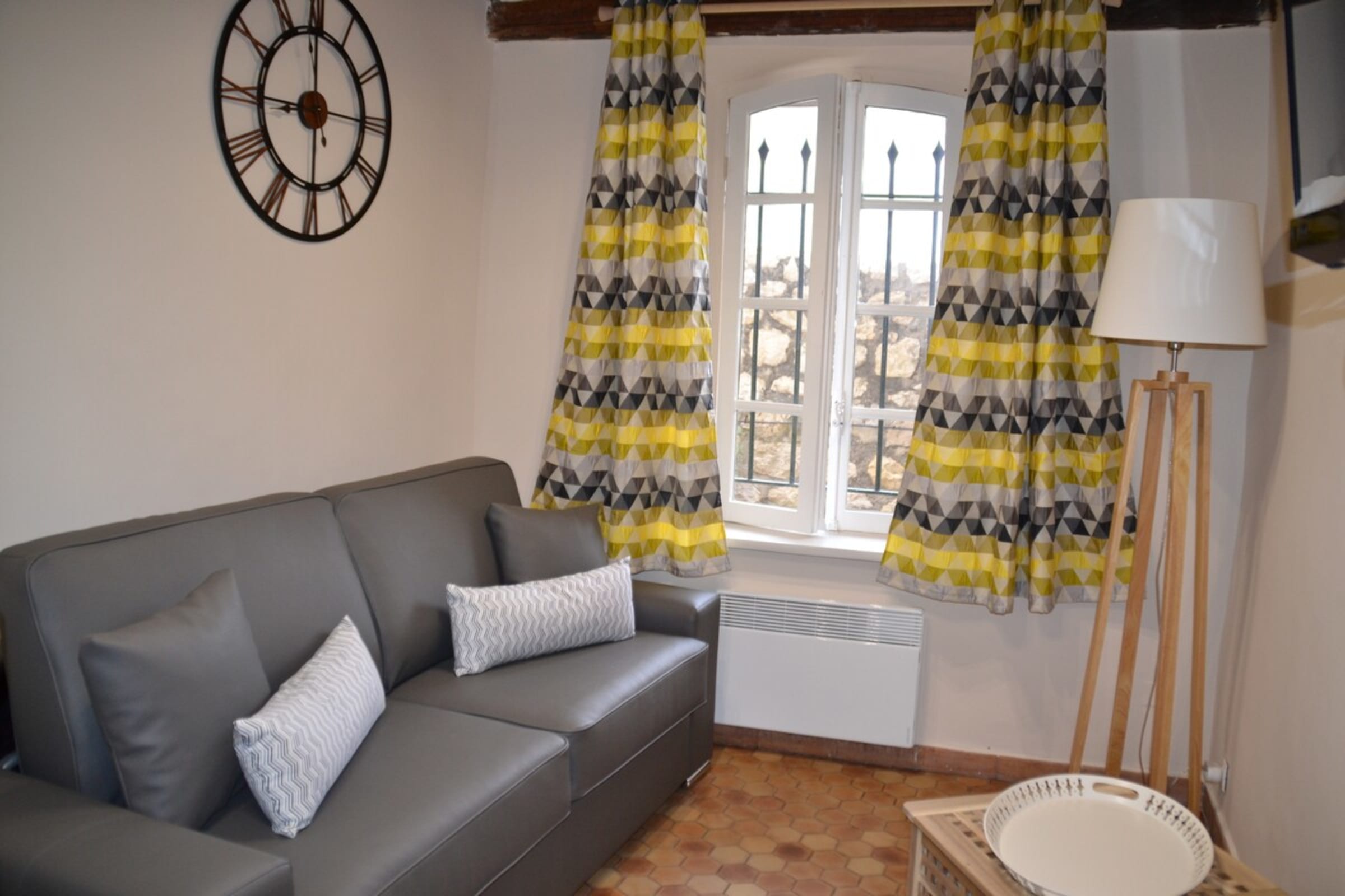 L'appartement se trouve au rez de chaussée d'un ancien immeuble du Vieil Antibes. Les fenêtres donnent sur un mur des remparts. Il n'y a donc pas de vue, en revanche l'emplacement est idéal.