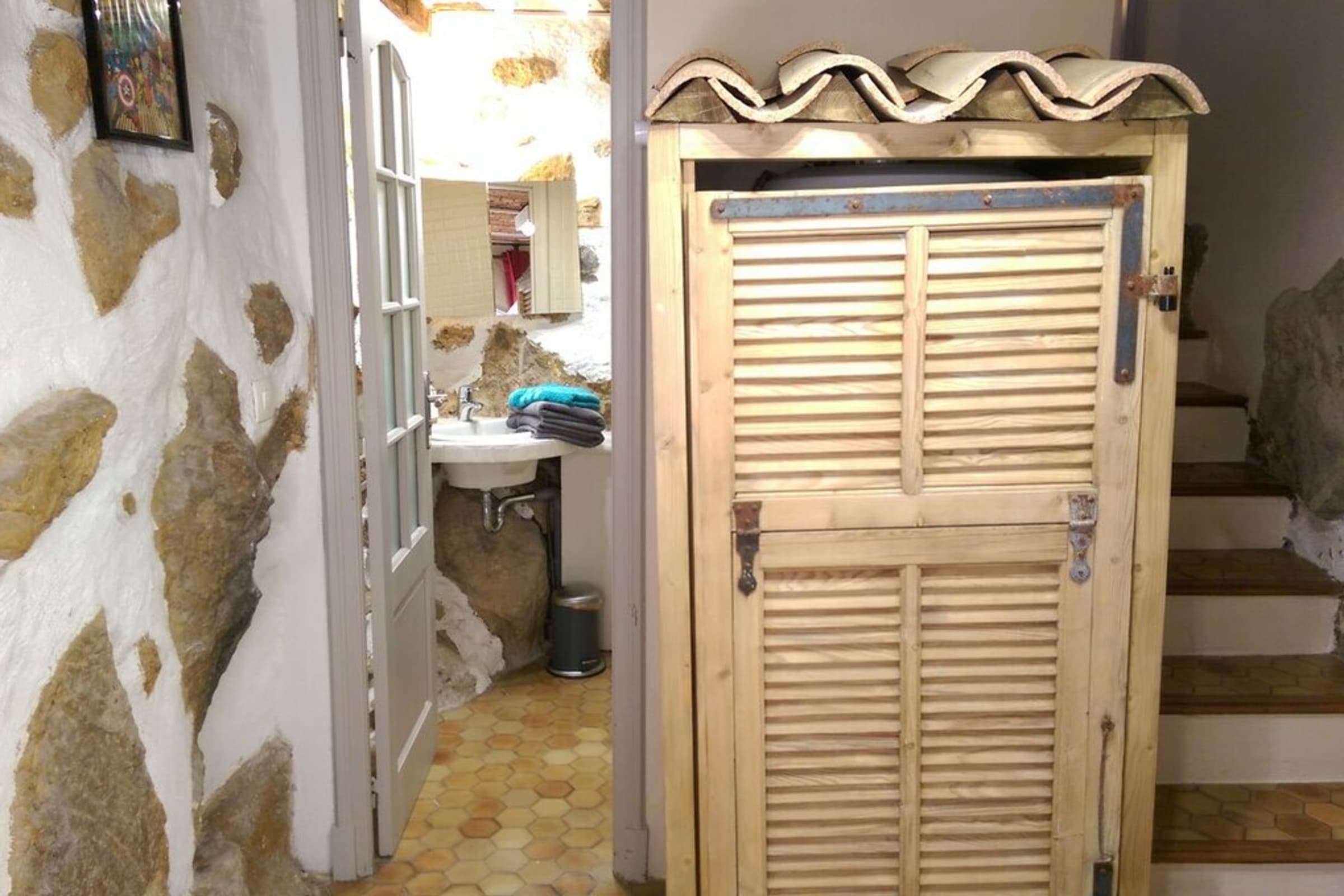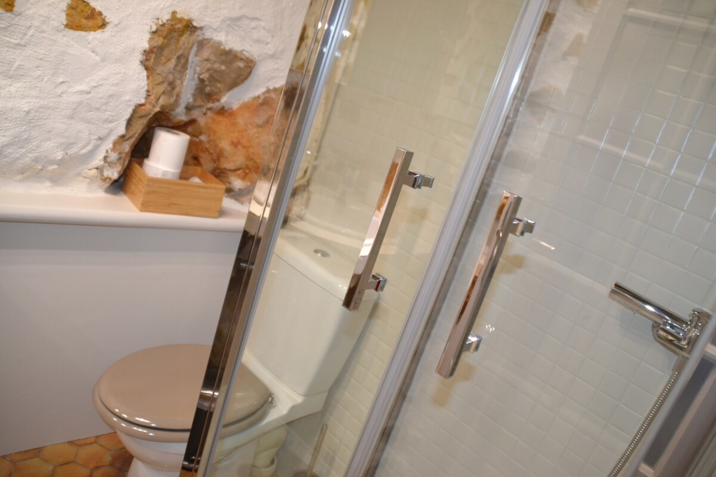 Une salle d’eau avec douche (dans la pièce du bas, il est donc nécessaire d’empreinter un escalier pour s'y rendre)
