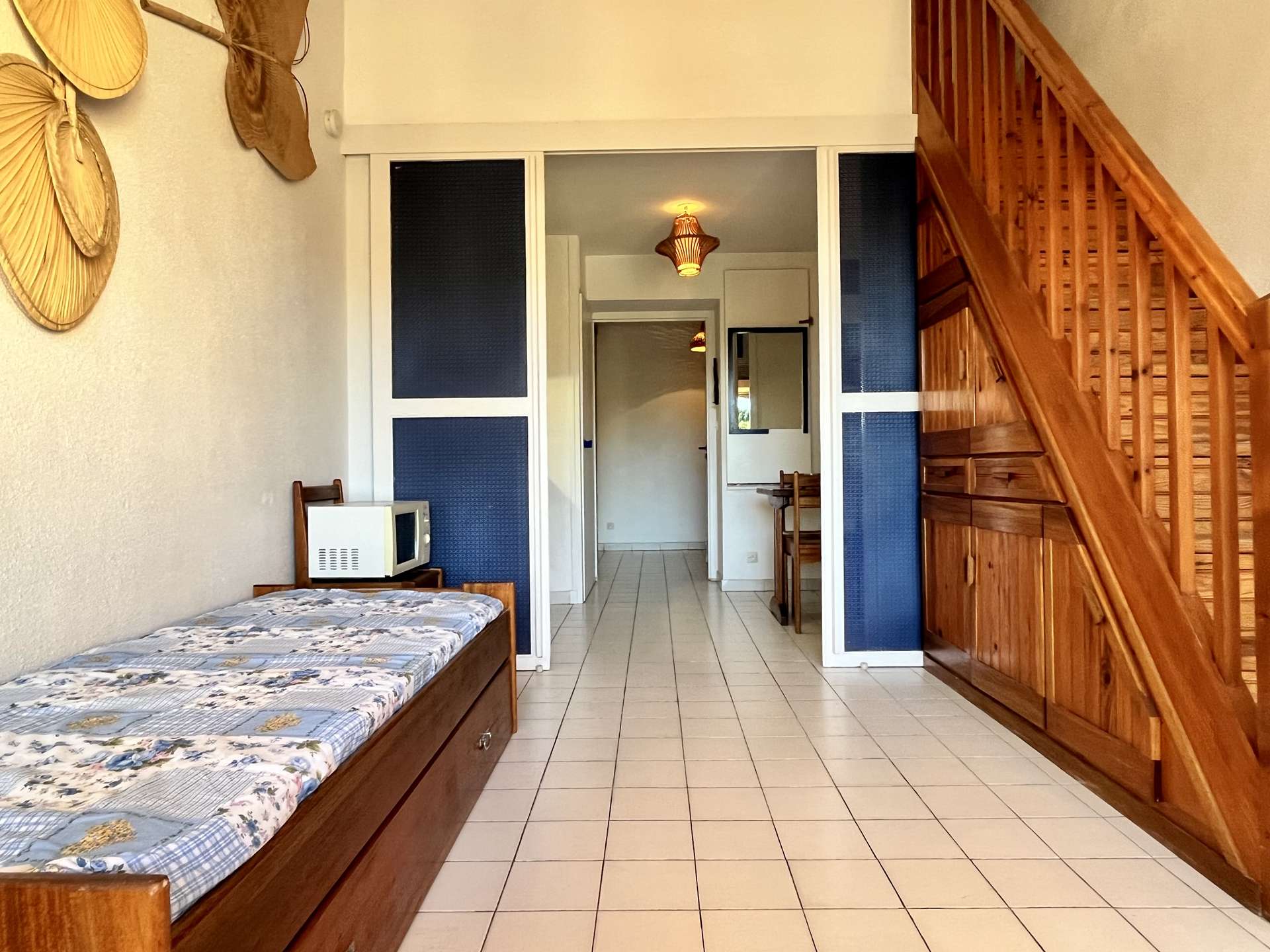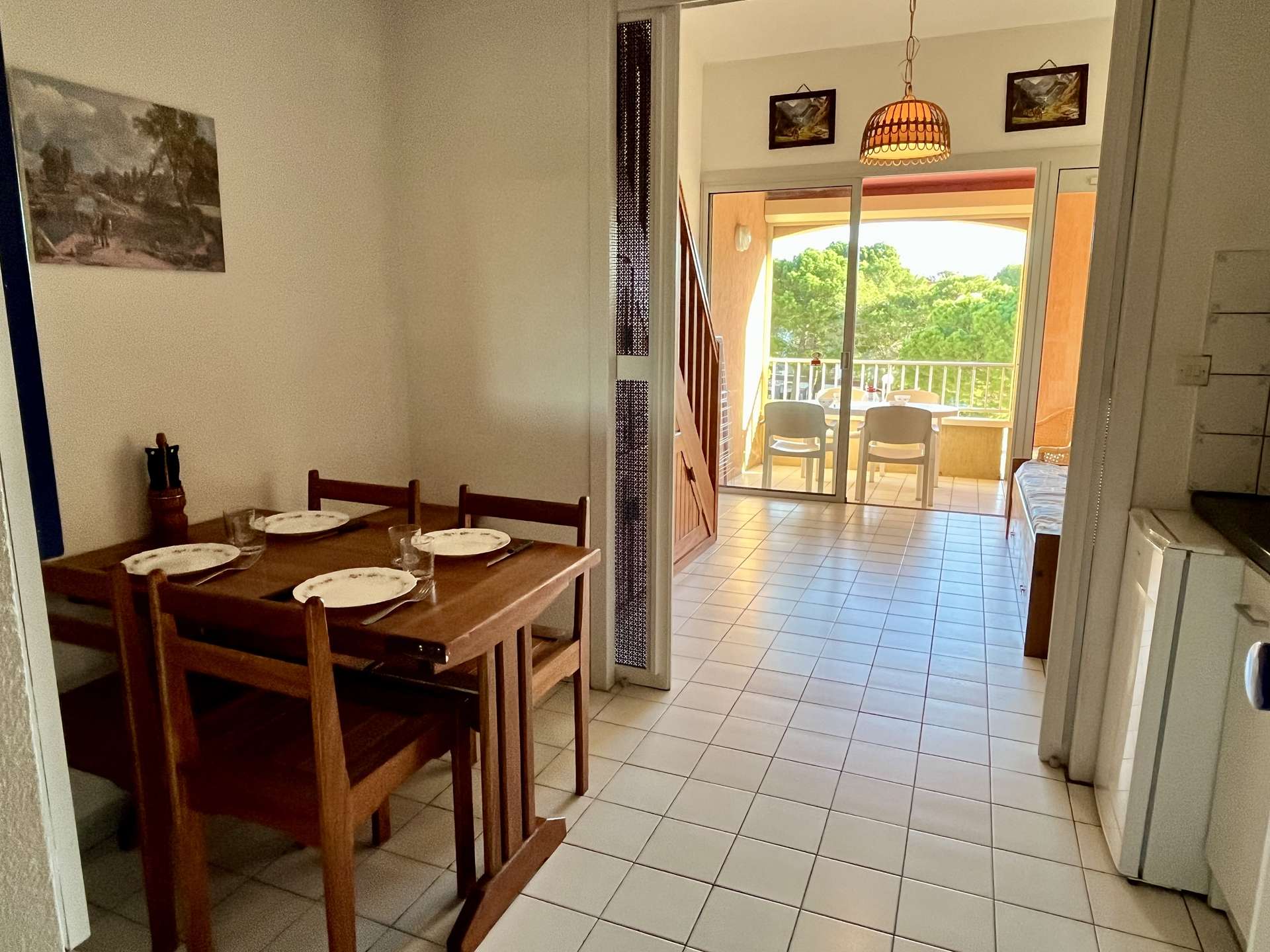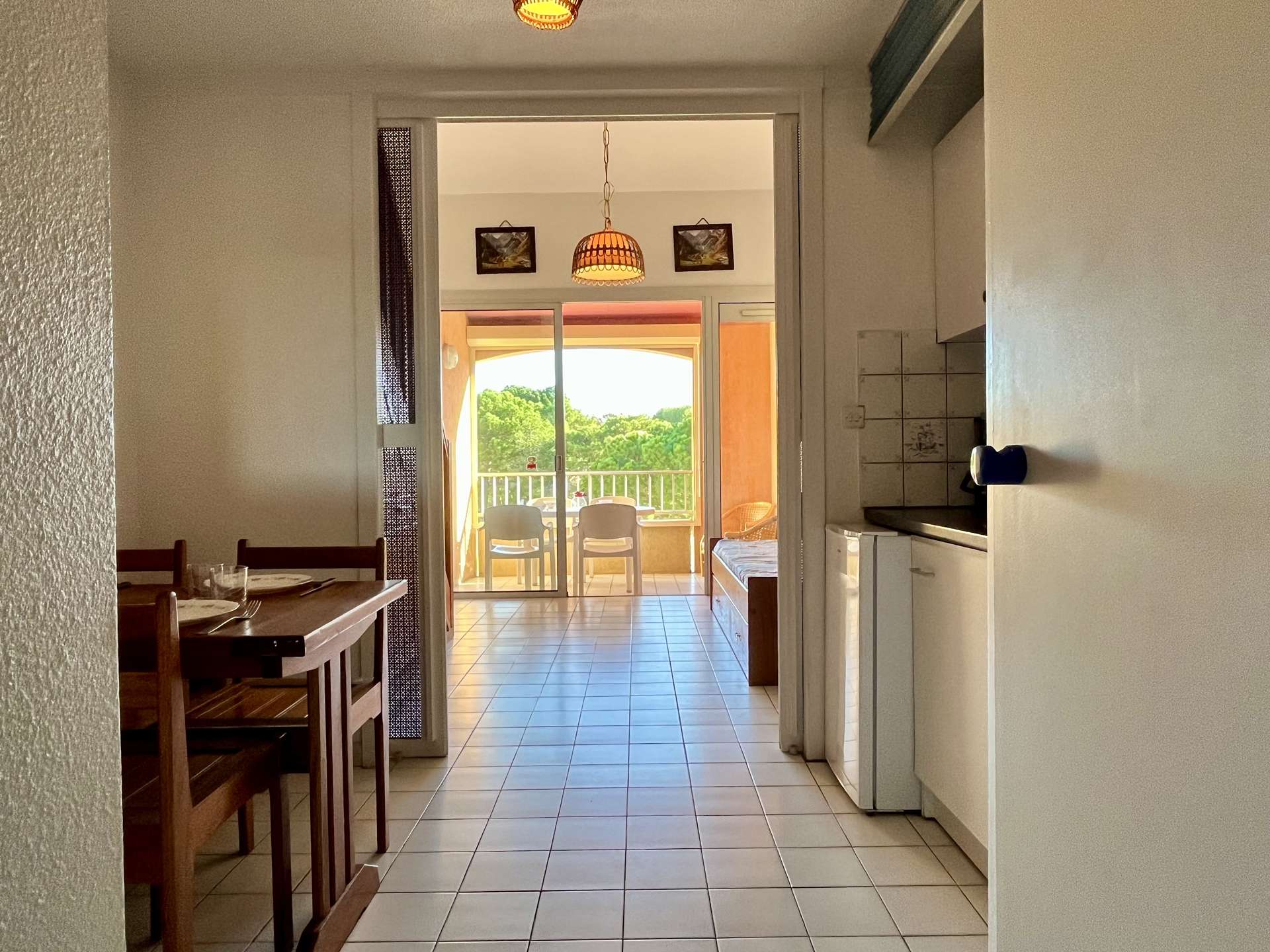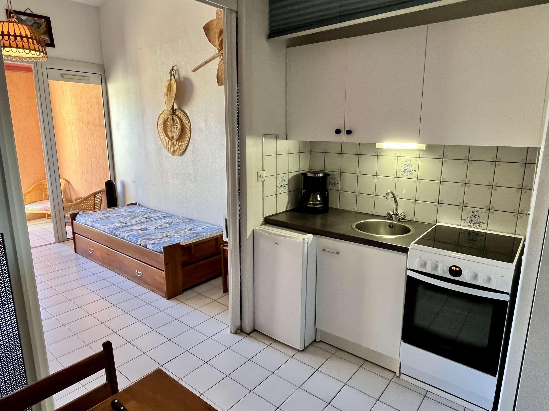 Cette location d'appartement de vacances, au troisième étage, exposée à l'Est, se compose d'un séjour doté d'un coin cabine avec deux lits gigognes une place, une kitchenette équipée, une mezzanine avec un lit deux places, une salle d'eau et des wc indépendants.