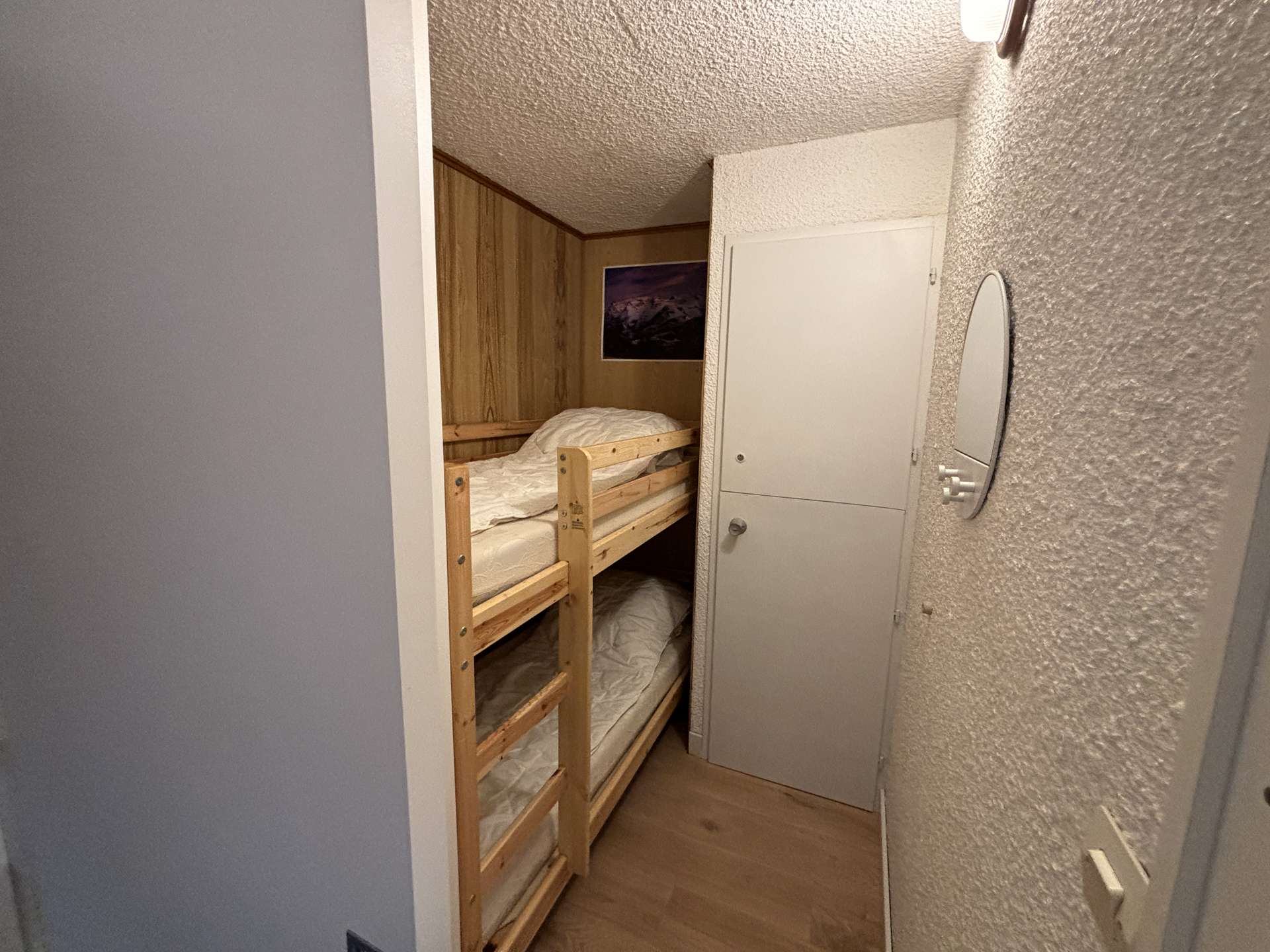 L’accès à l’appartement se fait par l’entrée située à gauche des casiers à skis de la résidence (en face de la piscine). Le logement se trouve au niveau 1, tandis que les casiers à skis sont situés au niveau 0.