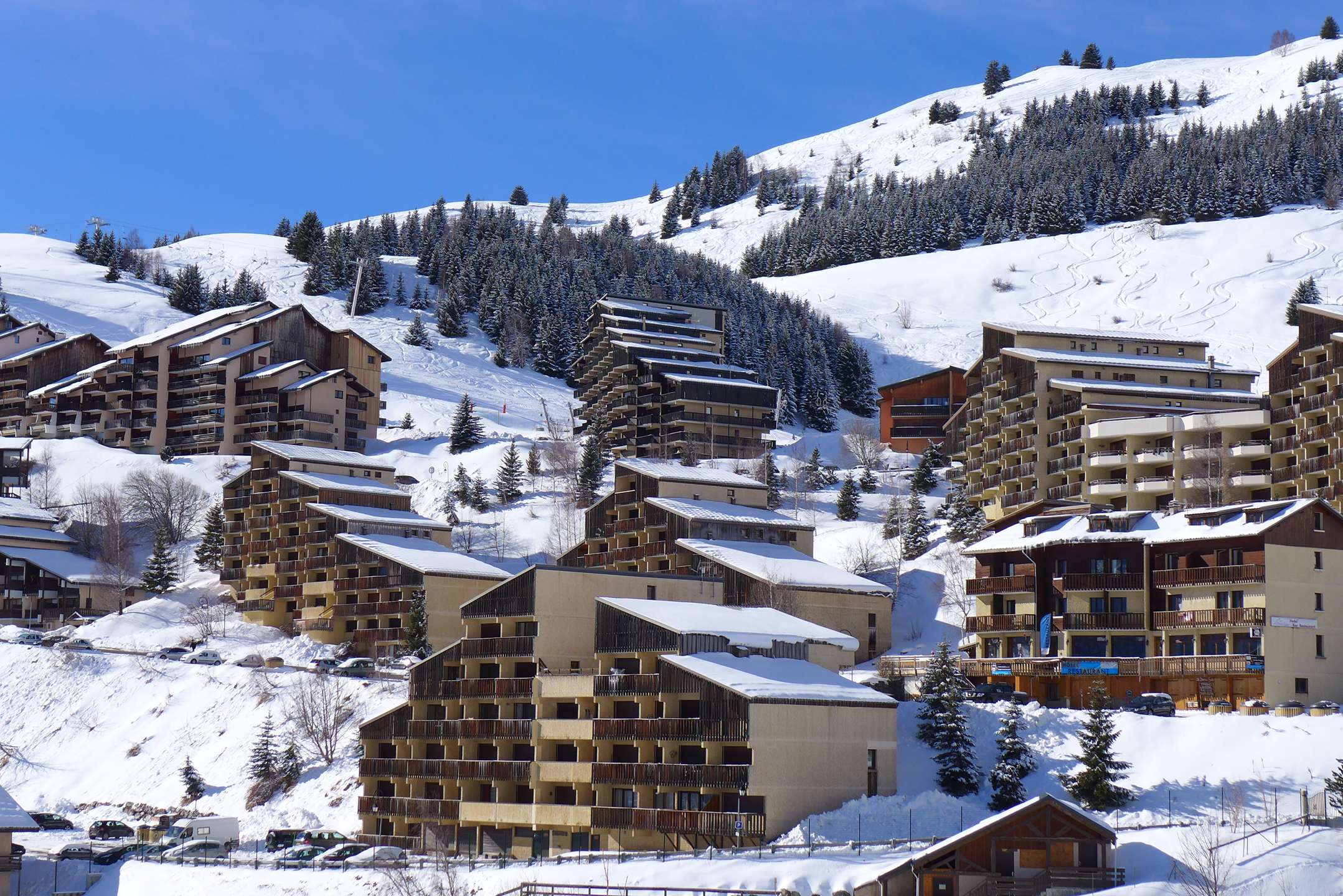 Résidence idéalement située à 150 mètres des pistes et des commerces. Elle dispose de casiers à skis attribués à chaque logement ainsi que d’un stationnement gratuit.