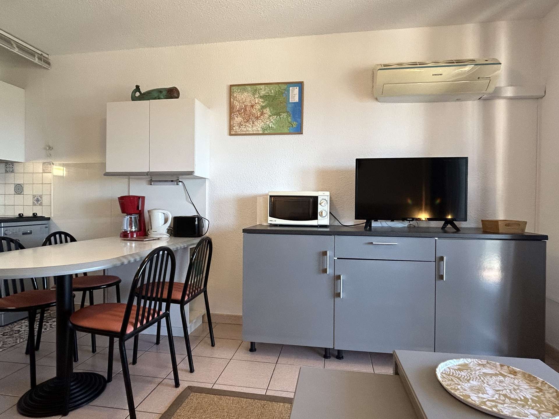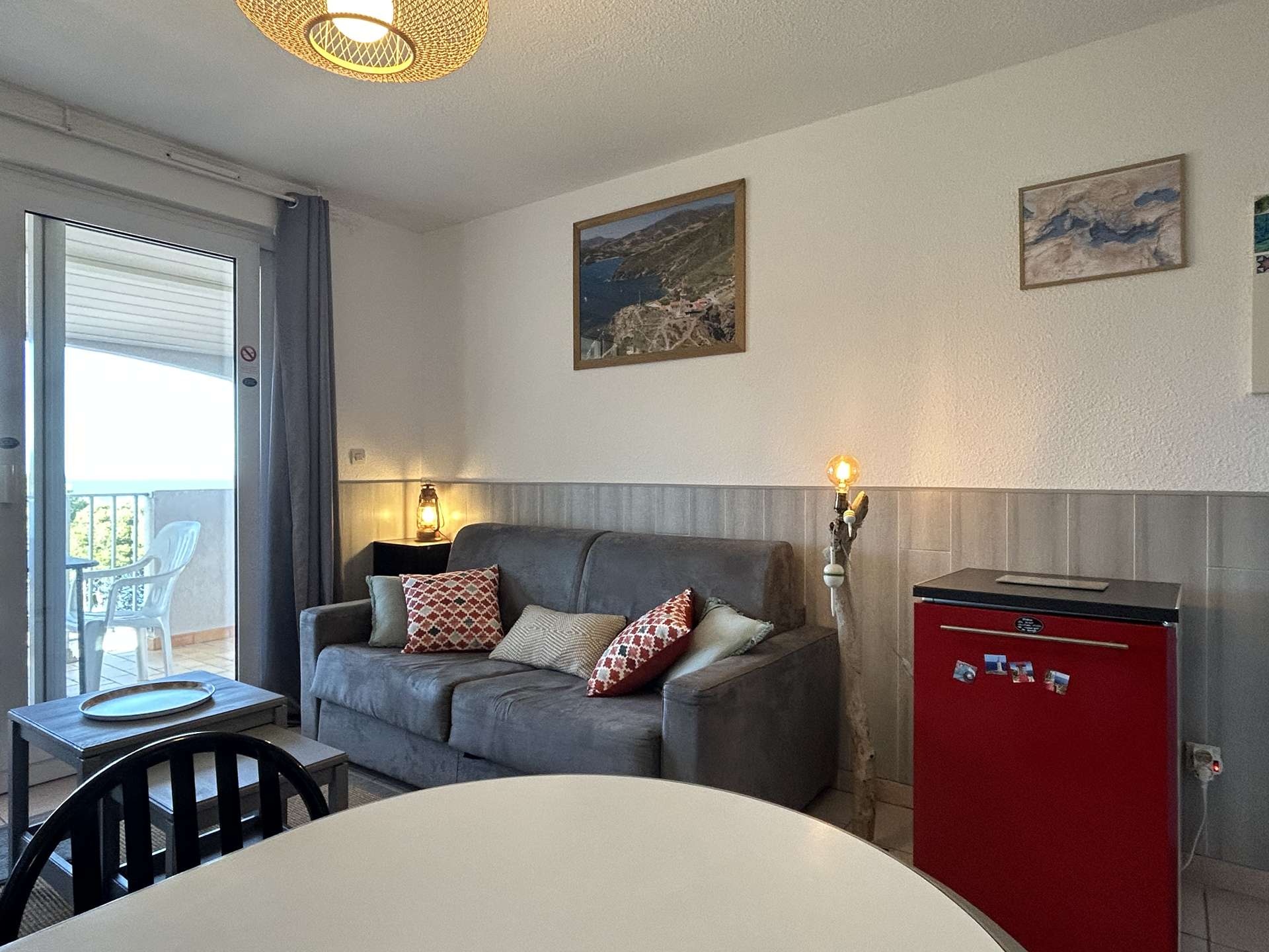 Cet appartement de vacances, situé au 2ème étage comprend : un séjour avec un canapé convertible 2 places (matelas bultex neuf remplacé en septembre 2024), une kitchenette, un coin cabine avec 2 lits superposés 1 place, une salle d'eau avec baignoire et wc et une terrasse équipée.
