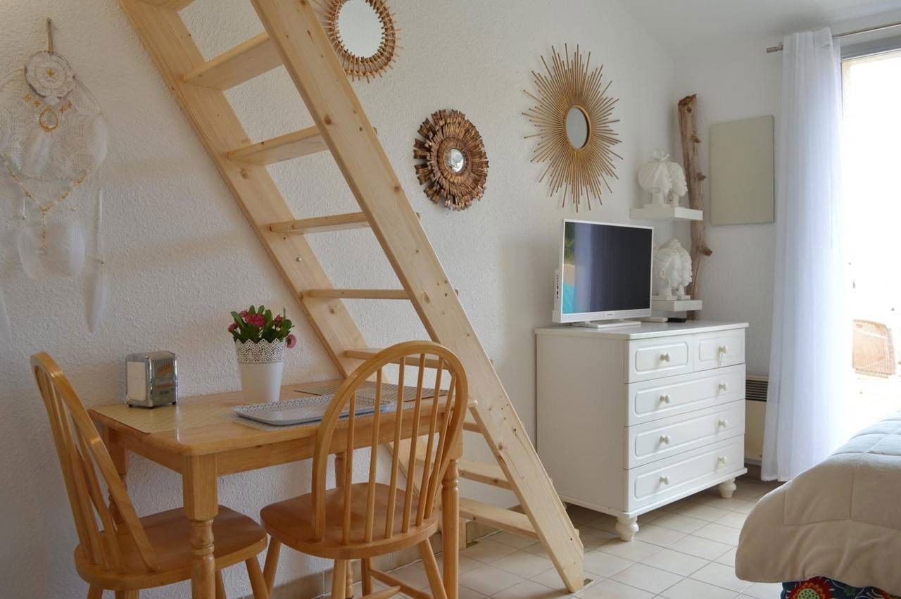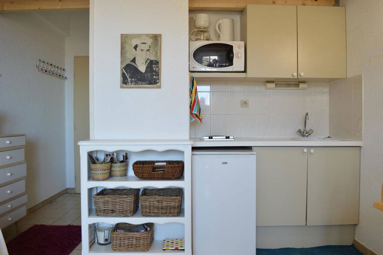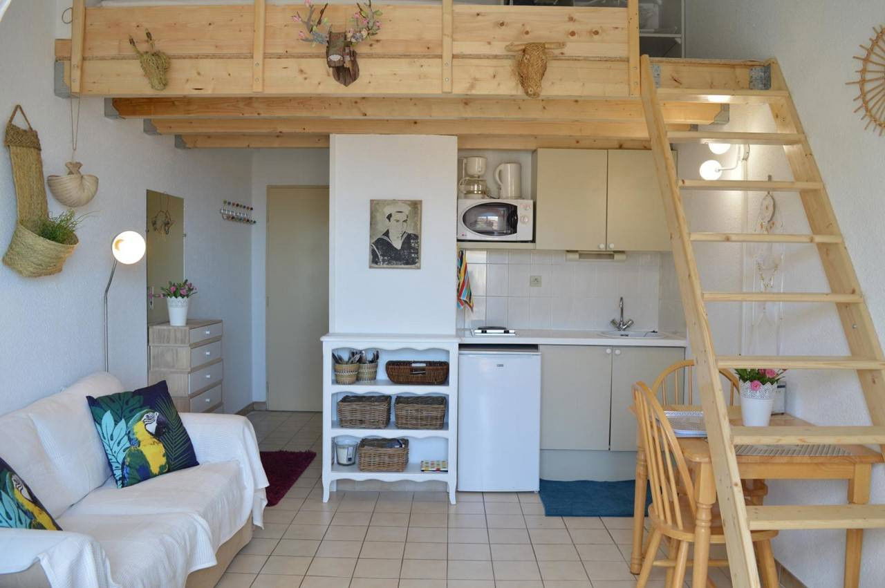 Cet appartement de vacances, situé au 2ème étage, se compose d'un séjour avec un lit pour deux personnes, un coin cuisine équipé, une mezzanine avec 1 lit double, une salle de douche avec wc.