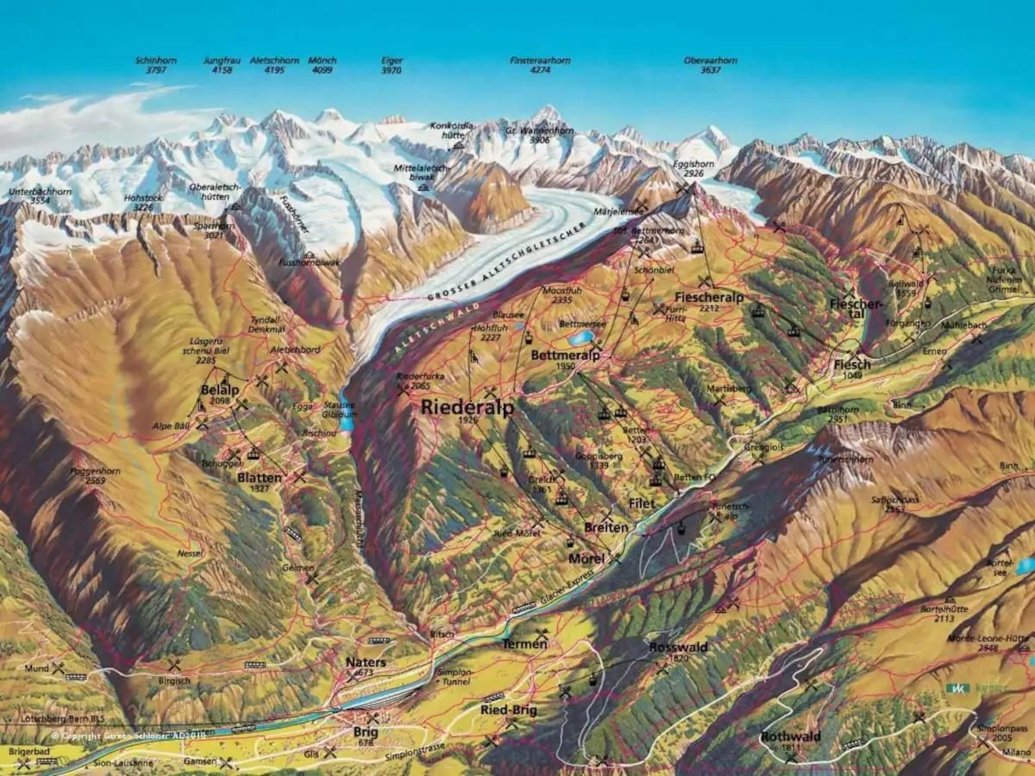 Il y a beaucoup d'autres stations de ski dans une excursion d'une journée (voir ci-dessus). À seulement un arrêt de Bellwald-Fürgangen sur le M. G. B., Fiesch est le premier point d'accès à l'Aletsch Arena avec le téléphérique jusqu'à Fiescheralp.