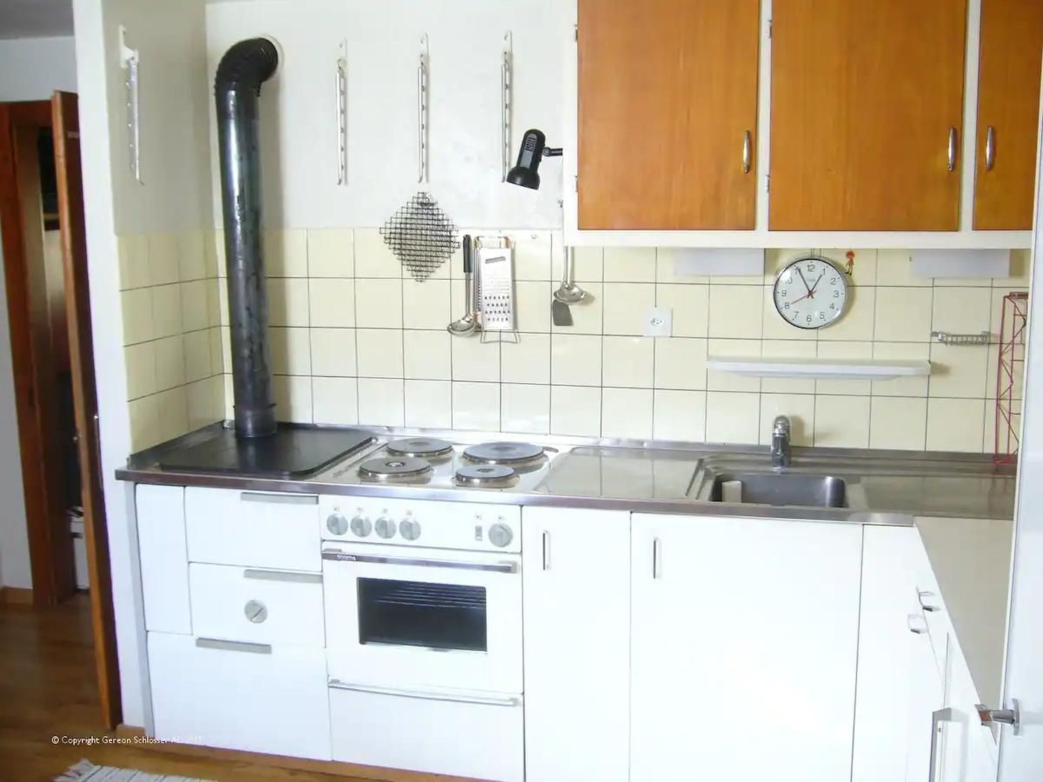Salle de bain spacieuse avec baignoire. Cuisine-séjour avec cuisinière électrique avec four (4 plaques de cuisson) et poêle à bois (une plaque de cuisson).