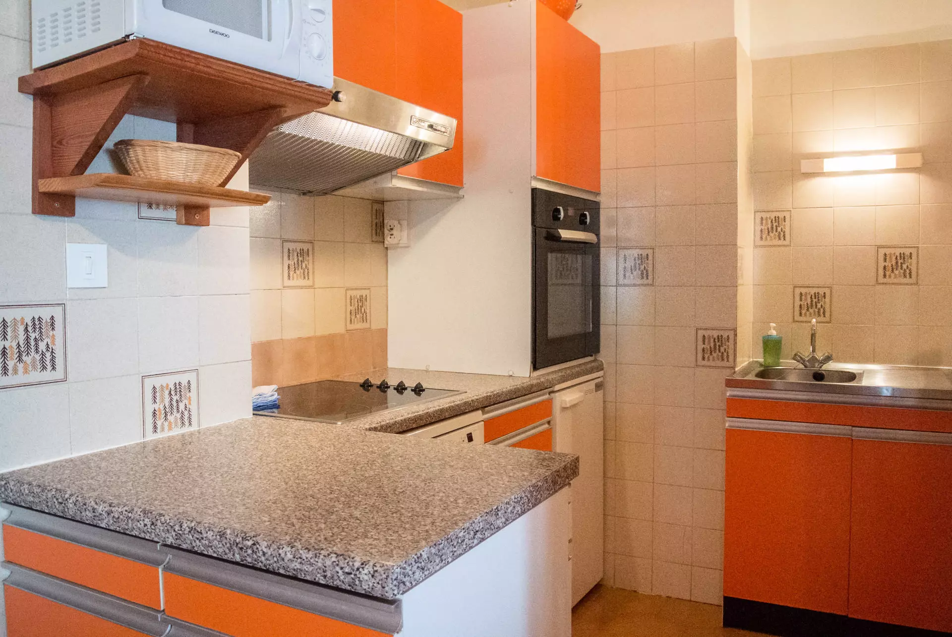 Equipements : Séjour avec coin cuisine équipé (plaques électriques, four, micro-ondes, lave-vaisselle, réfrigérateur, hotte aspirante) et coin salon avec TV écran plat. Accès WIFI gratuit.