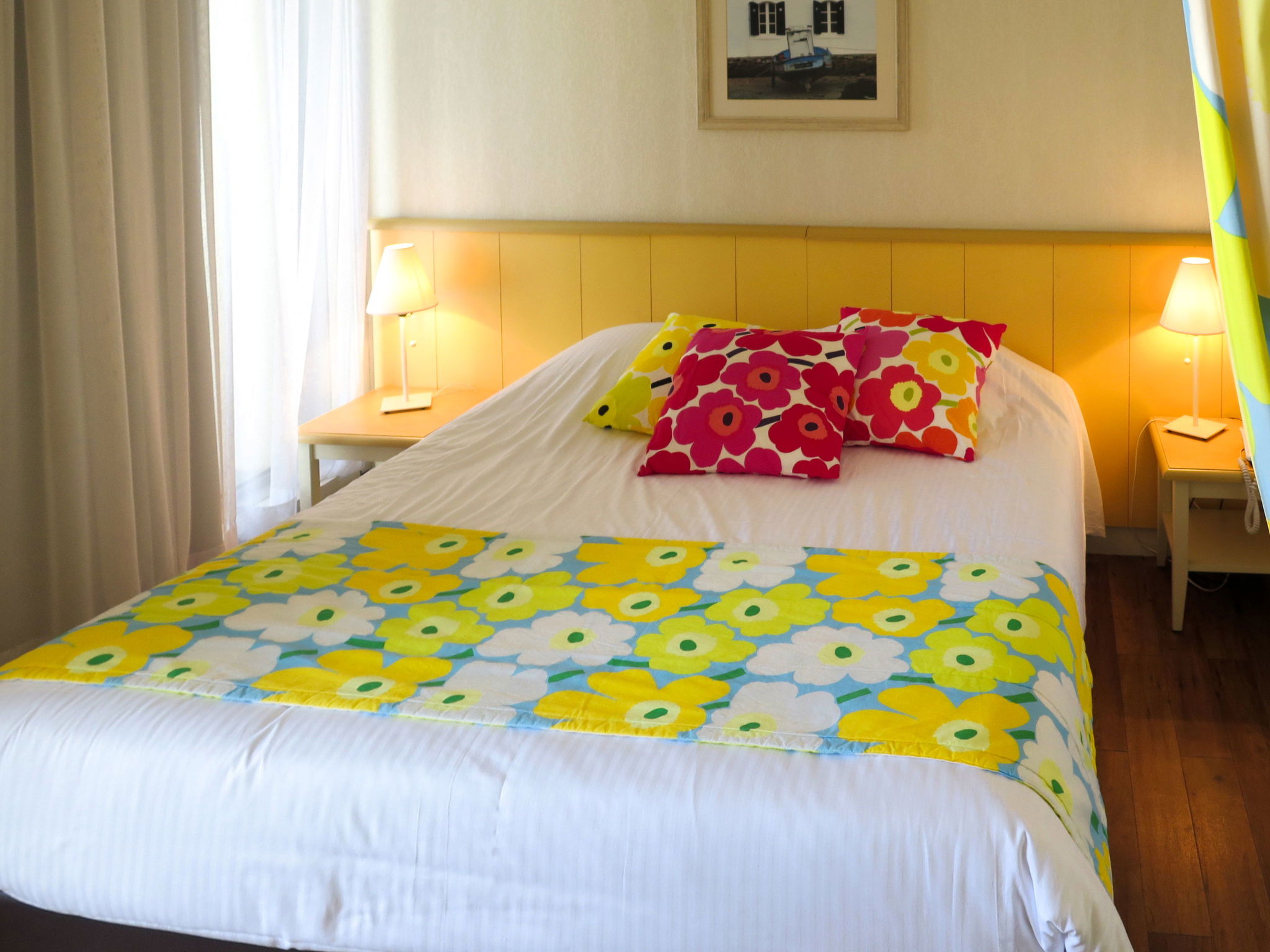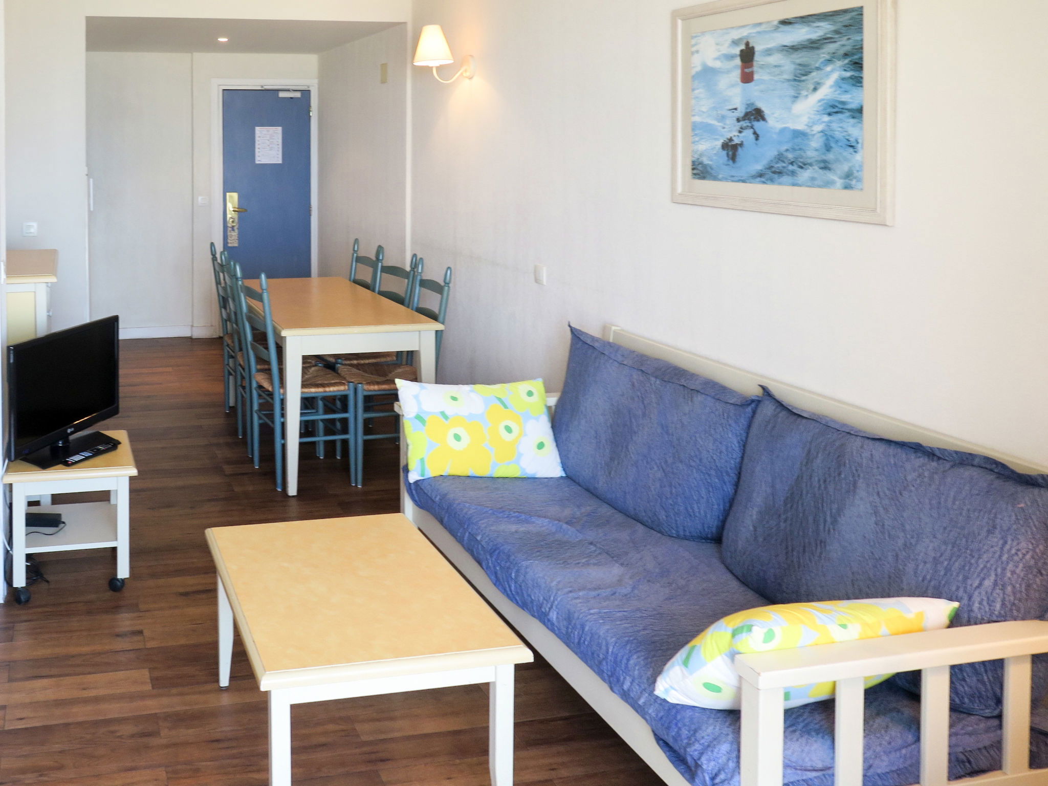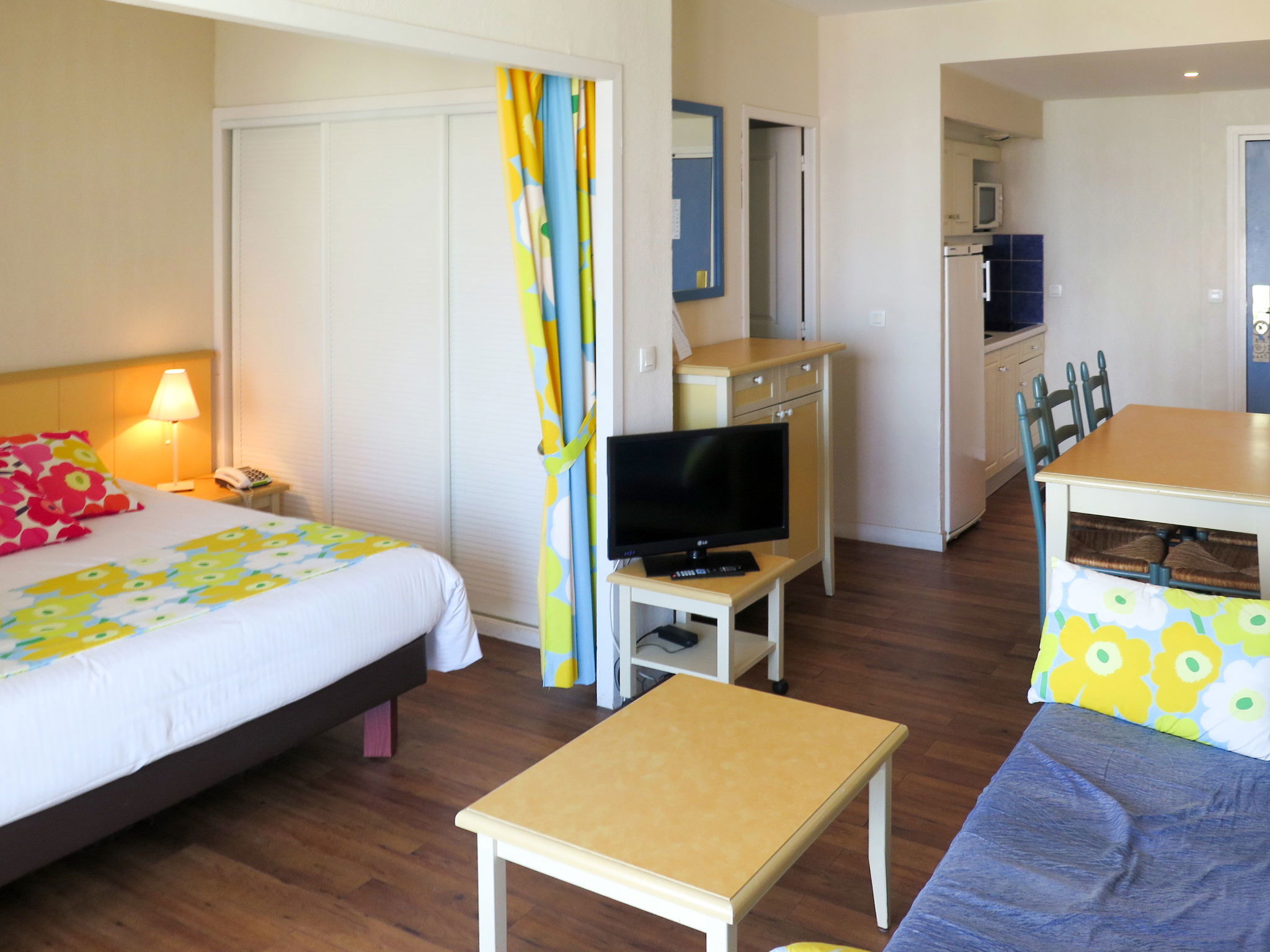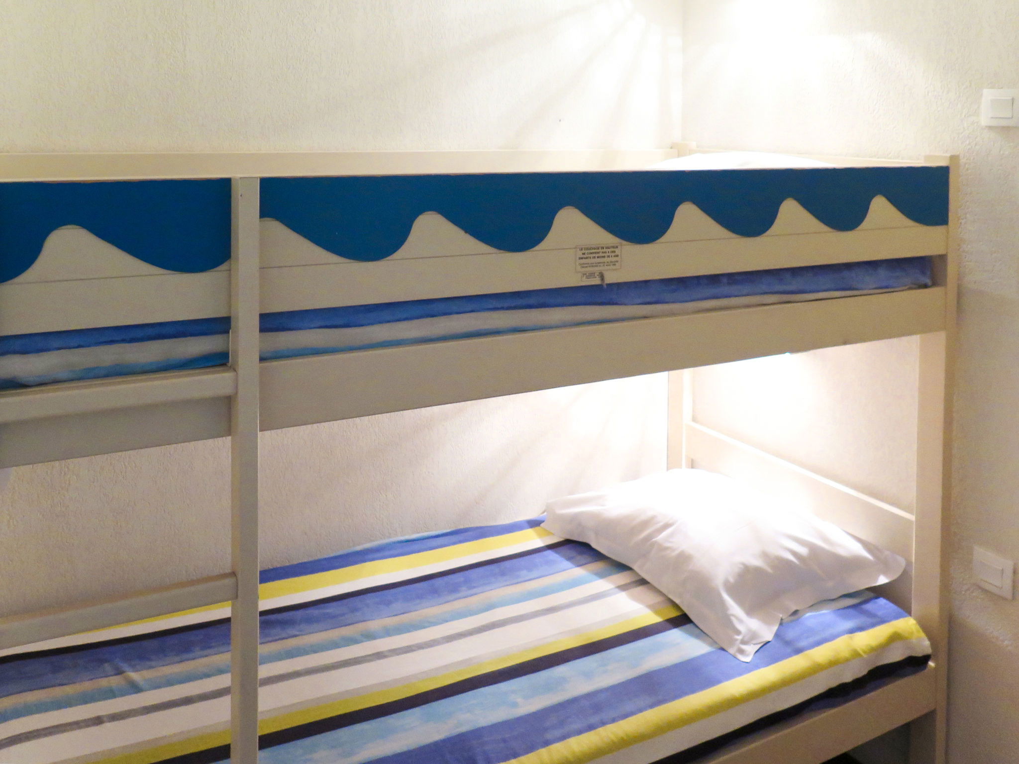 Aménagement fonctionnel: séjour/chambre à coucher avec rideau avec 1 grand-lit (160 cm), table pour les repas et TV. Sortie sur le balcon. 1 chambre avec 2 lits. Alcôve avec 1 x 2 lits superposés. Coin cuisine (4 plaques vitrocéramiques, four micro-ondes, cafetière électrique). Douche, WC séparé. Chauffage au fuel. Balcon. Mobilier de balcon. Belle vue sur la mer.