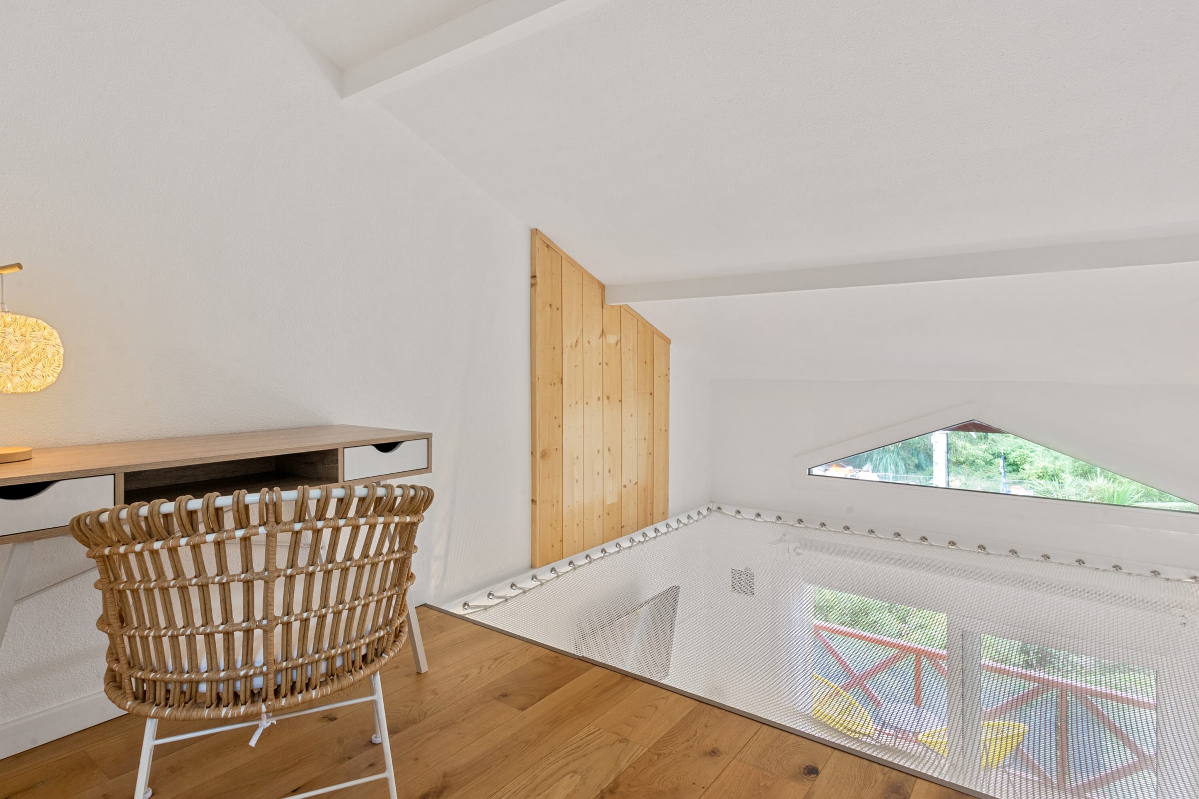 Ce duplex de 43 m² se trouve dans une petite résidence avec piscine et parking. Au premier et dernier étage (sans ascenseur), il profite d'une vue dégagée et vous propose :