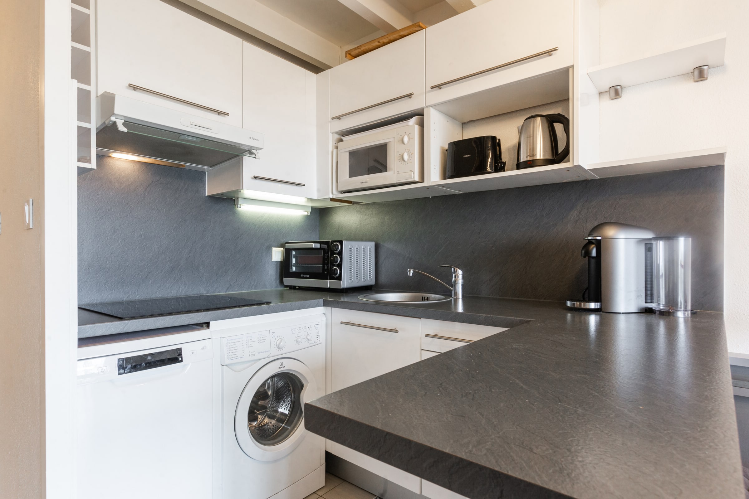 - une cuisine ouverte parfaitement équipée (bouilloire, machine à café, grille-pain, plaques de cuisson, micro-ondes, four, réfrigérateur et congélateur, lave-vaisselle),