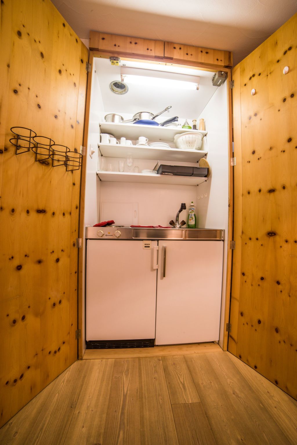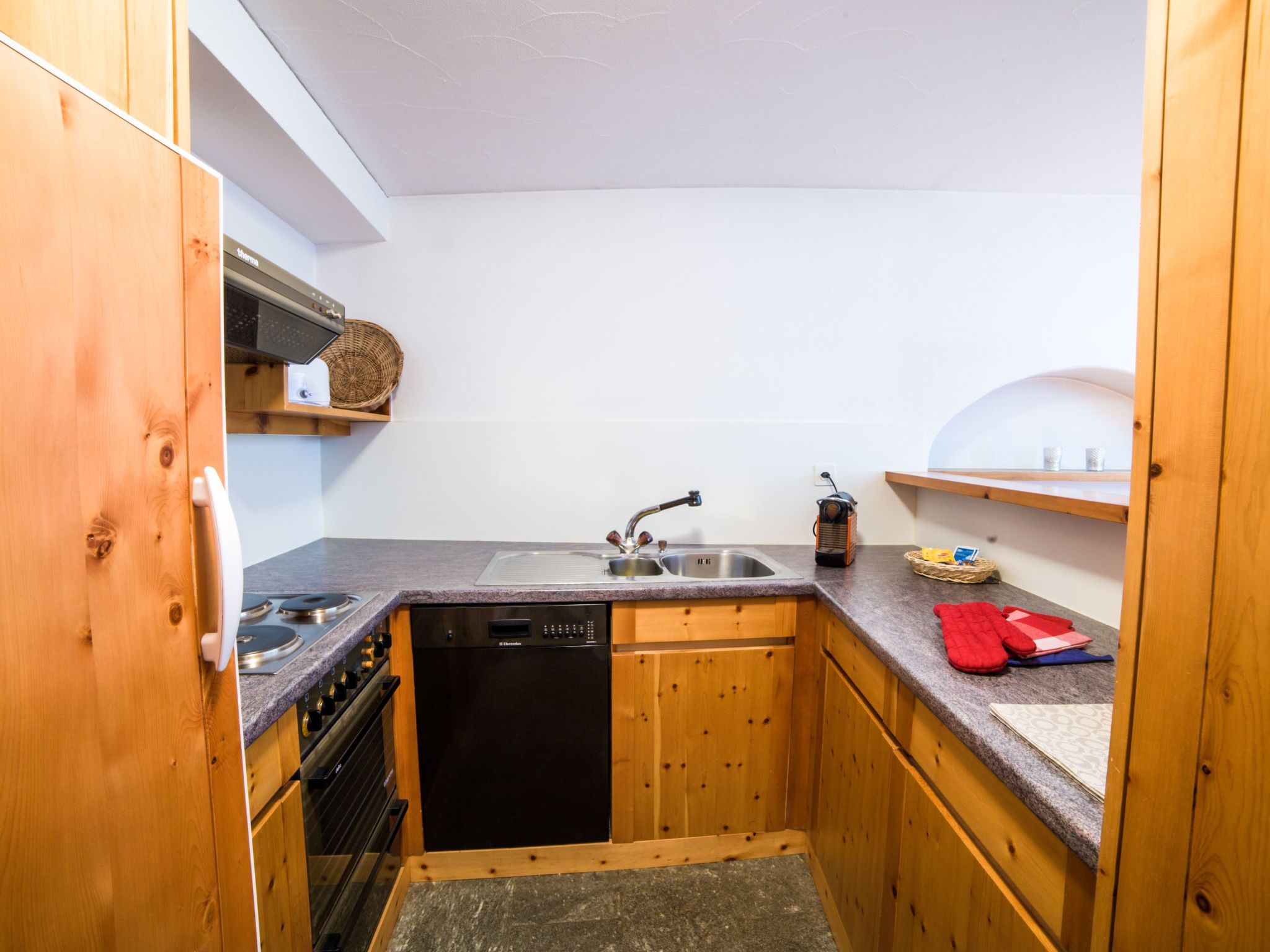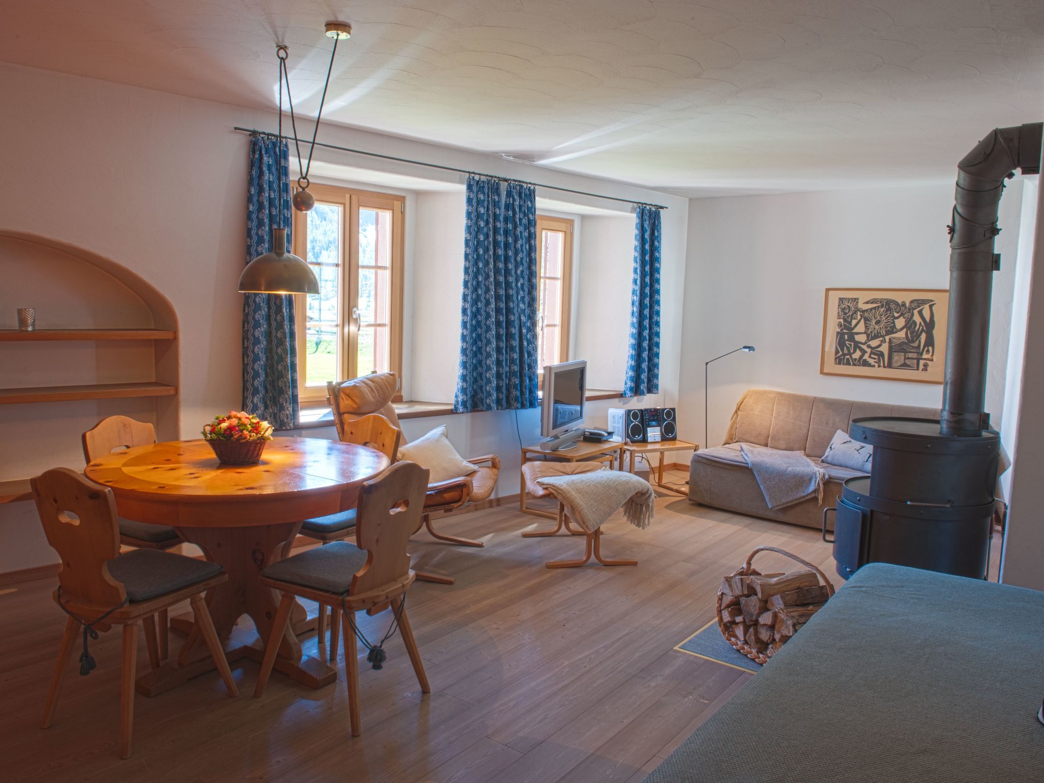 The apartment Roseg has an open living and dining area with a Swiss pine kitchen, equipped with a large refrigerator, oven, dishwasher and Nespresso machine. A Swedish stove provides a cozy atmosphere. Two additional beds are available in the living area. The separate bedroom is equipped with two single beds. The bathroom has a bathtub with shower attachment, toilet and sink.