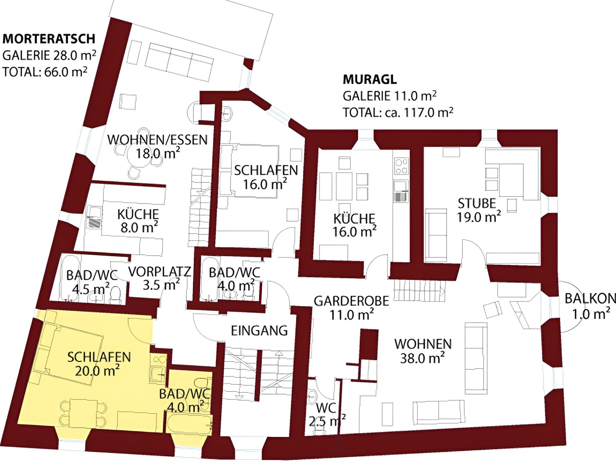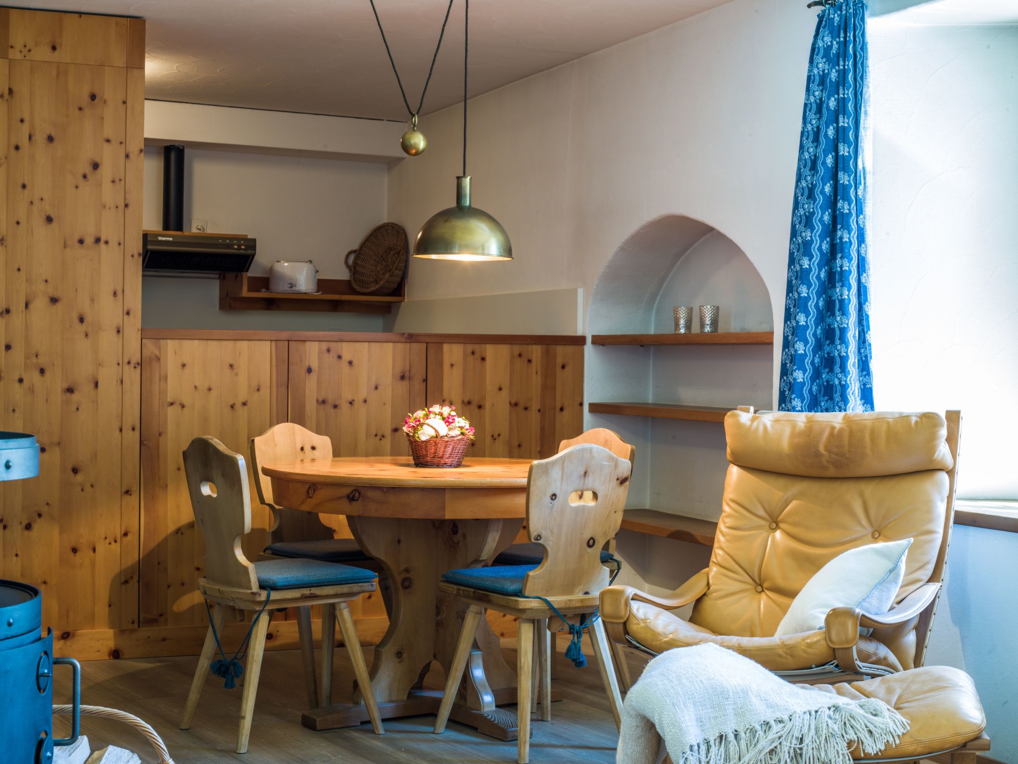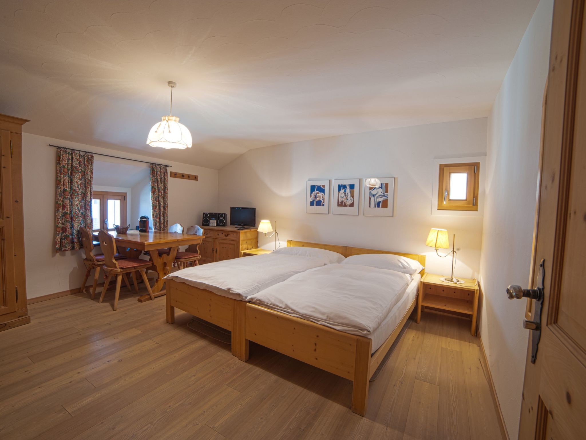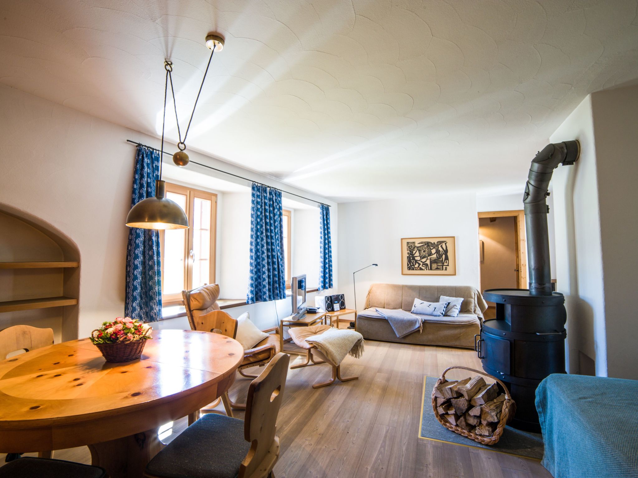 The combination is particularly suitable for families or groups who value time together and at the same time retreat opportunities. Parquet and floor slabs, underfloor heating and radiators ensure a pleasant indoor climate in both units. Historical photographs make reference to Bever and the Upper Engadin.