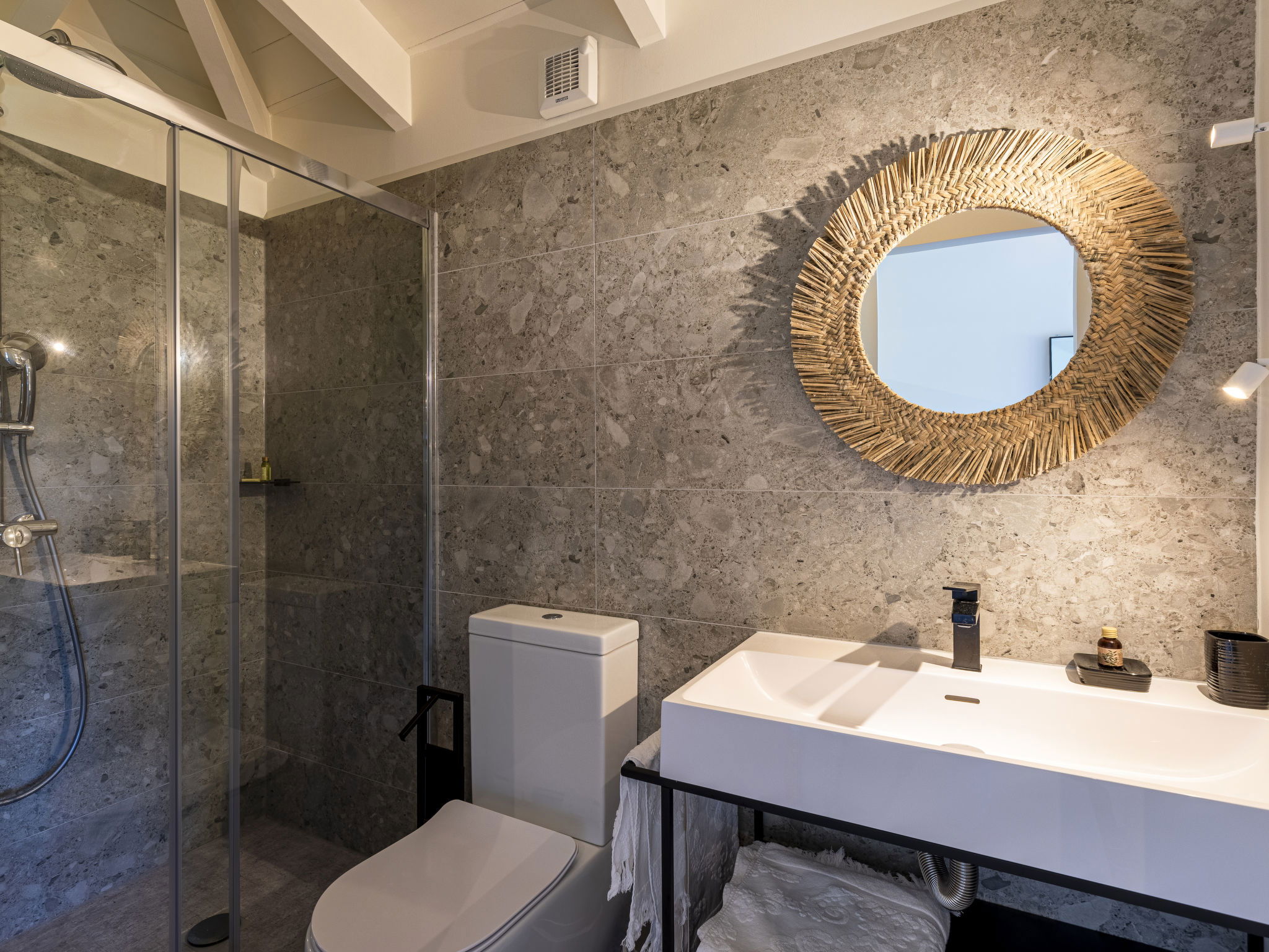 Sortie sur le jardin, sur la terrasse, sur la piscine. 1 chambre avec 1 x 2 lits superposés (90 cm, longueur 190 cm). Cuisine ouverte (four, lave-vaisselle, 4 plaques à induction). Douche/WC. Air-conditionné. Petite terrasse 4 m2. Meubles de terrasse, chaises longues (2).