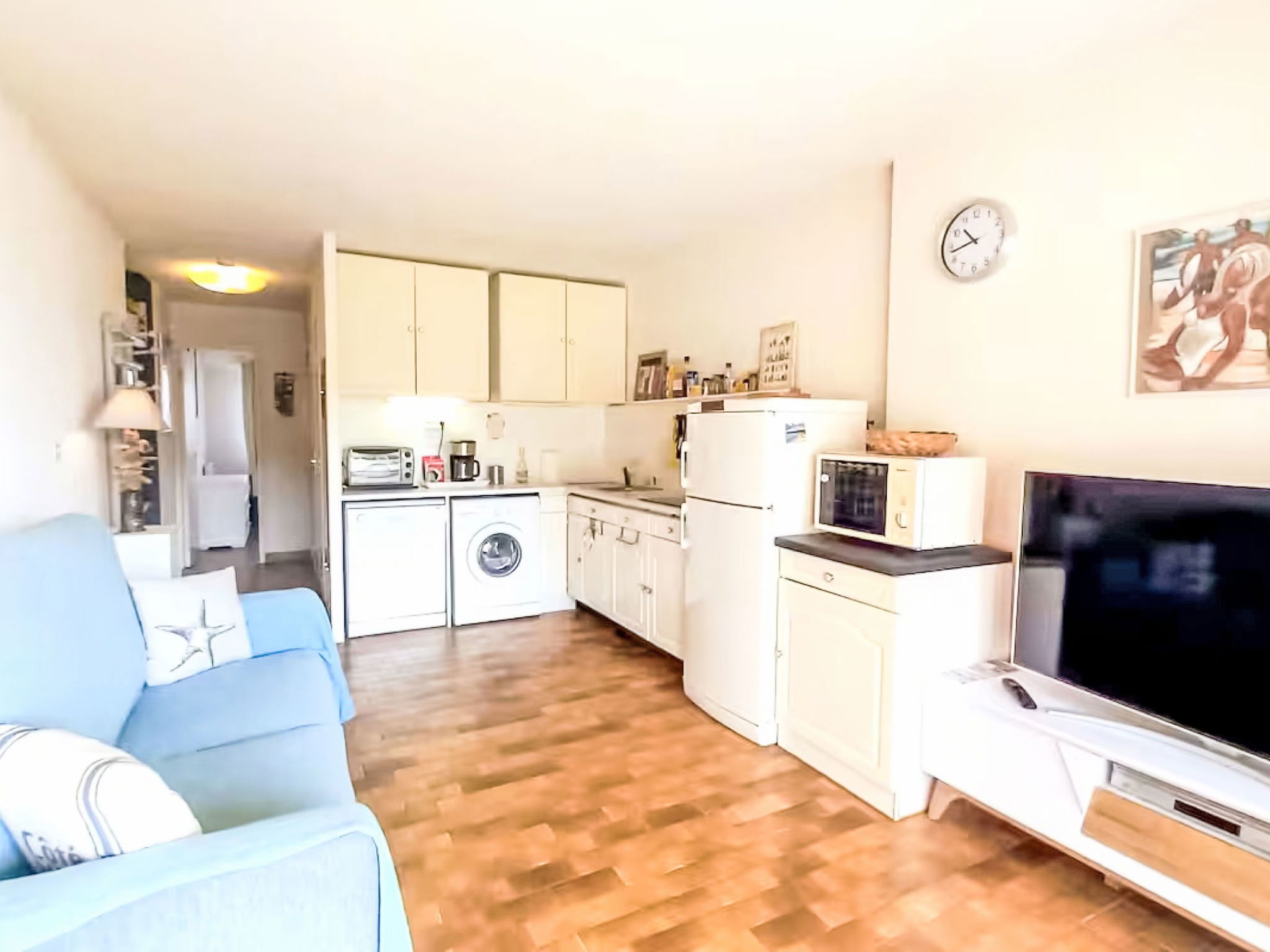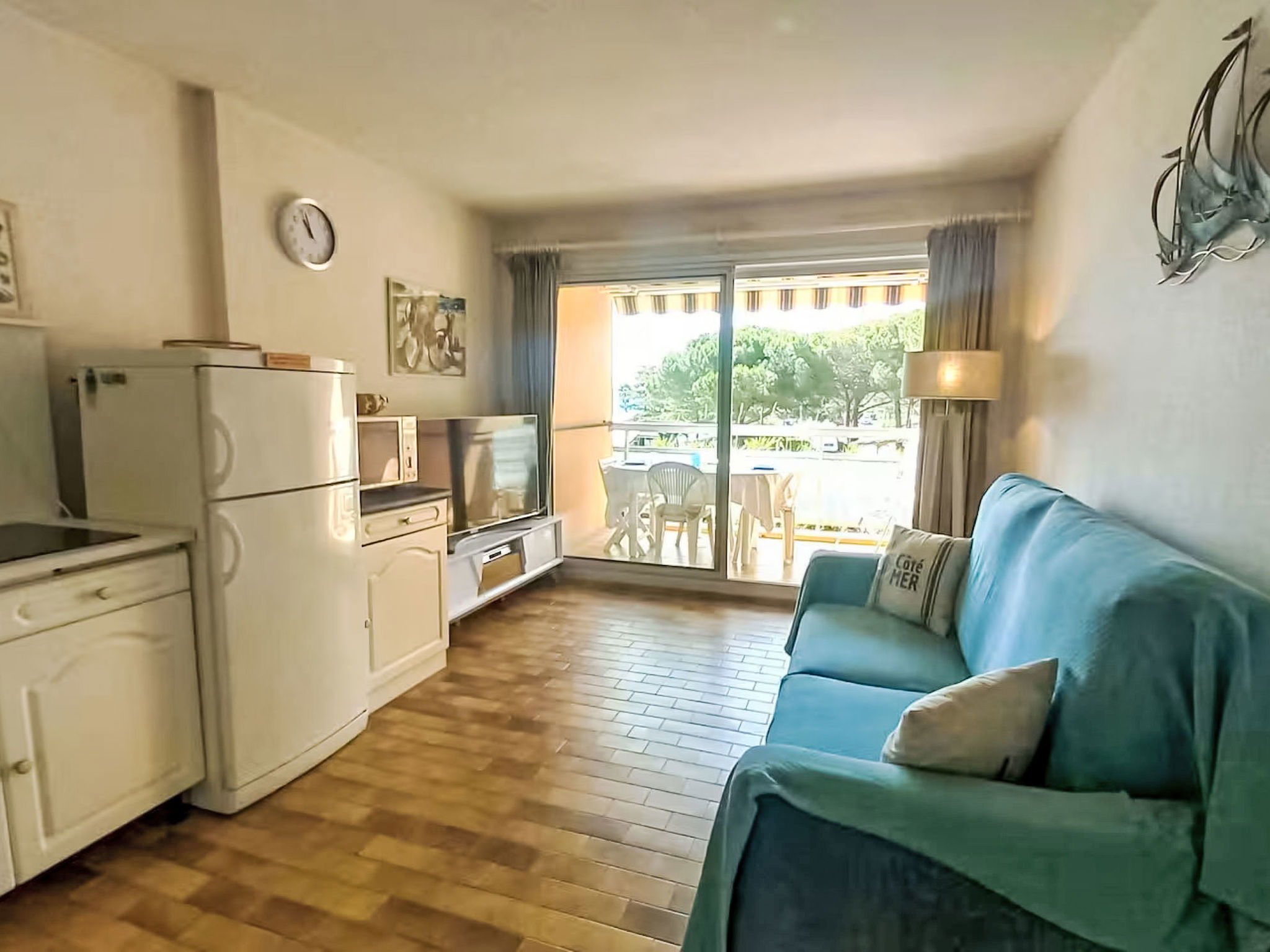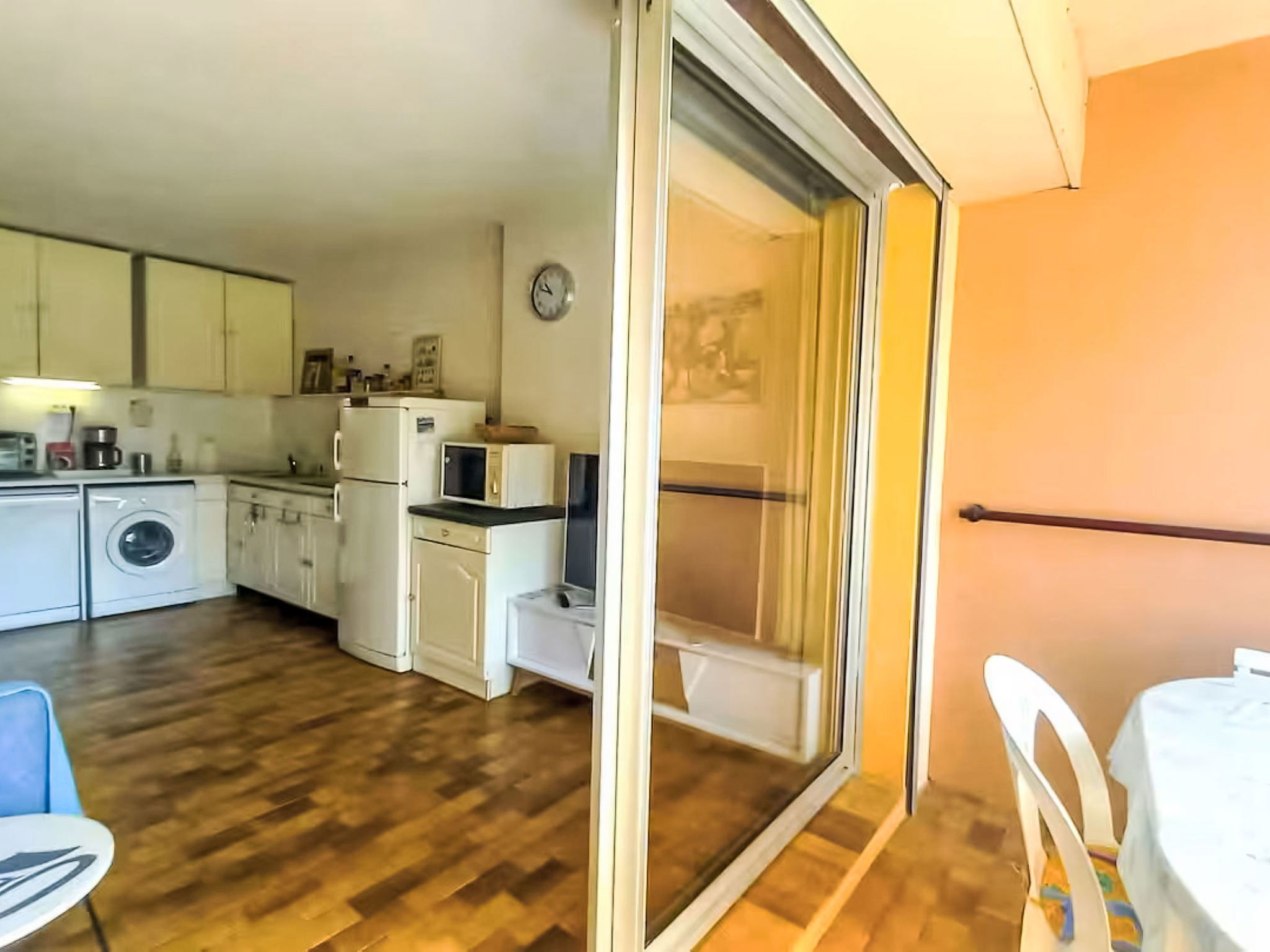 Appartement de 2 pièces 35 m2 au 1er étage. Séjour/salle à manger avec 1 divan-lit double (140 cm, longueur 190 cm), TV (écran plat). Sortie sur le balcon. 1 chambre avec 1 grand-lit (140 cm, longueur 190 cm). Coin cuisine (mini-four, lave-vaisselle, 4 plaques vitrocéramiques, grille-pain, bouilloire électrique, micro-ondes, congélateur, cafetière électrique). Salle de bains, WC séparé. Balcon 7 m2. Vue sur la mer. A disposition: lave-linge. Internet (Connexion WIFI, en sus). Garage No 270, hauteur 180 cm, largeur 210 cm. Veuillez noter: logement non-fumeur. 1 animal/ chien autorisé. TV seulement FR. Détecteur de fumée. Annonce d'un professionnel (art 155, IV du CGI) 83019001992T0