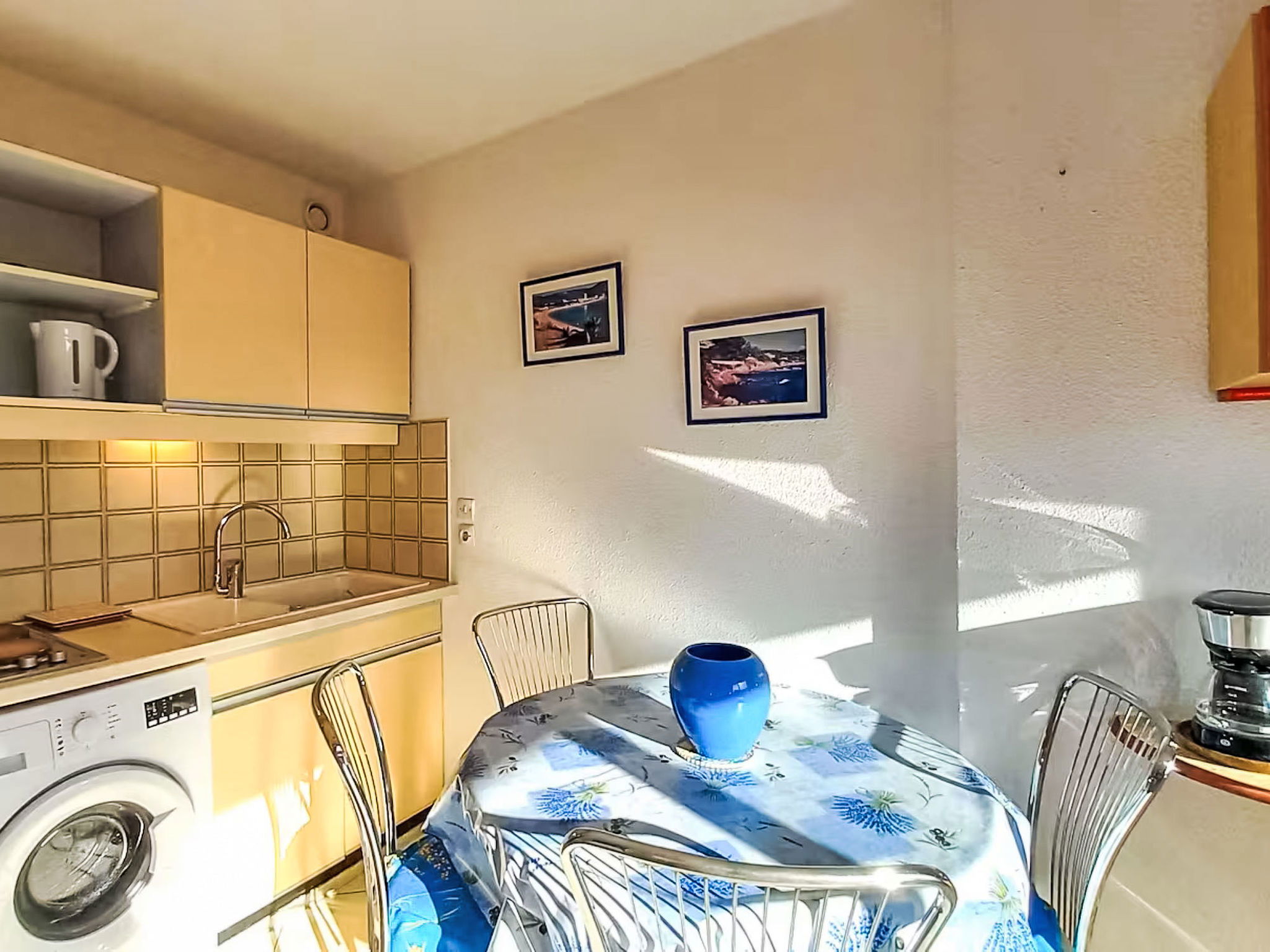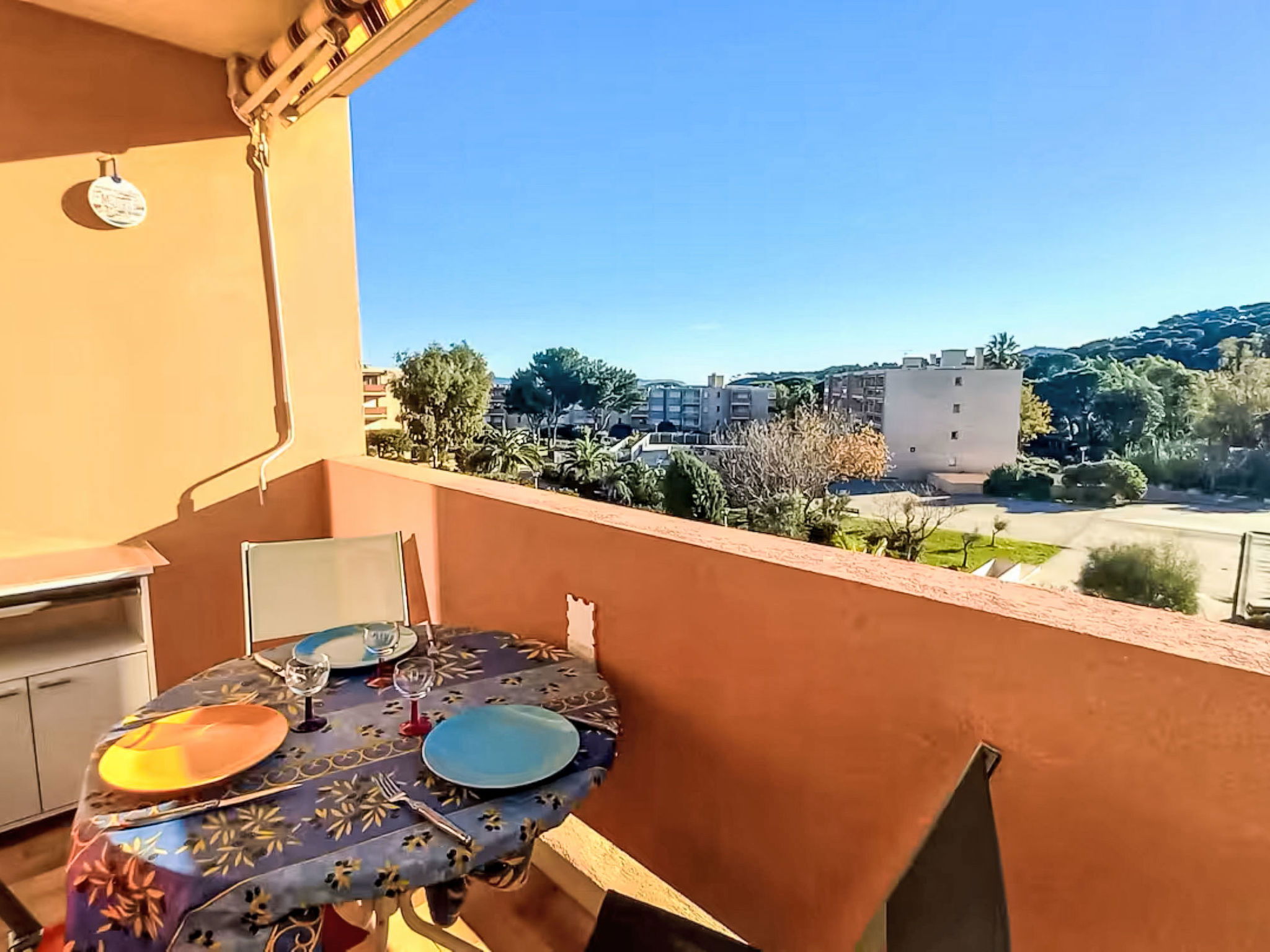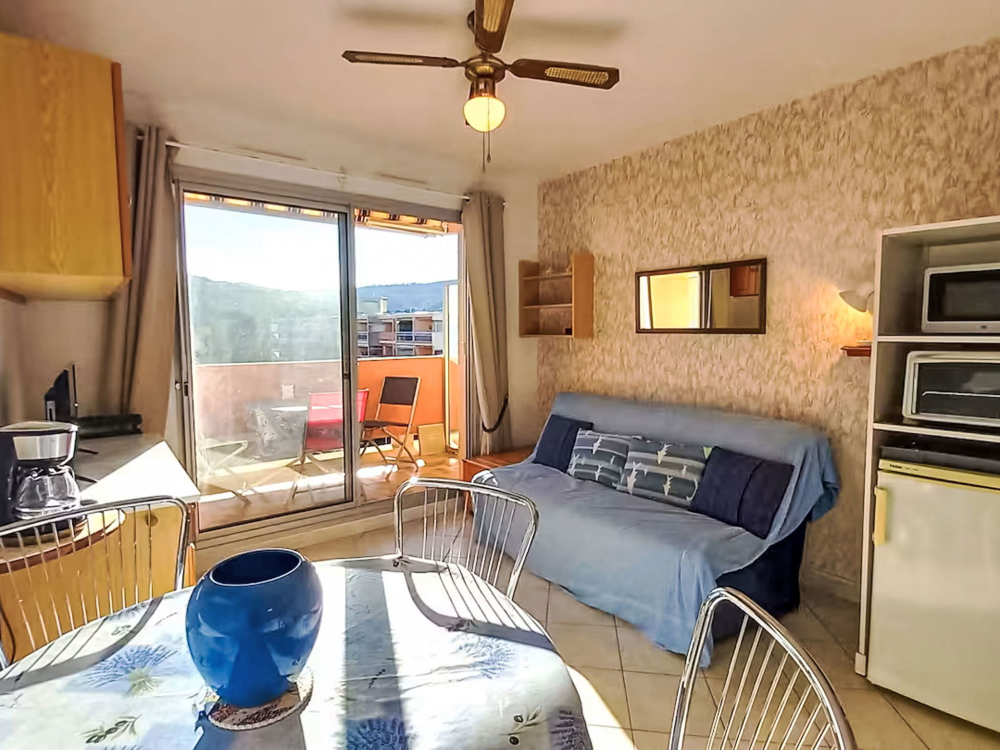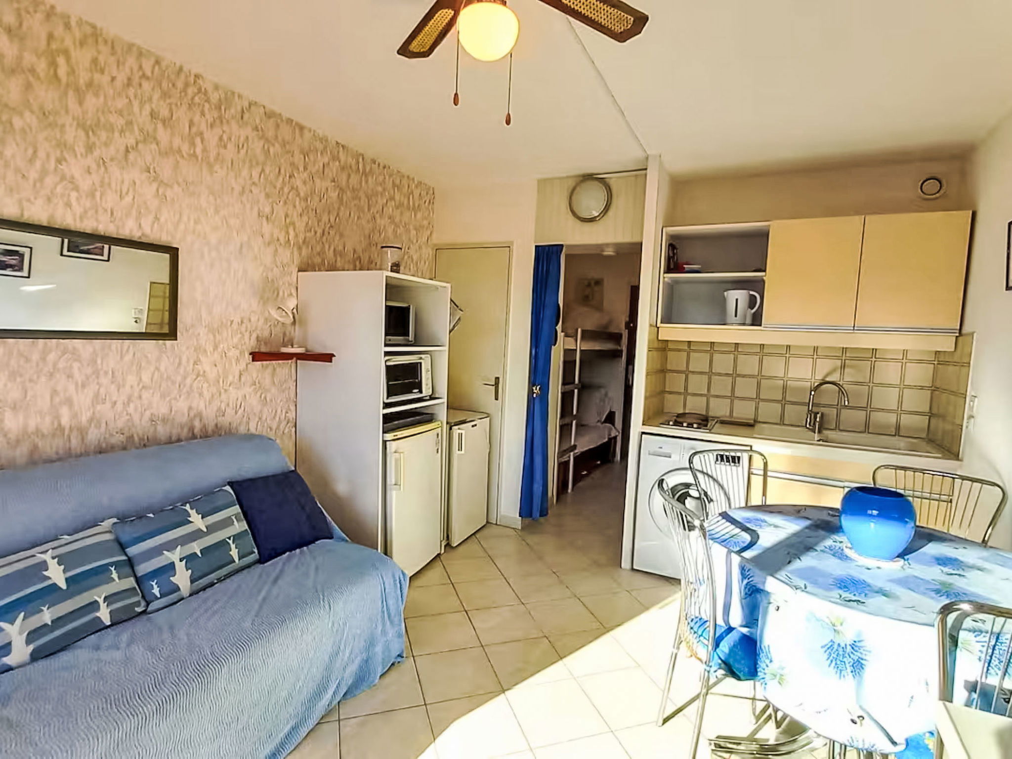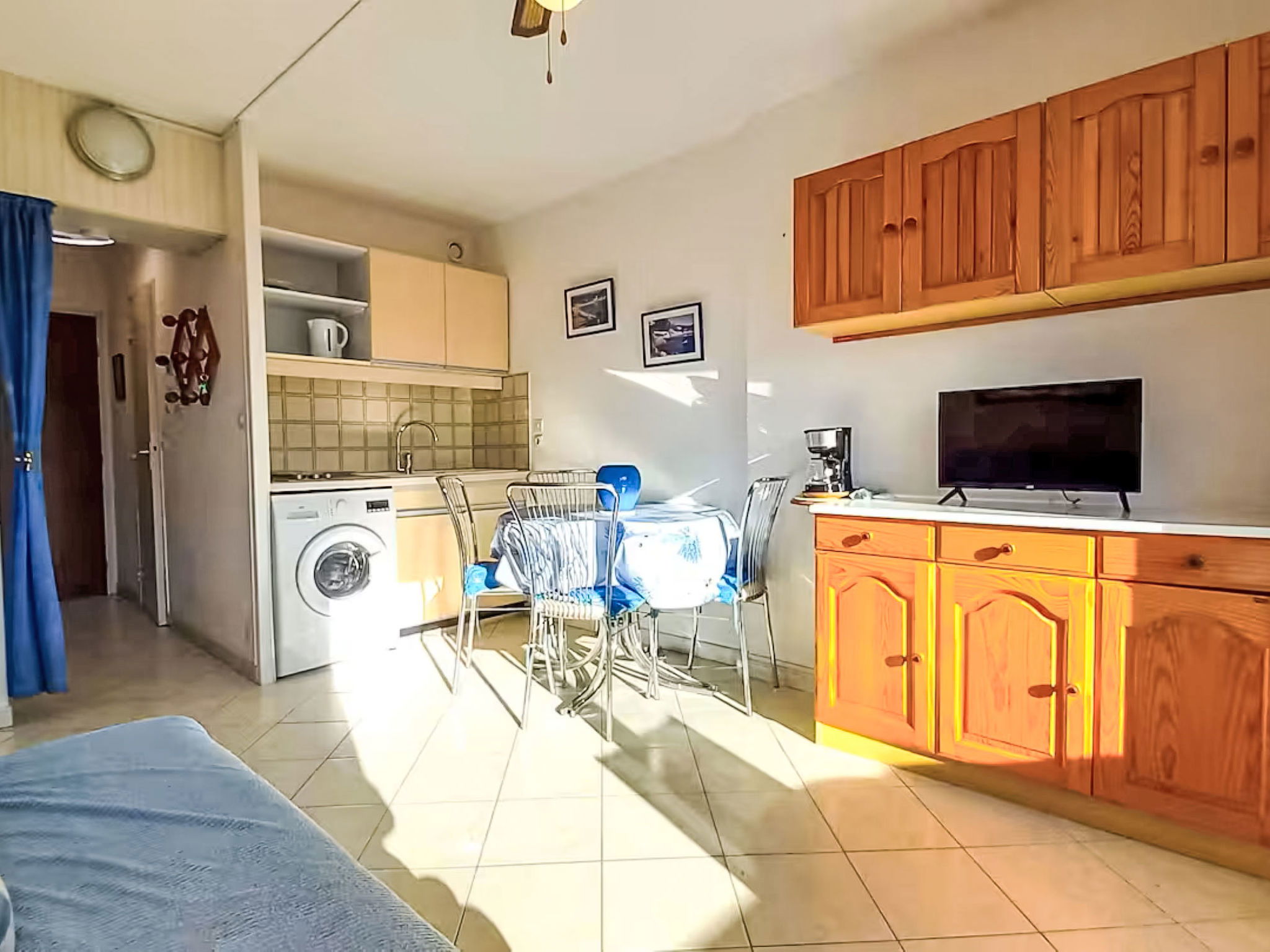 Studio 24 m2 au 3ème étage. Logement idéal pour 2 adultes + 2 enfants. Aménagement simple: séjour/salle à manger avec rideau avec 1 divan-lit double (140 cm, longueur 190 cm), TV et ventilateur. Sortie sur le balcon. Entrée avec 1 x 2 lits superposés (80 cm, longueur 190 cm). Coin cuisine (2 plaques de cuisson, mini-four, grille-pain, bouilloire électrique, micro-ondes, cafetière électrique). Bain/WC. Balcon. Mobilier de balcon. A disposition: lave-linge. Internet (Connexion WIFI, en sus). Garage No 102, hauteur 180 cm, largeur 210 cm. Veuillez noter: maximum 1 animal/ chien de petite taille autorisé. Détecteur de fumée. Annonce d'un particulier (art 155, IV du CGI). 83019001029PK