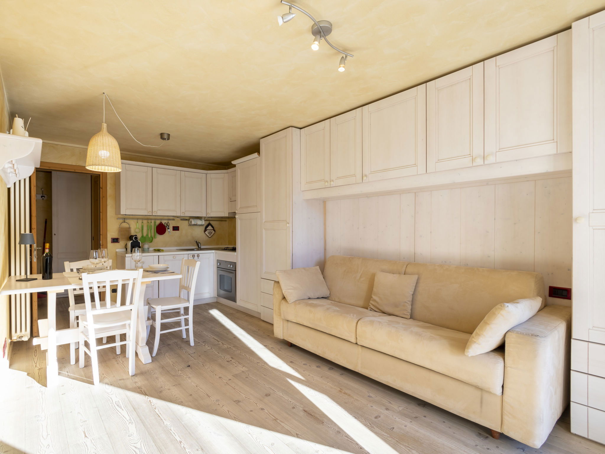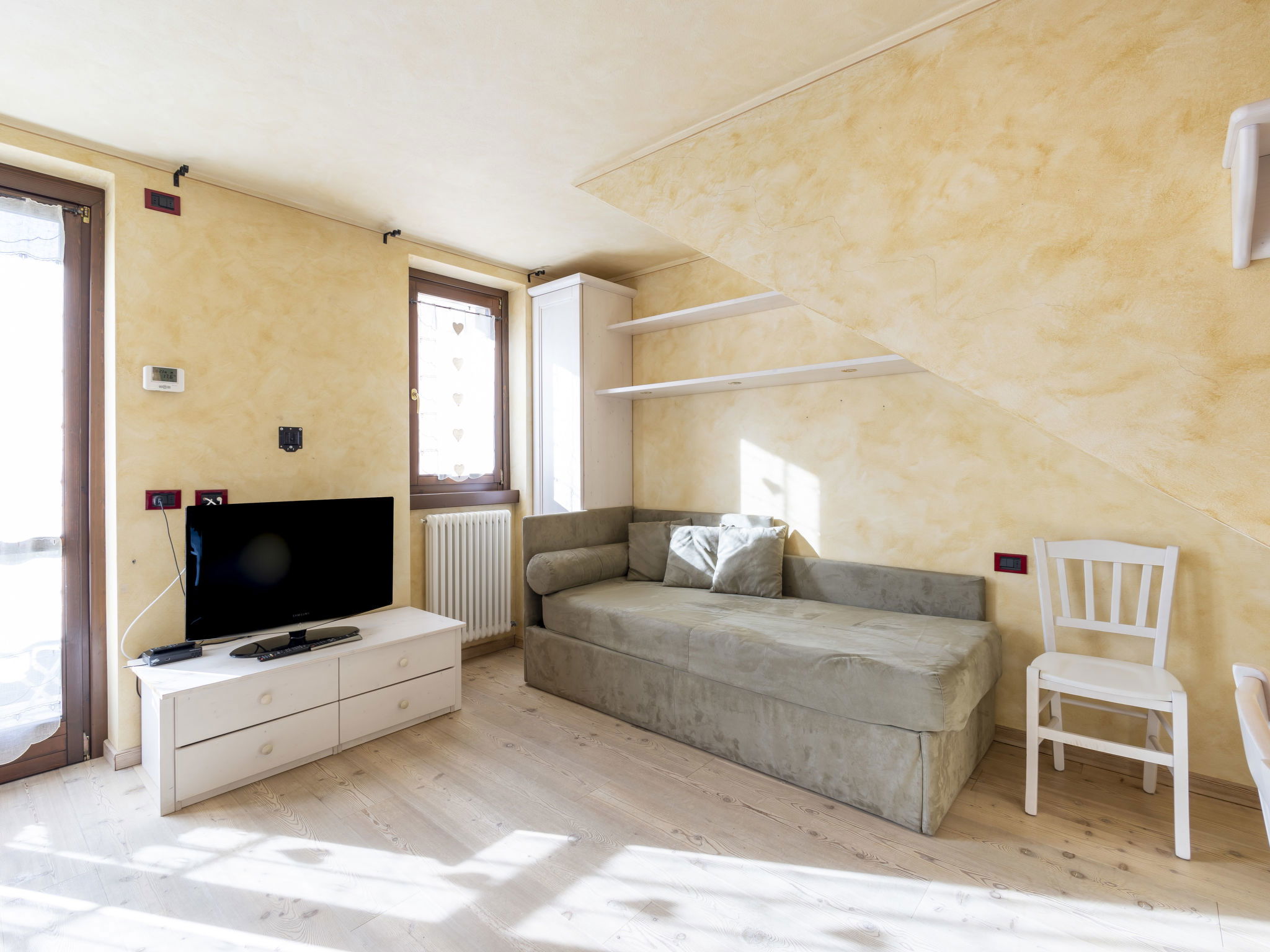 Studio 38 m2 au 1er étage. Aménagement fonctionnel et confortable: séjour/salle à manger avec 1 divan-lit double, table pour les repas et TV. Sortie sur le balcon. Coin cuisine (4 plaques de cuisson, four, lave-vaisselle, grille-pain, bouilloire électrique, micro-ondes, cafetière électrique, Capsules pour machine à café (Nescafè Dolcegusto) inclus). Douche/bidet/WC. Sol en parquet. 2 balcons. Mobilier de balcon. Vue sur les montagnes et la ville. A disposition: chaise haute pour enfant, lit bébé, sèche-cheveux. Internet (Connexion WIFI, gratuit). Veuillez noter: adapté(e) aux familles. Logement non-fumeur pas de parking. Maximum 1 animal/ chien autorisé. IT014009B4EVT3NEMU