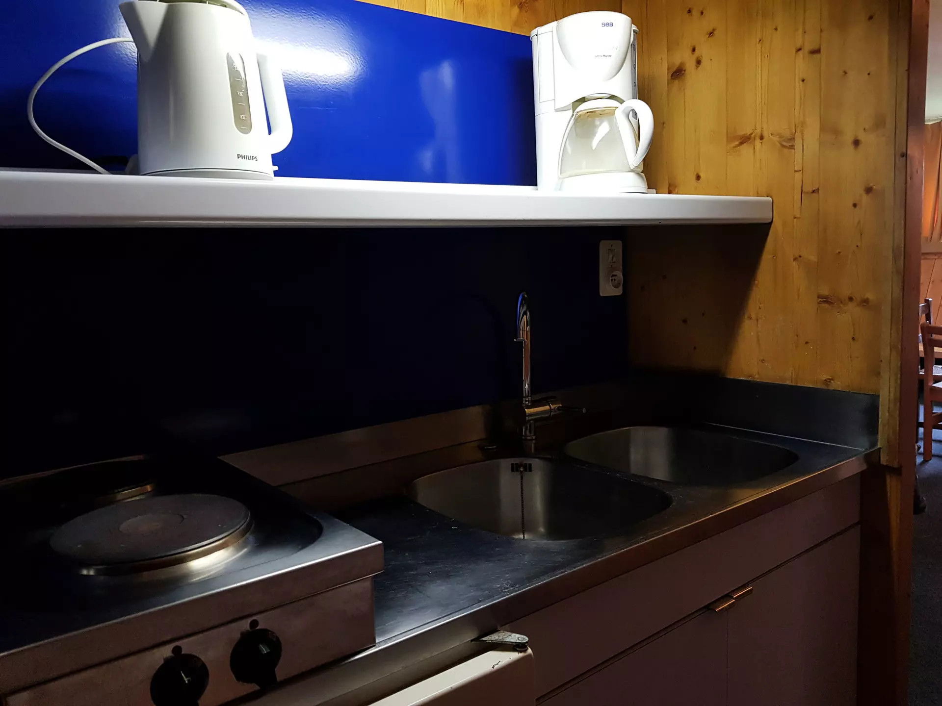Il est équipé de plaques électriques, d'un four, d'un four micro-ondes et d'un réfrigérateur