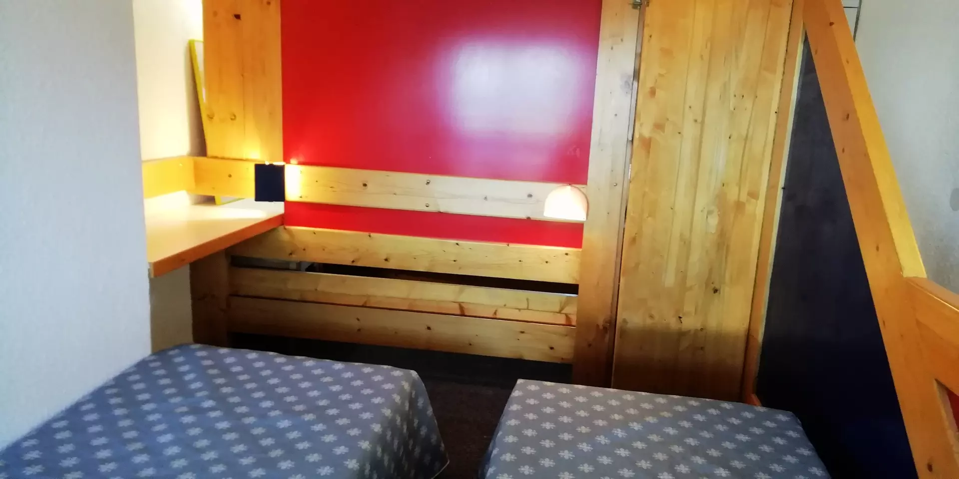2 espaces couchage sont séparés par une porte : le premier avec 1 lit double en 160x190 cm et le second avec 2 lits simples en 80x190 cm.