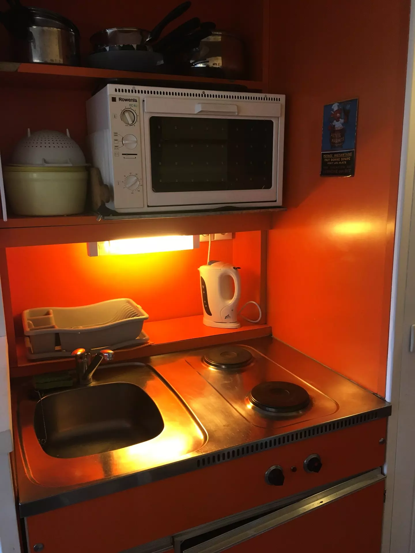 Elle est entièrement équipée avec des plaques électriques, un four, un réfrigérateur, un grille-pain, une bouilloire, une cafetière, et un micro-onde.
