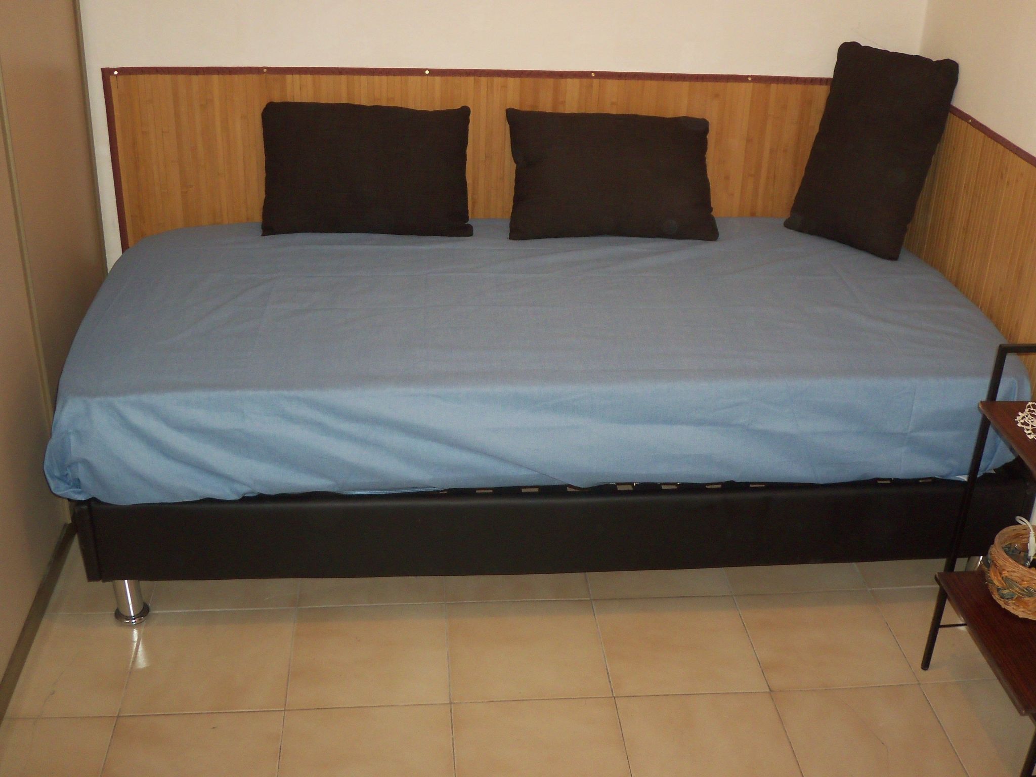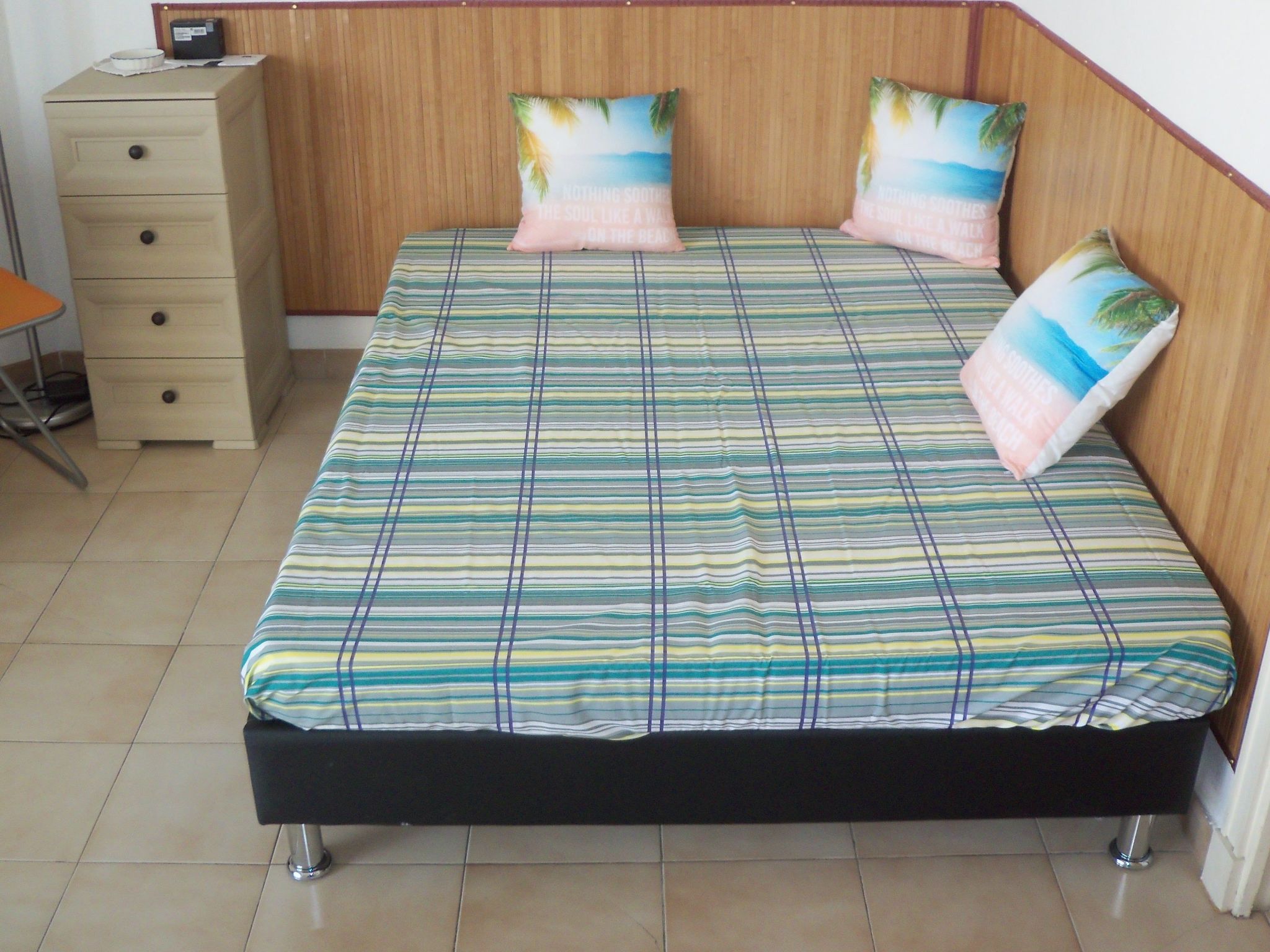 The studio consists of an entrance hall with a wardrobe/wardrobe and a single bed and a living room with a kitchenette equipped with a 4-burner electric cooker, oven, blender, toaster, refrigerator and dishwasher. The living/sleeping area of the studio offers a dining area with a table and four chairs, a TV with DVD player and a radio. There is also a double bed (140 cm wide) and a sofa bed for one person. Air conditioning (hot/cold) is also available. There is a bathroom with a bath and washing machine and a separate toilet.