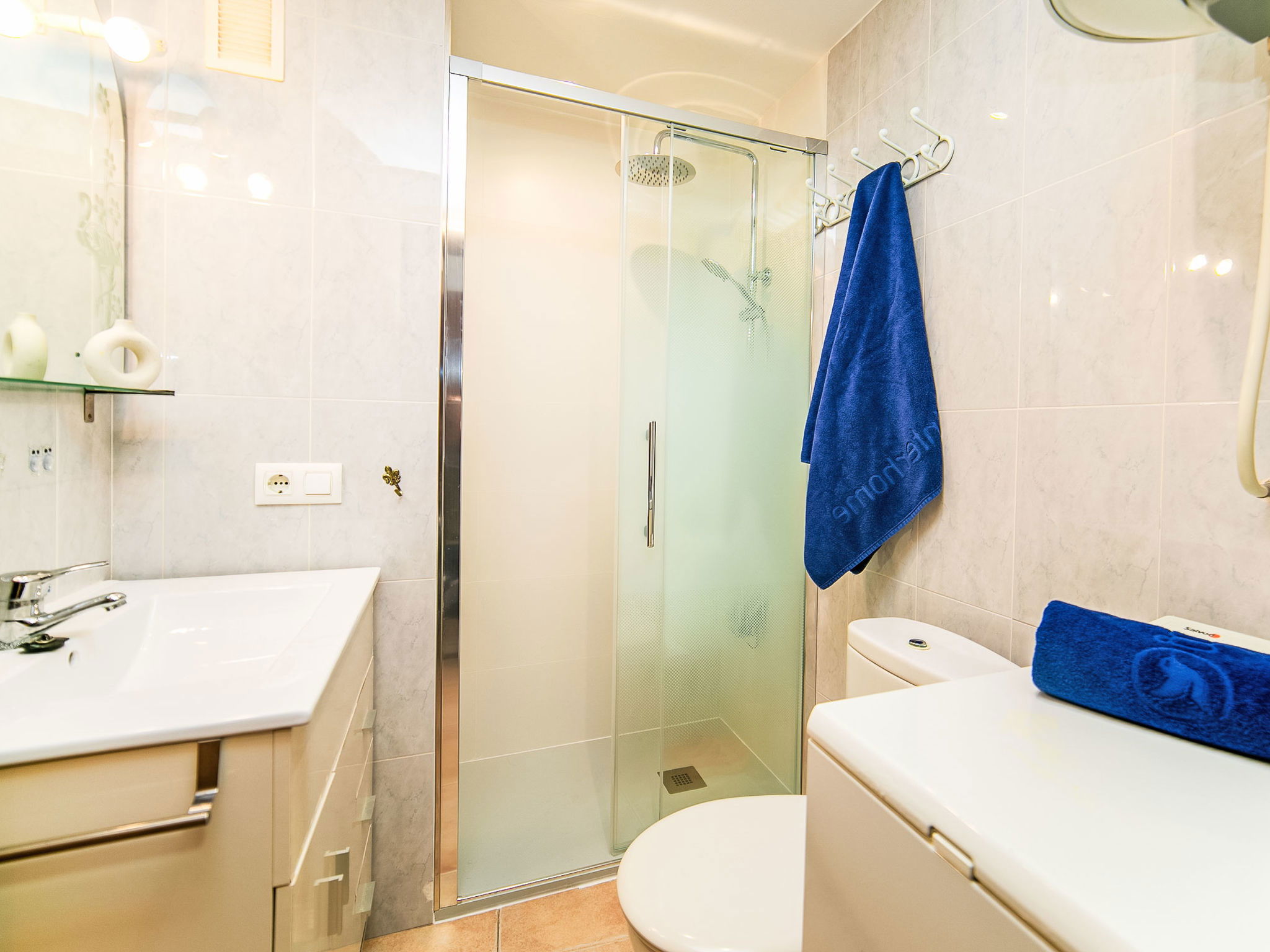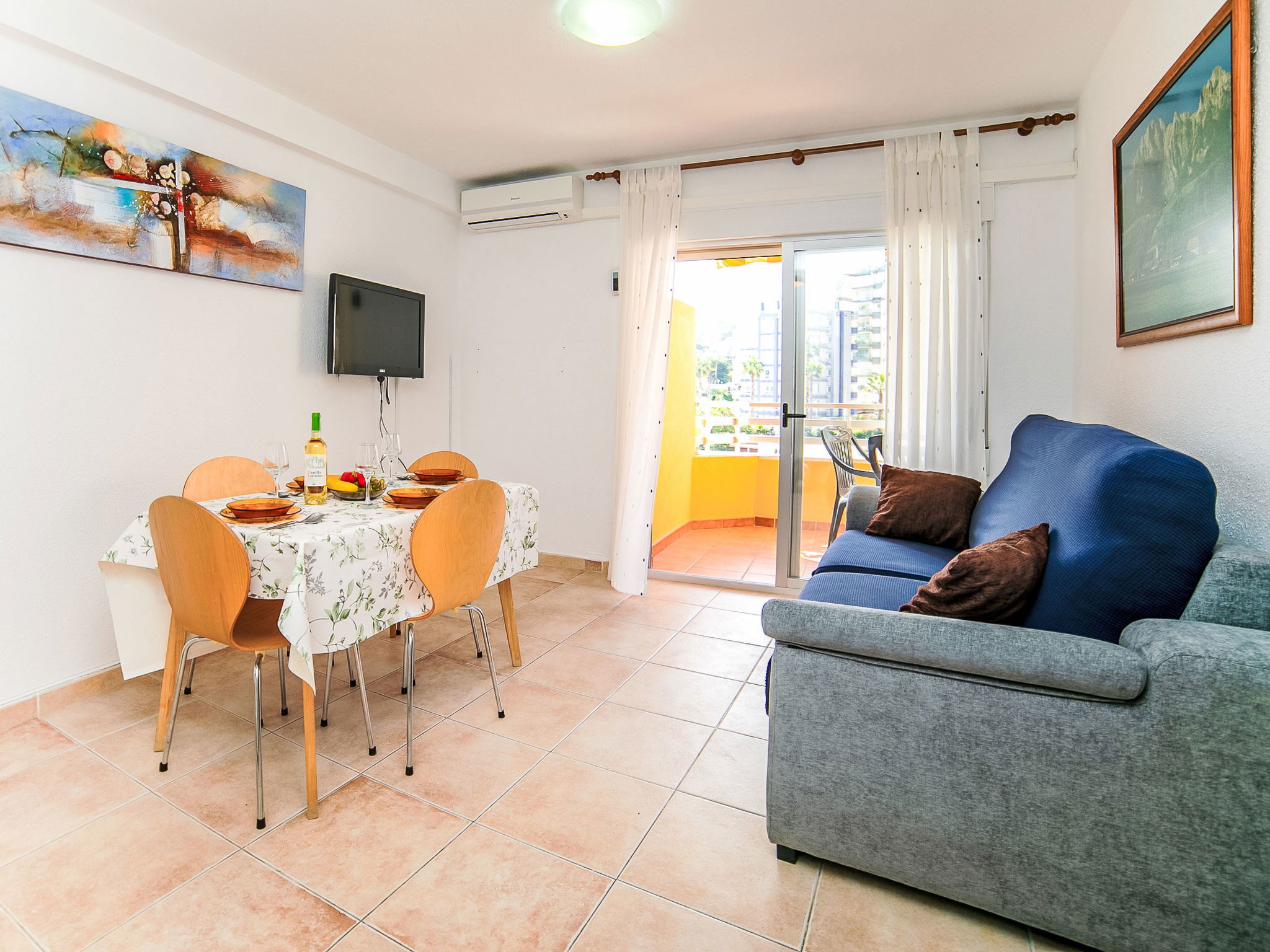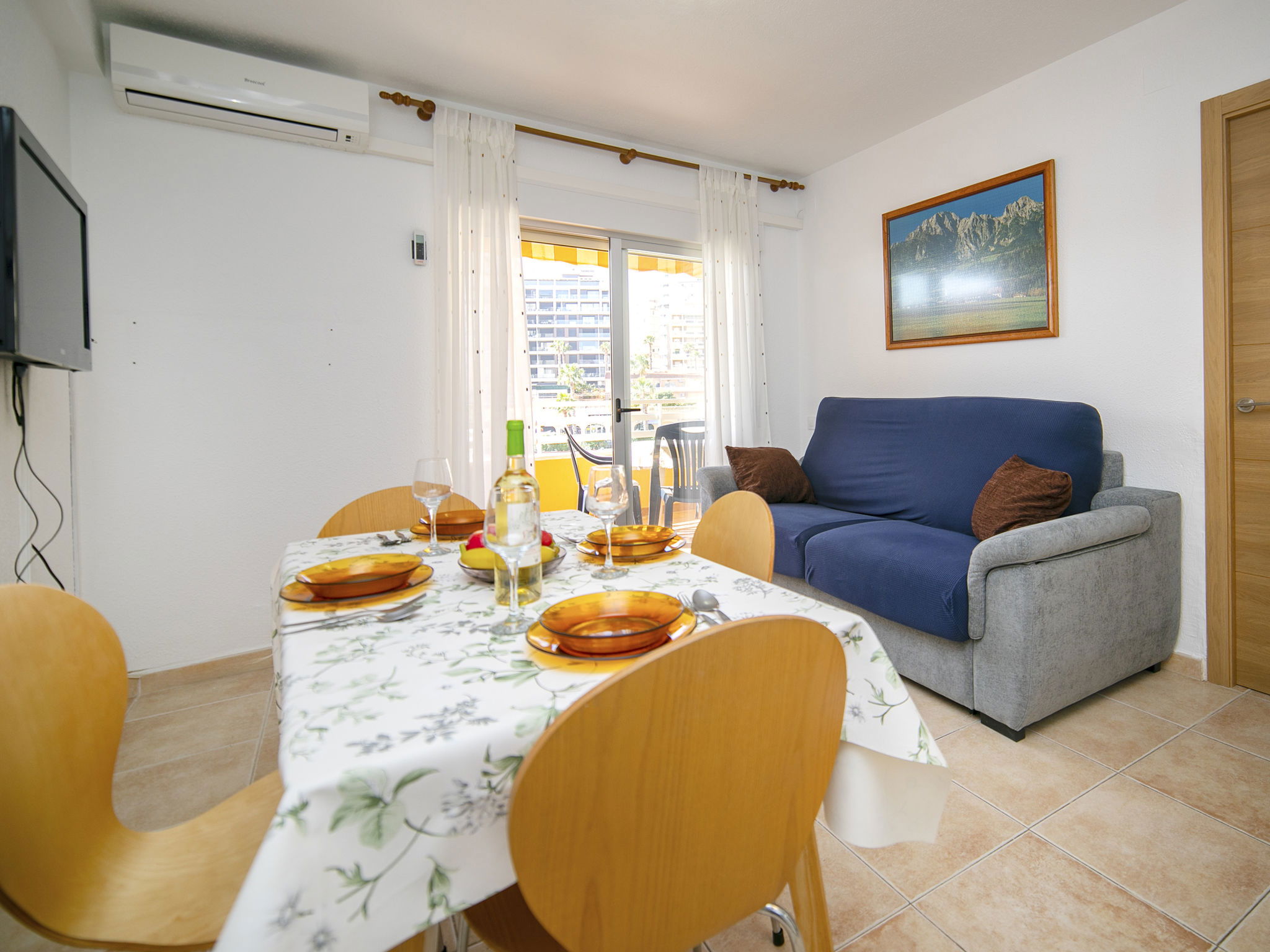 "Voramar", Appartement de 2 pièces 40 m2 au 3ème étage. Clair, aménagement fonctionnel et plaisant: séjour/salle à manger avec 1 divan-lit, Télévision numérique, air-conditionné et chauffage à air chaud. Sortie sur la terrasse. 1 chambre avec 2 lits (90 cm, longueur 190 cm). Petite cuisine (2 plaques vitrocéramiques, grille-pain, bouilloire électrique, micro-ondes, congélateur, cafetière électrique, combiné micro-ondes). Douche/WC. Terrasse. Meubles de terrasse. Belle vue sur la mer et la piscine. A disposition: lave-linge, fer à repasser. Internet (Connexion WIFI, gratuit). Maximum 1 animal/ chien autorisé. R000000001