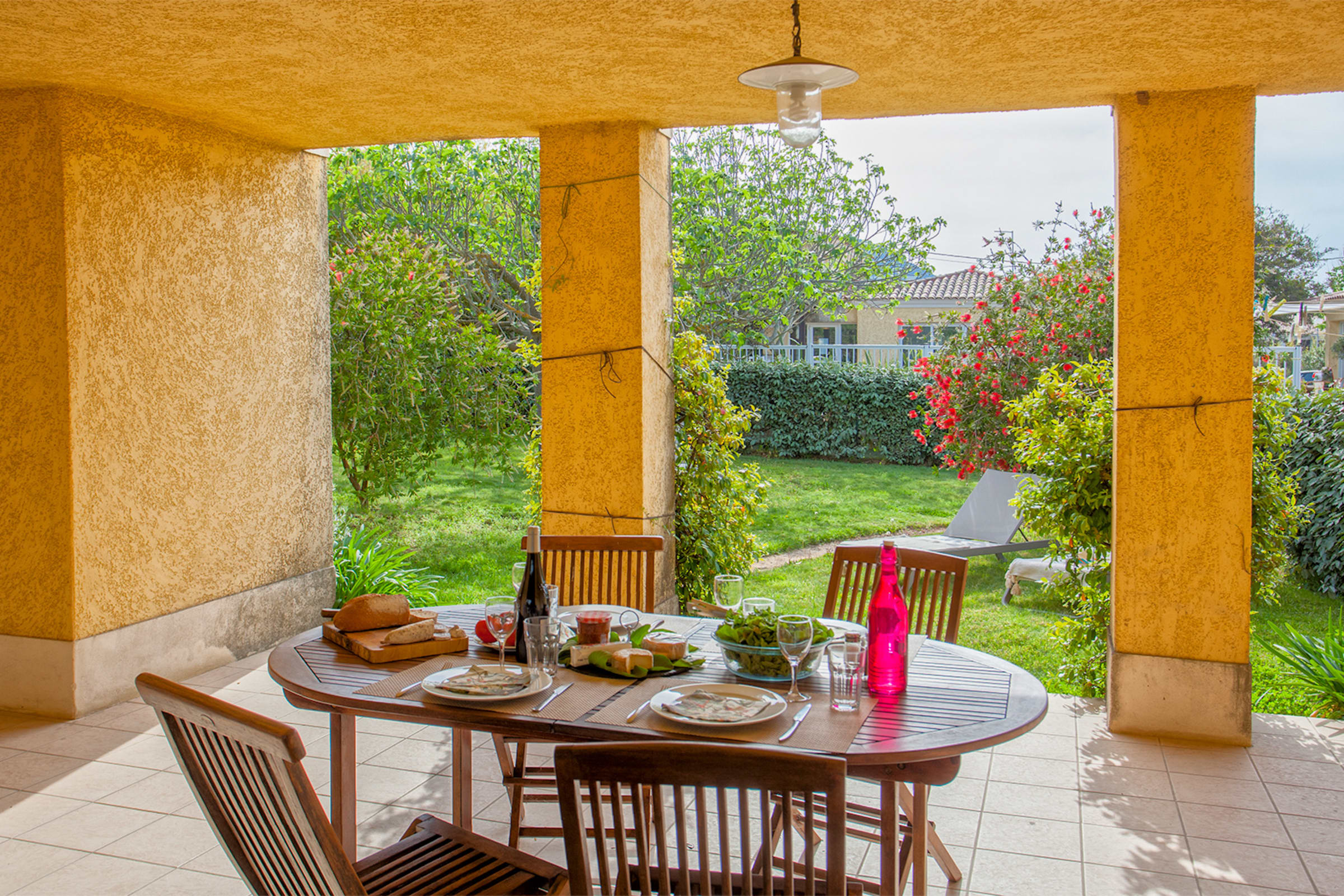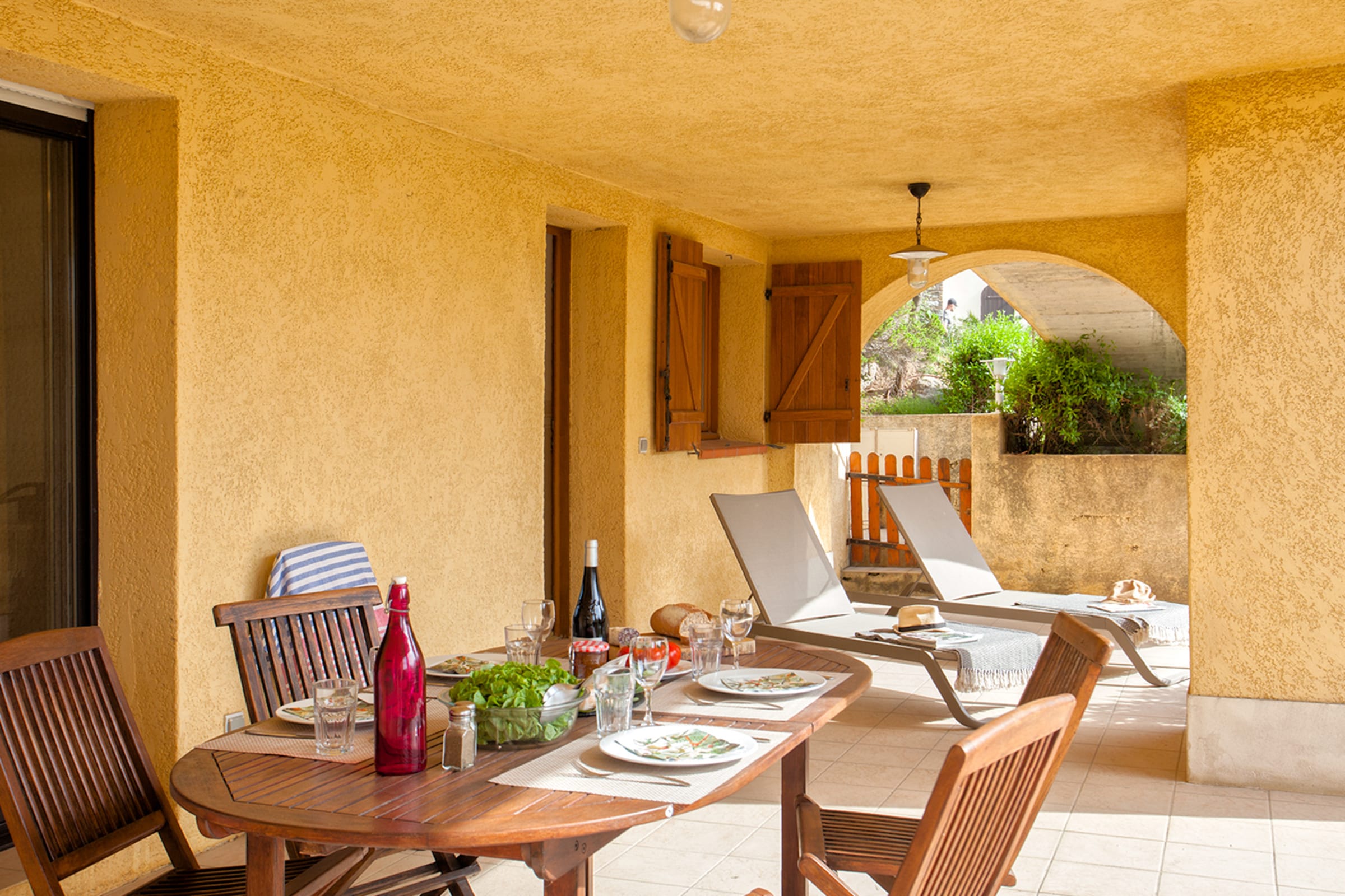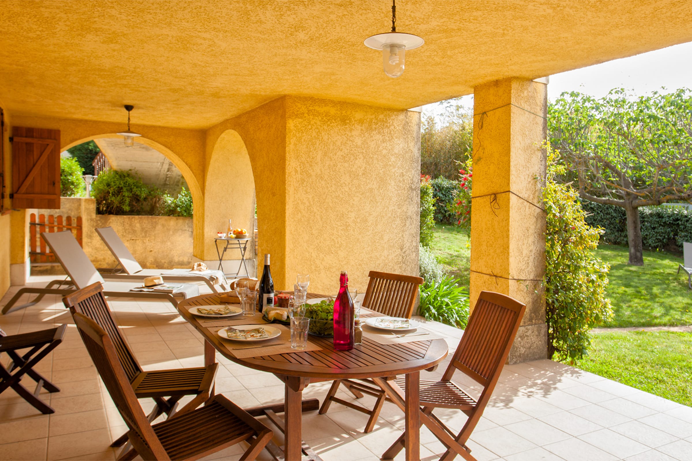 La terrasse en partie couverte est équipée avec une grande table bois, 6 chaises et un barbecue avec charbon de bois.