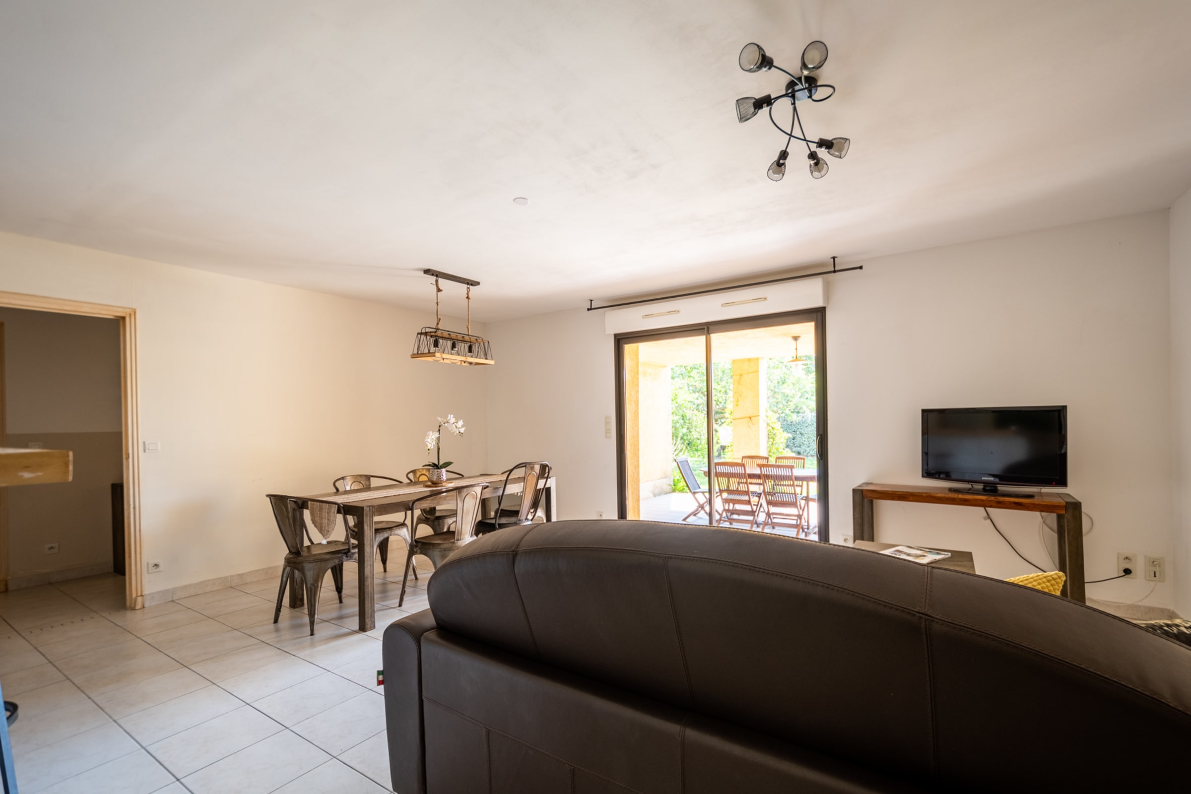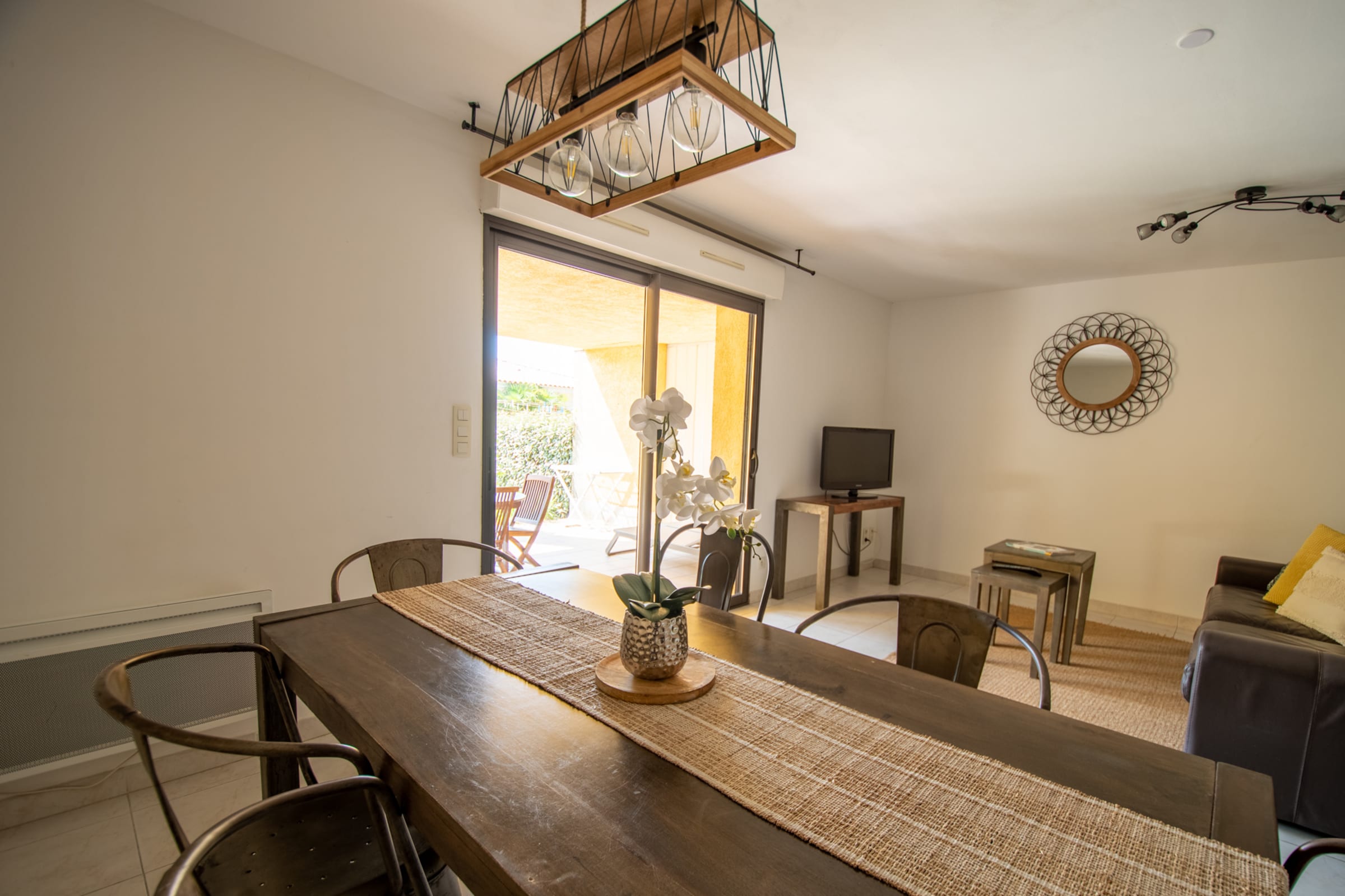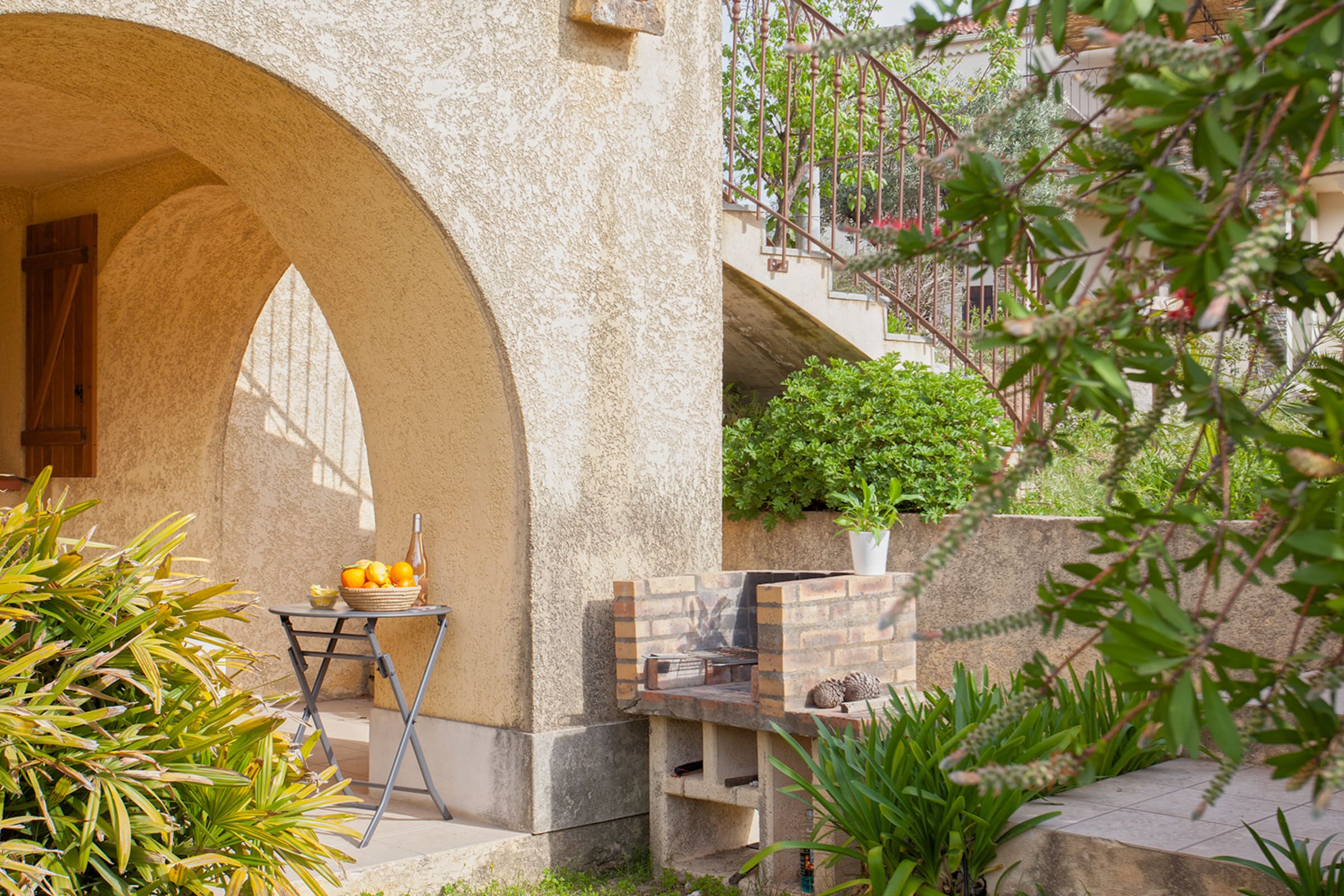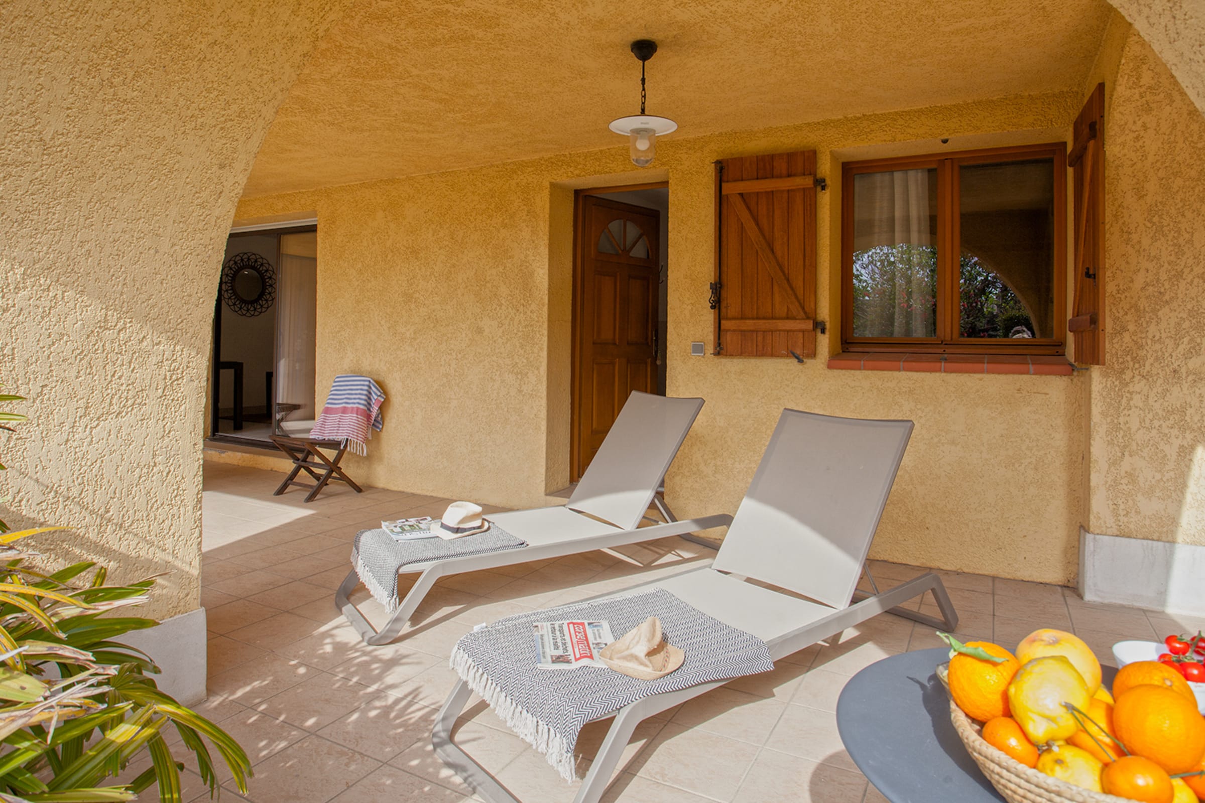 La terrasse en partie couverte est équipée avec une grande table bois, 6 chaises et un barbecue avec charbon de bois.
