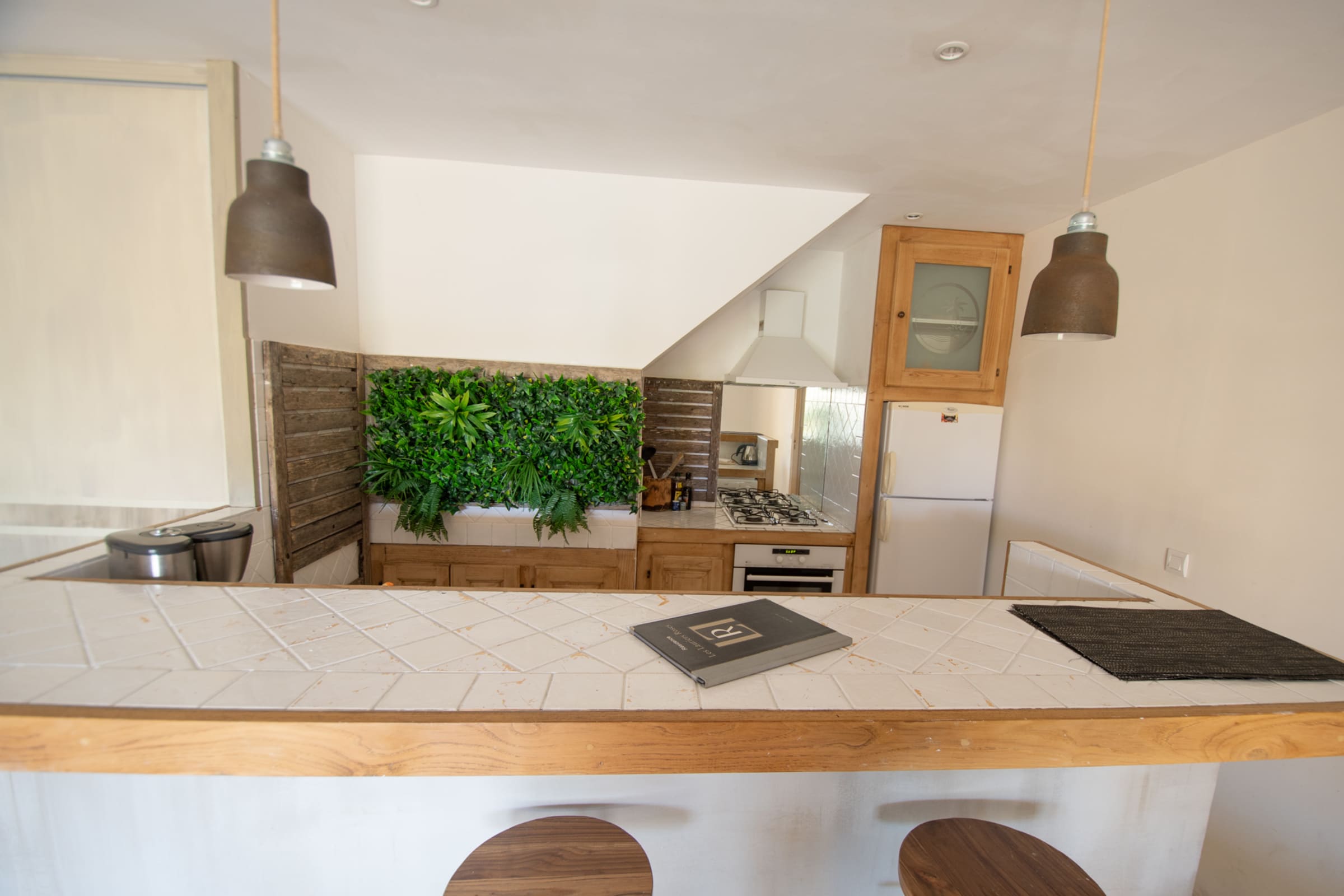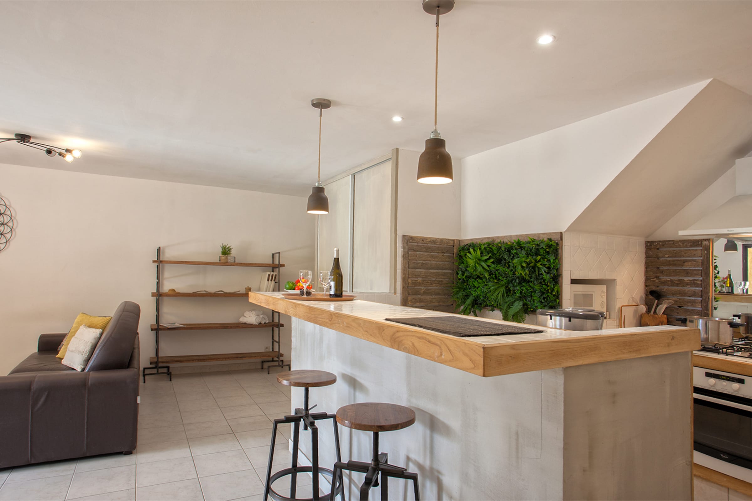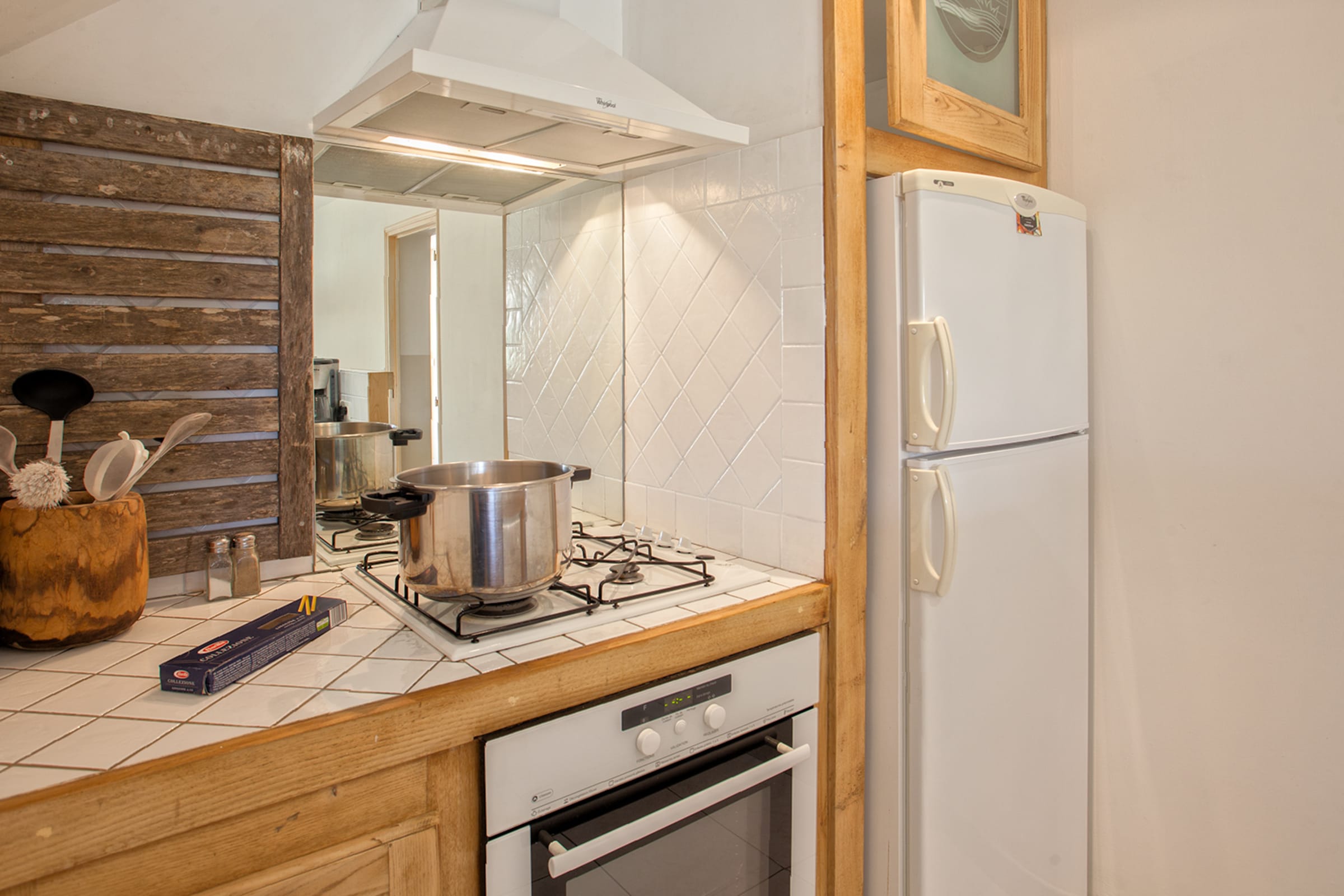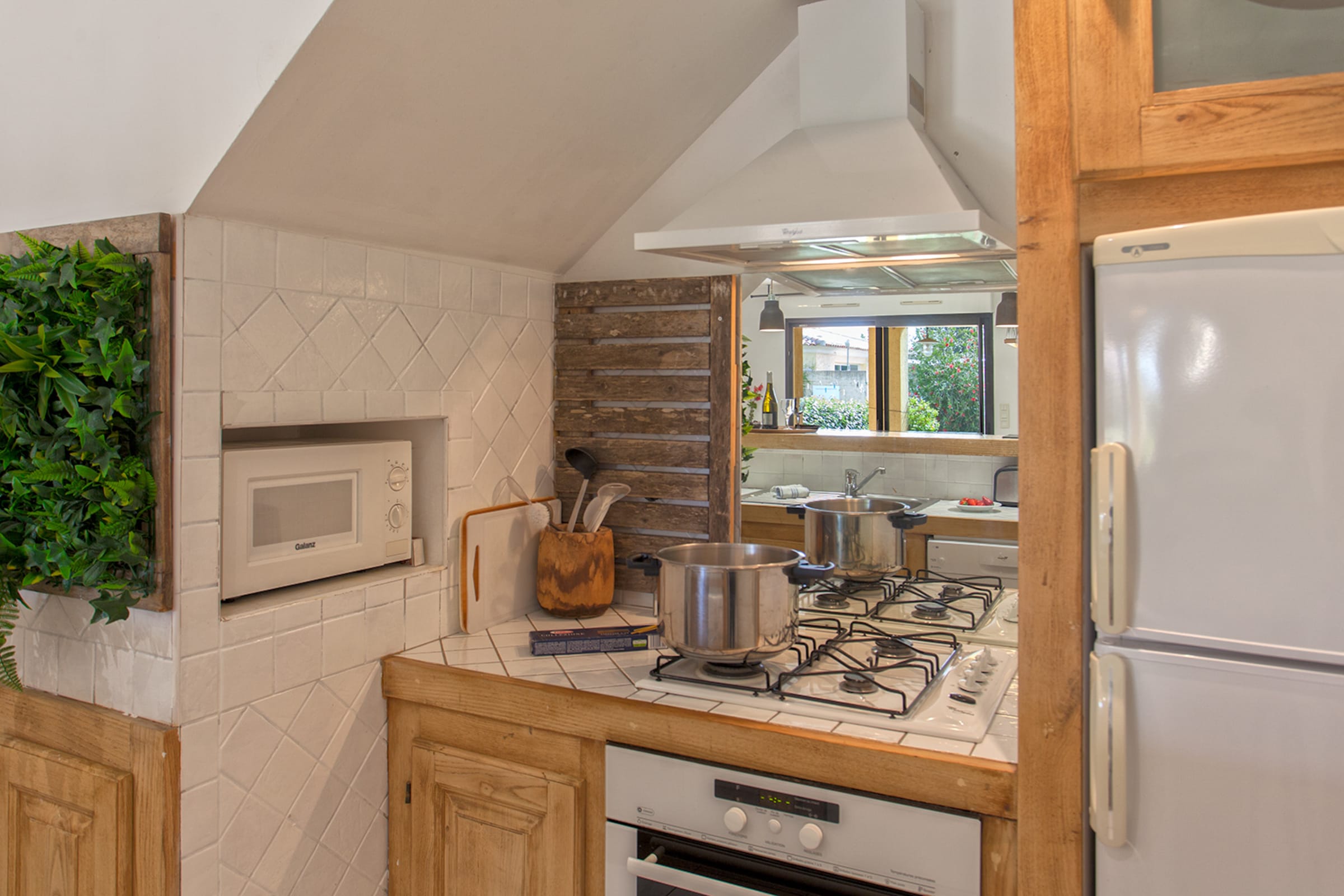 La cuisine est équipée d'un lave linge, lave vaisselle, plaque vitrocéramique, cafetière filtre, grille pain, bouilloire, four classique et four microonde, réfrigérateur avec compartiment congélation.
