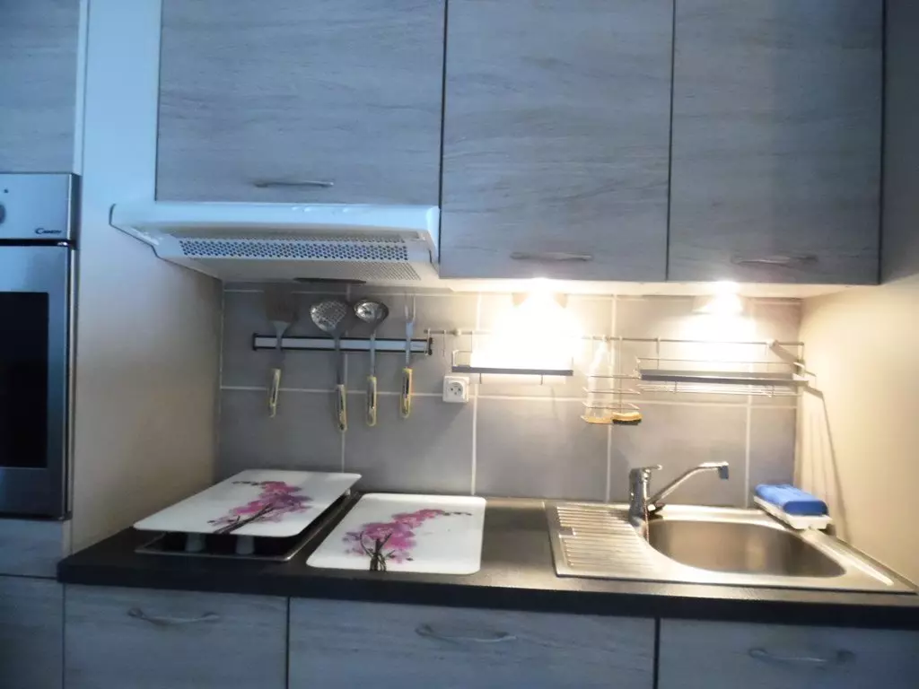 Le séjour comprend une banquette convertible 2 places en 130 et une télévision. Le coin-cuisine est entièrement équipé : plaques électriques, four, micro-ondes, réfrigérateur, lave-vaisselle et lave-linge.