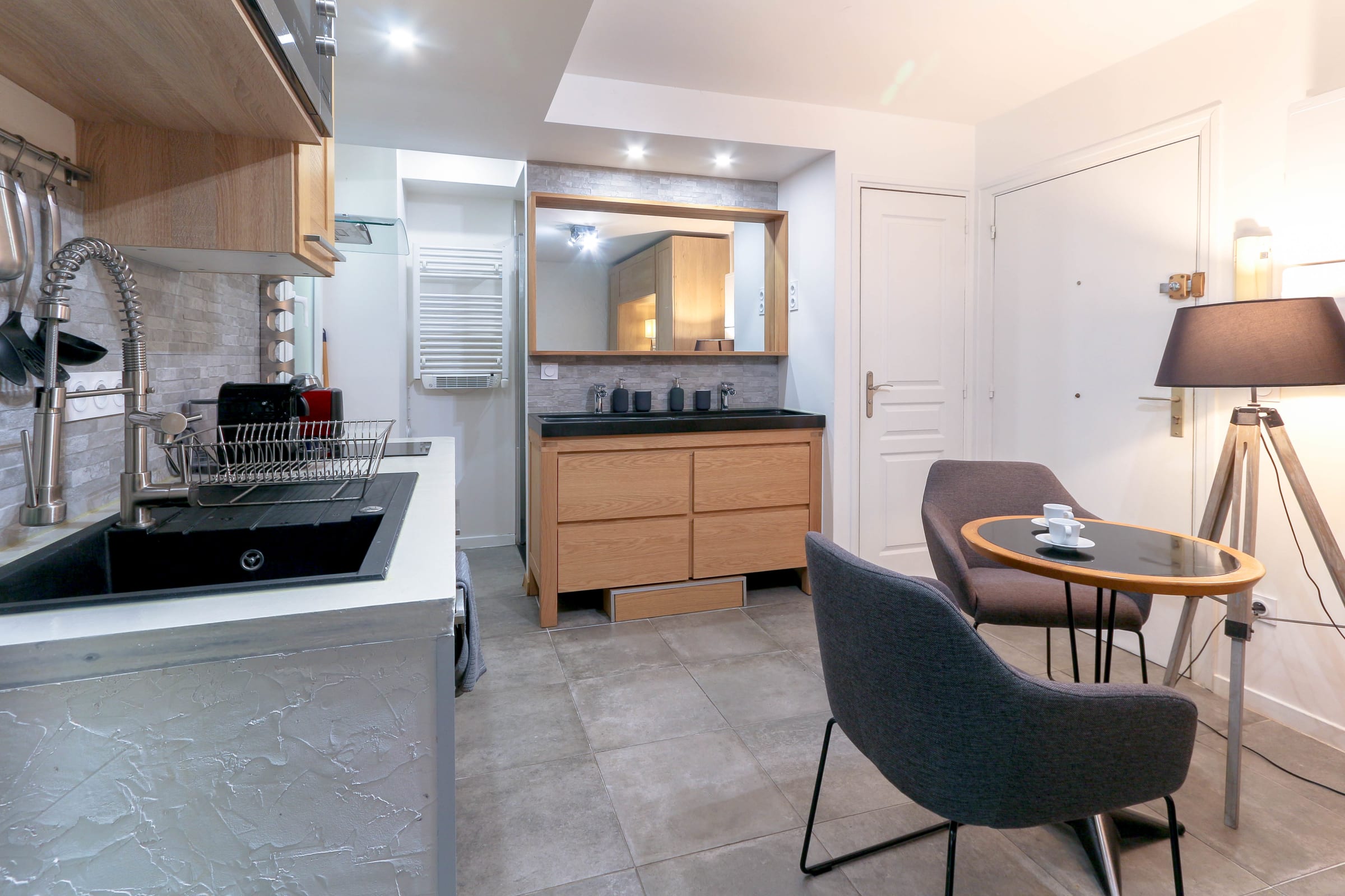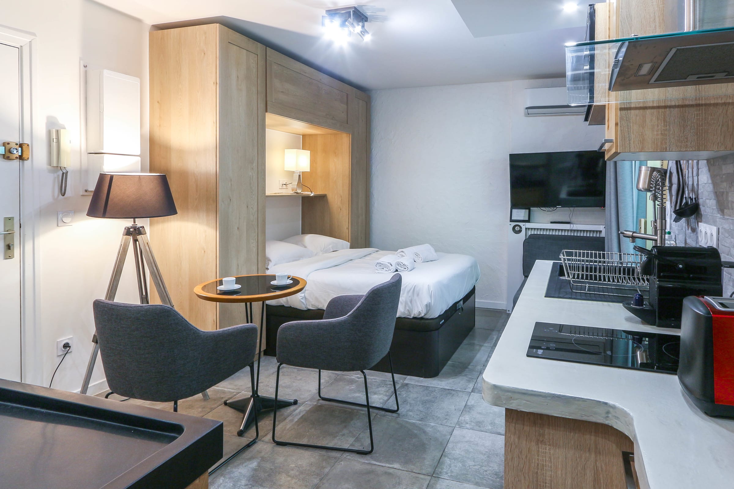 - Cuisine ouverte : Micro-onde, Plaque de cuisson 2 feux, Machine Nespresso, Petit frigo et Hotte aspirante