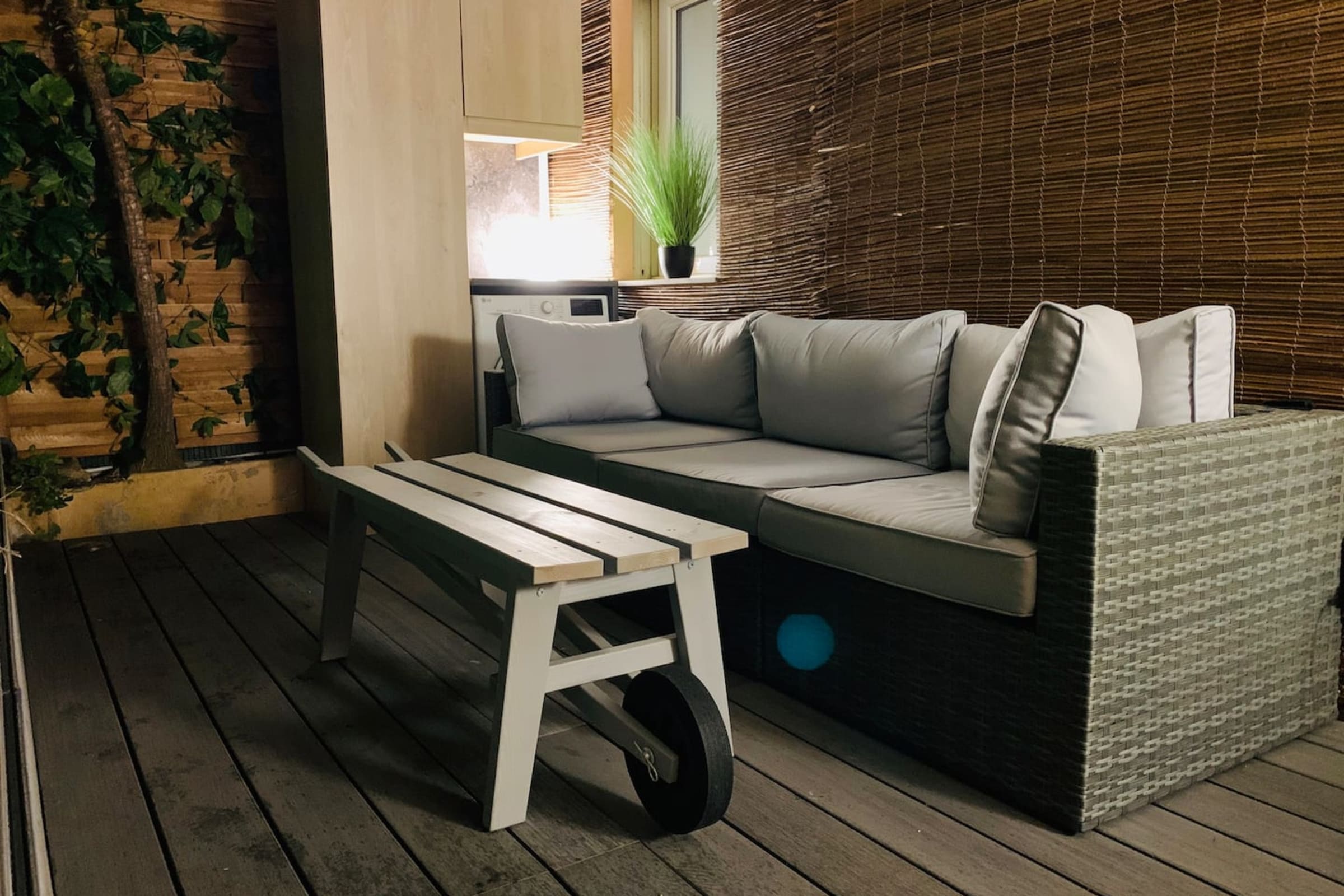 - Extérieur : Terrasse et jardin de 40m² avec un salon de jardin et un coin repas