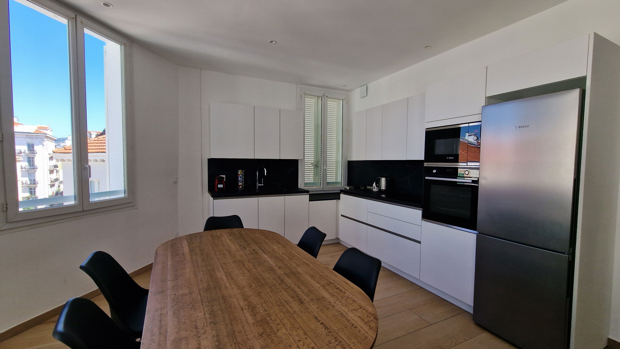 La cuisine américaine, équipée avec soin, vous permettra de préparer de délicieux repas avec aisance. Vous y trouverez tout le nécessaire, des appareils électroménagers modernes tels que réfrigérateur, micro-ondes, four, congélateur et lave-vaisselle, aux petits ustensiles indispensables comme cafetière, grille-pain et bouilloire.