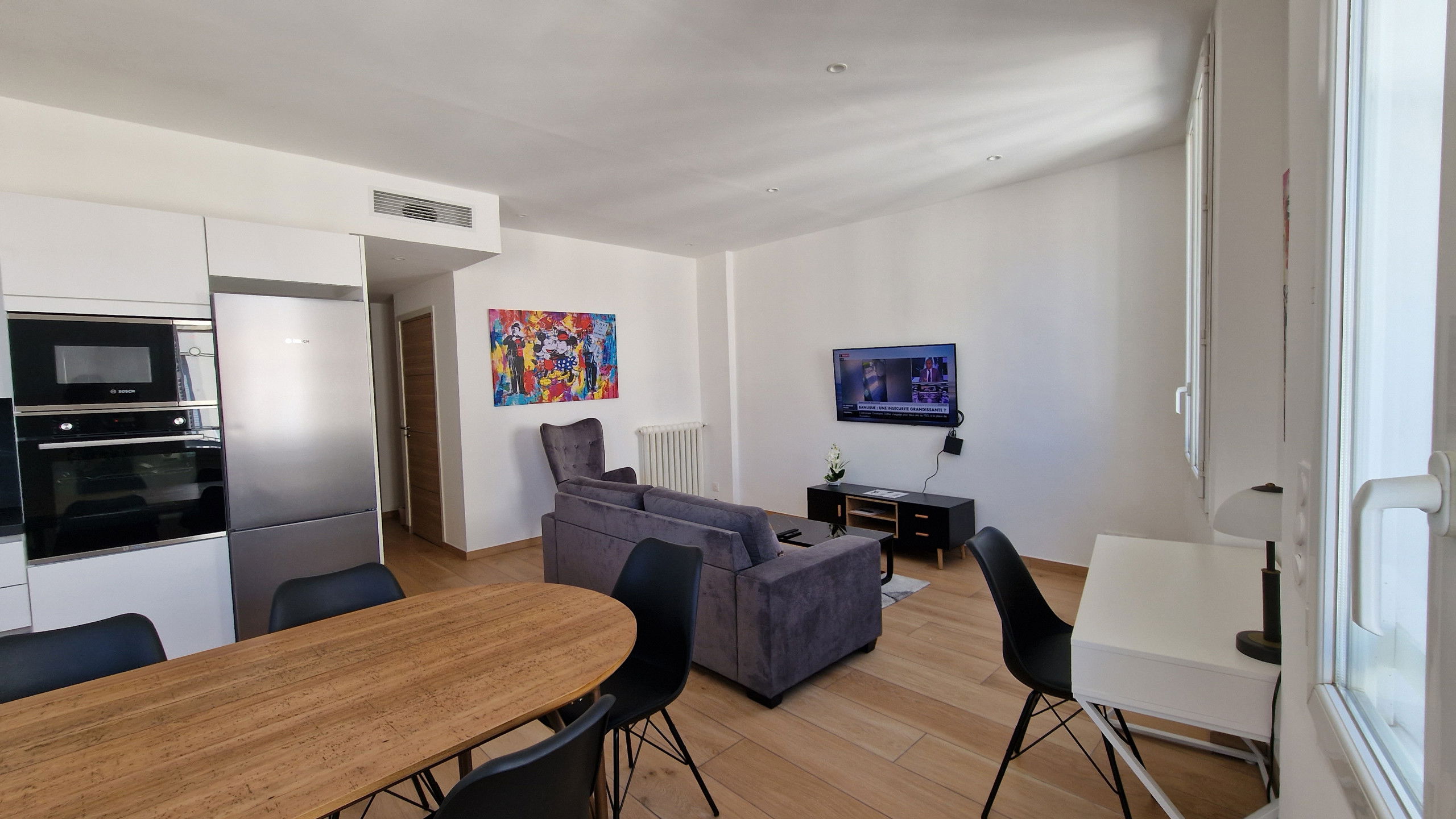 En entrant, vous serez immédiatement séduit par la luminosité et l'élégance de l'espace de vie. Le salon, baigné de lumière naturelle, invite à la détente et à la convivialité. Doté d'un accès internet haut débit (wifi) et de la climatisation dans chaque pièce, cet espace est conçu pour votre confort optimal.