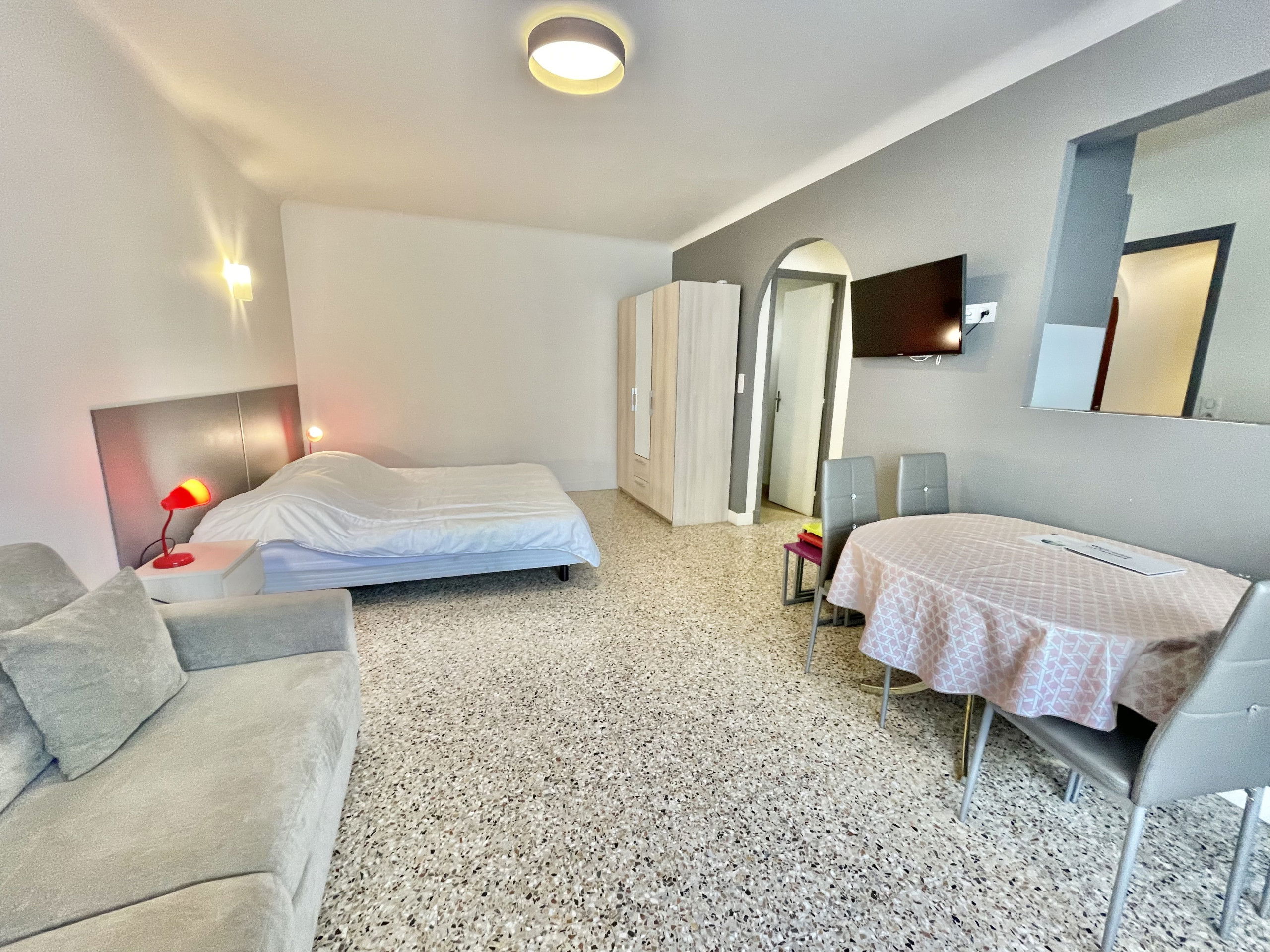 Situé A 10 minutes du Palais des festivals , au 1er étage vaste studio avec sa cuisine équipée neuve,sa salle de bain avec baignoire,wc indépendant et sa pièce à vivre avec son coin nuit et ses 2 lits individuels,son coin salon avec son canapé convertible et son coin repas.