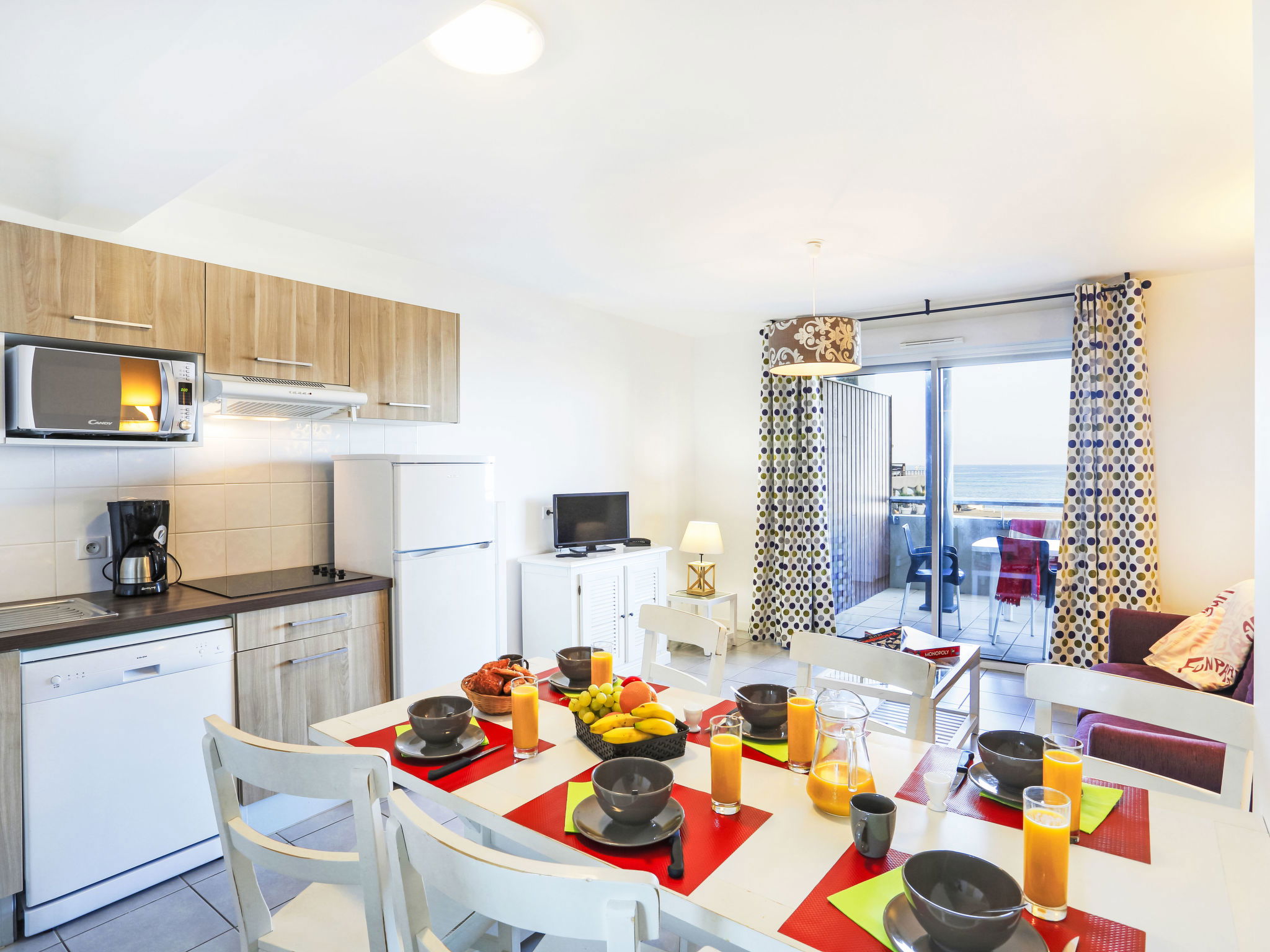 "L'Estacade", Appartement de 3 pièces 45 m2. Clair, aménagement fonctionnel: séjour/chambre à coucher avec 1 divan-lit double, table pour les repas et TV. 1 chambre avec 1 grand-lit (160 cm). 1 chambre avec 2 lits. Coin cuisine (lave-vaisselle, 4 plaques vitrocéramiques, grille-pain, bouilloire électrique, micro-ondes, congélateur, cafetière électrique). Salle de bains, WC séparé. Chauffage électrique. Balcon ou terrasse. Meubles de terrasse, mobilier de balcon. A disposition: Internet (Connexion WIFI, en sus). Veuillez noter: logement non-fumeur. Maximum 1 animal/ chien autorisé. Détecteur de fumée, extincteur. Cette location est un exemple de location / d'appartement.