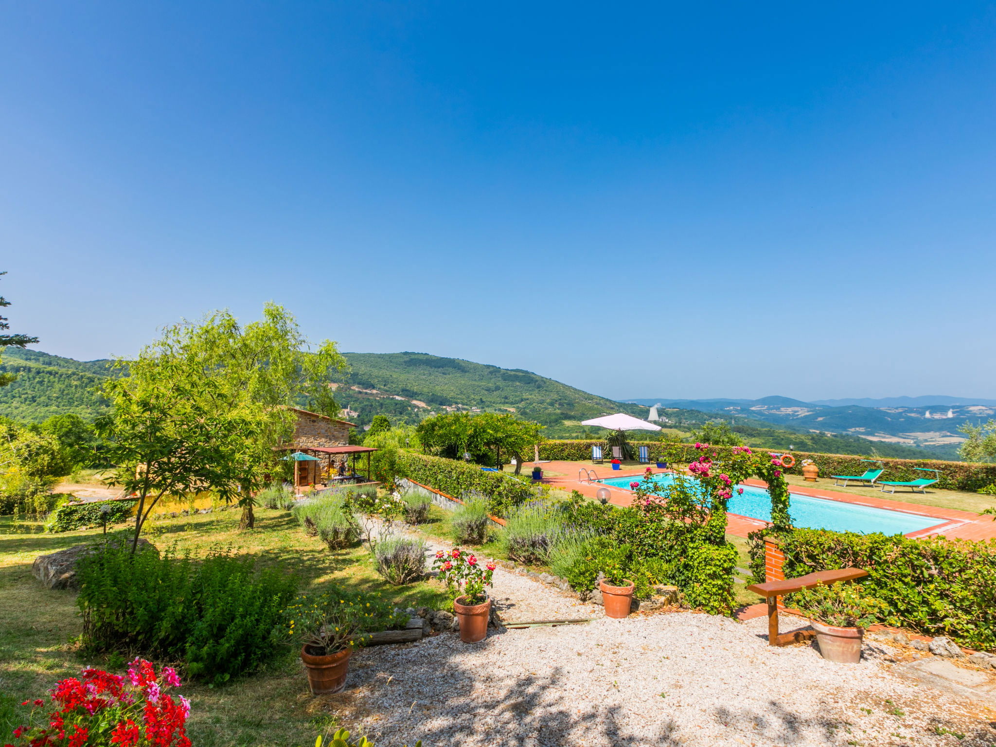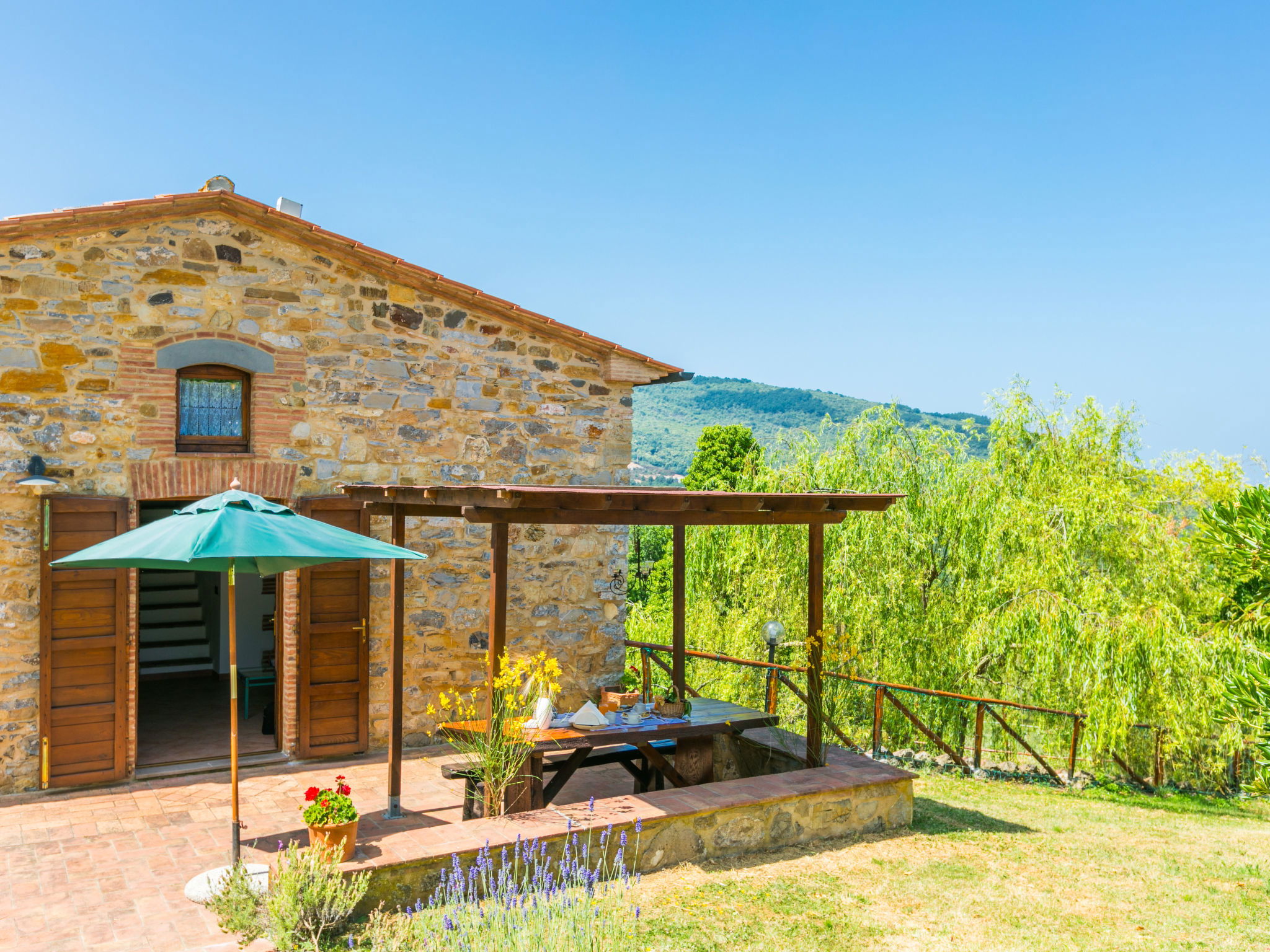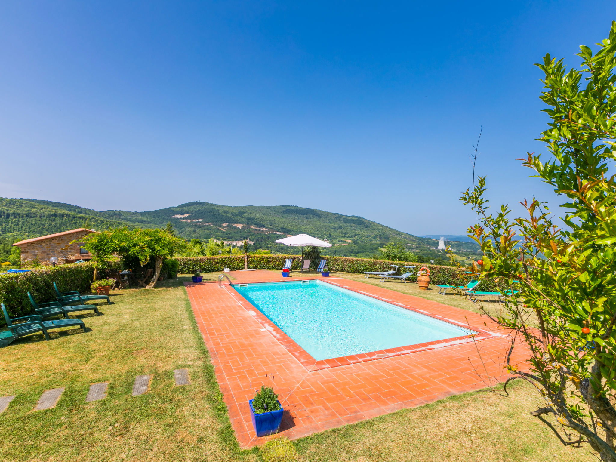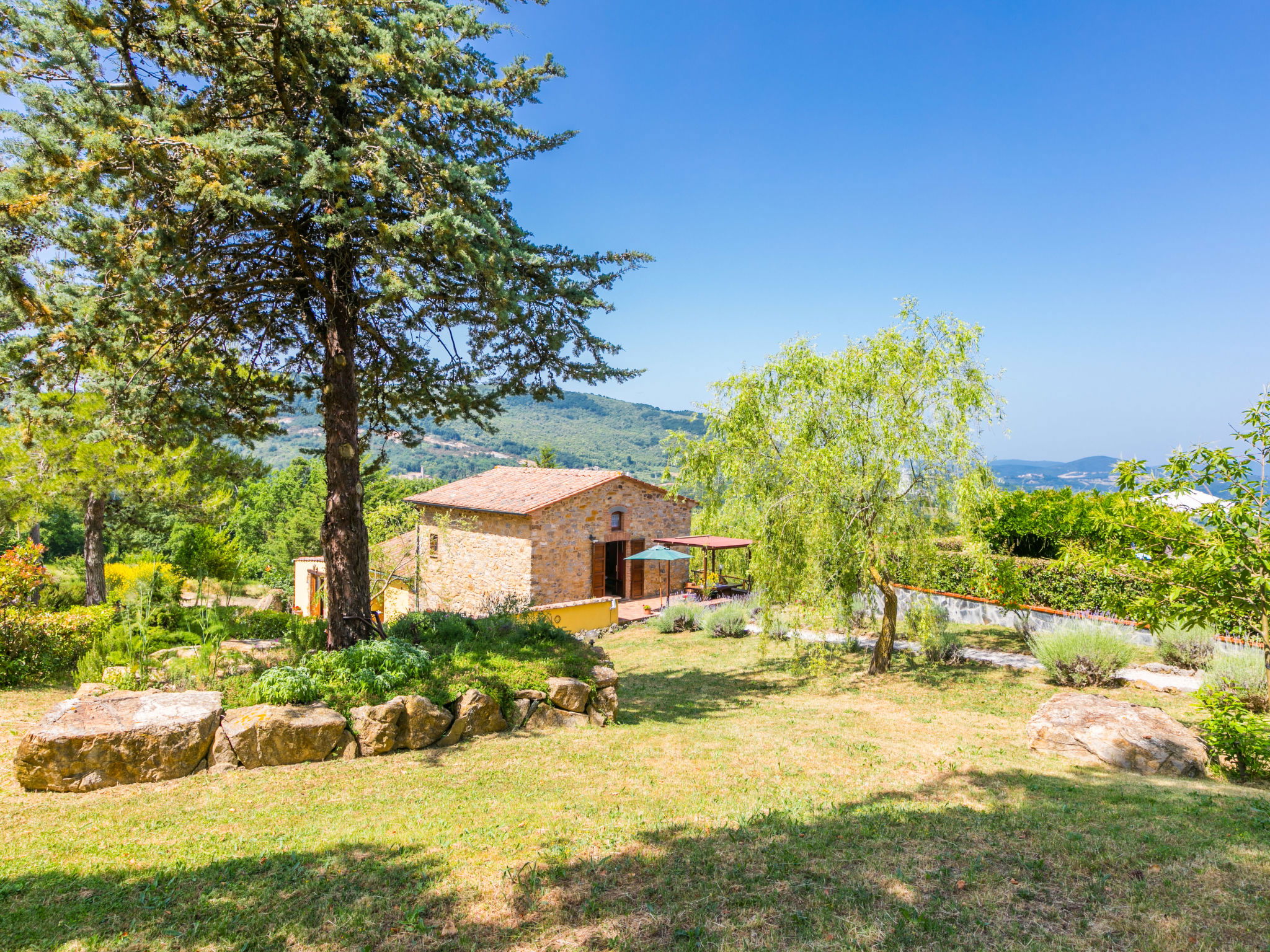 Cottage "Pino di Sopra". Location composée d'un bâtiment principal et d'une annexe, à 8.7 km du centre de Castelnuovo Val di Cecina, à 4.5 km du centre de Sasso Pisano, à 21 km du centre de Massa Marittima, situation isolée sur un versant, à 45 km de la mer, à 4.5 km du lac, dans la verdure. En commun: terrain, jardin sur plusieurs niveaux avec plantes et fleurs, piscine cloturée (10 x 5 m, disponibilité saisonnière: 07.Jun. - 30.Sep.). Douche extérieure, tonnelle, meubles de jardin, barbecue. Infrastructures de la Maison: Connexion WIFI, lave-linge (en commun). Accès en voiture par un chemin de 200 m de long (chemin non goudronné). Place de parking (pour 5 voitures) sur le terrain. Magasins 4.5 km, supermarché 8.7 km, arrêt de bus 2 km, piscine couverte 14 km, étang offrant possibilité de baignade 4.5 km. Attractions à proximité: Volterra 45 km, Siena 70 km, Firenze 100 km. Vente locale de produits de la ferme.