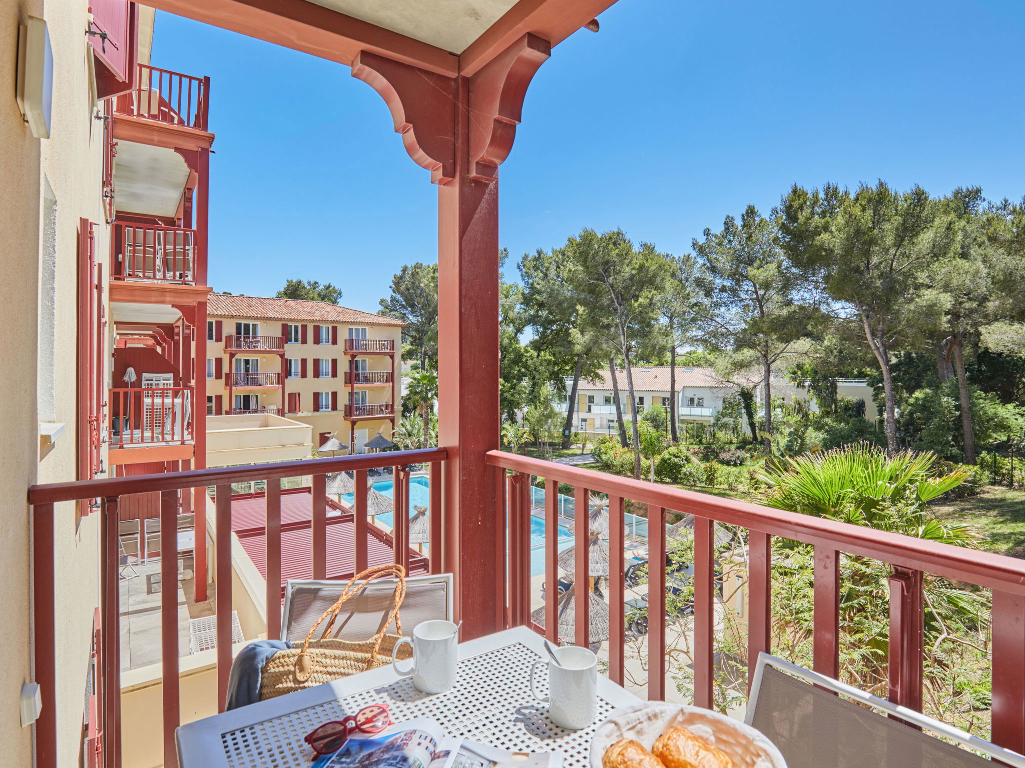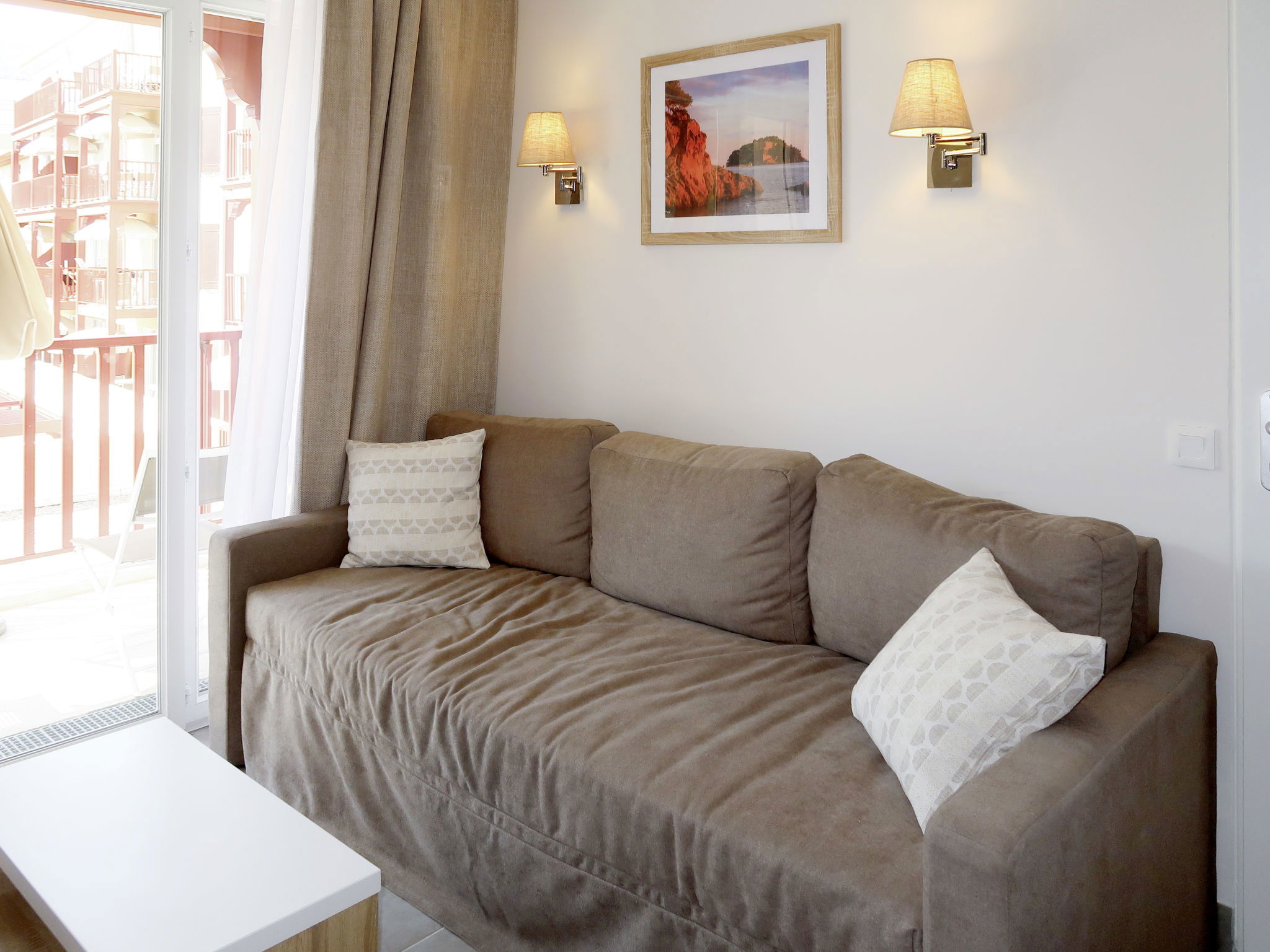 Complexe de vacances "Les Canissons", année de construction 2019. 95 appartements dans la résidence. À 800 m du centre de Cavalaire, à 20 km du centre de St. Tropez, à 59 km du centre de Toulon, à 700 m de la mer. En commun: terrain (clôturé), piscine chauffée (7 x 20 m, profondeur 140 cm, disponibilité saisonnière: 15.Avr. - 15.Oct.). Bassin pour les enfants, douche extérieure, terrain de pétanque. Infrastructures de la résidence: réception, salle pour petits déjeuners, sauna, salle fitness, massage (en sus). Bains de vapeur (hammam), lave-linge, sèche-linge (en commun, en sus). Petit-déjeuner (en sus). Place de parking (nombre de places limité), garage en commun. Magasins 300 m, restaurant, plage de sable "Bonporteau" 700 m. Veuillez noter: résidence avec portail électrique. La photo ne montre qu’un exemple de location de vacances. Les locations peuvent également se différencier par leur superficie, la disposition des pièces et leur équipement.