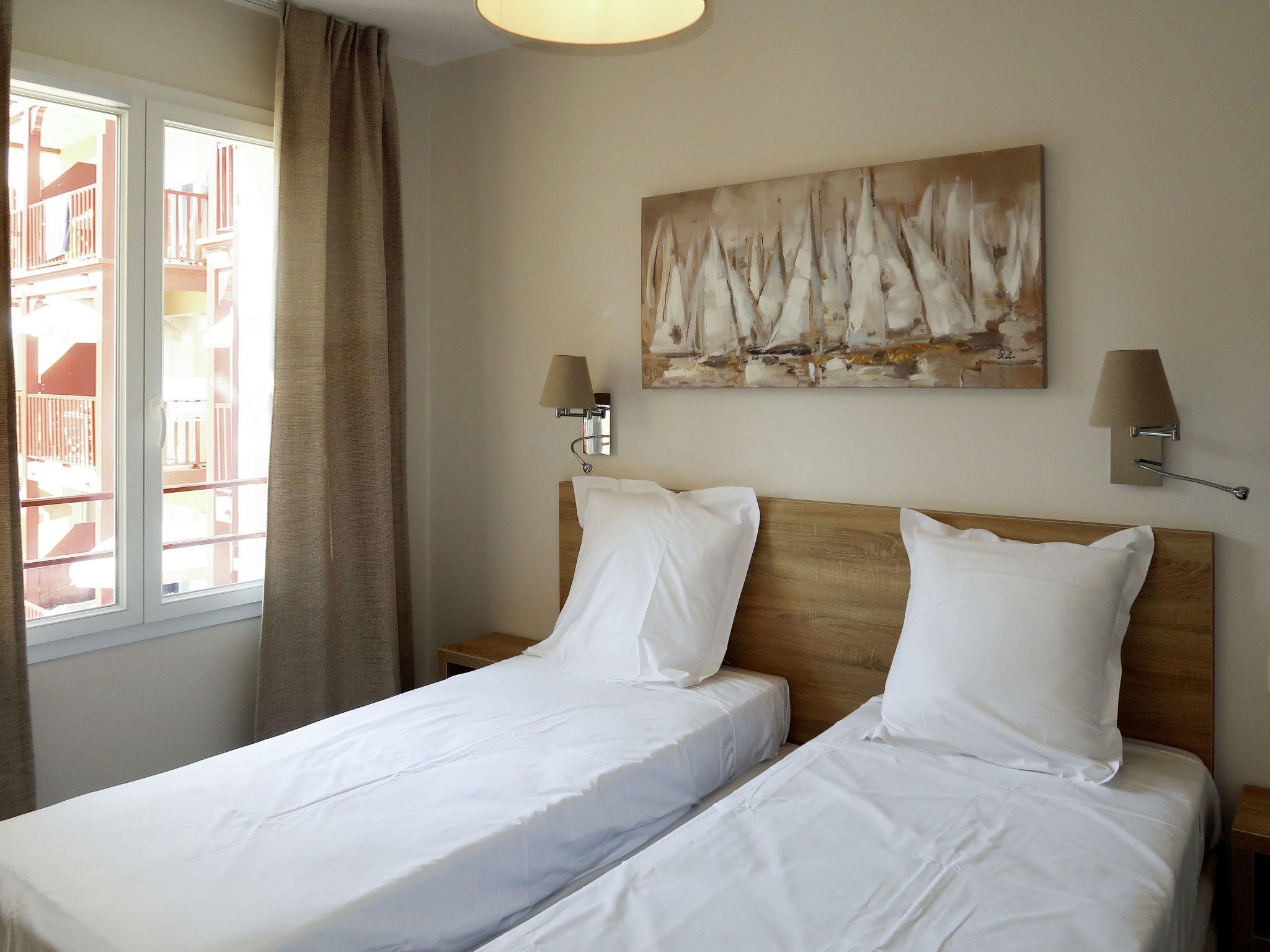 "Résidence Odalys Collection Les Canisson", Appartement de 3 pièces 40 m2. Clair, aménagement moderne: séjour/chambre à coucher avec 1 divan-lit double, table pour les repas et TV (satellite). Sortie sur le balcon, sur la terrasse. 1 chambre avec 1 grand-lit. 1 chambre avec 2 couchages (90 cm, longueur 190 cm), douche/WC. Coin cuisine (lave-vaisselle, 4 plaques vitrocéramiques, grille-pain, bouilloire électrique, cafetière électrique, combiné micro-ondes). 2 bains ou douches/WC. Chauffage électrique, air-conditionné. Petit balcon ou petite terrasse. Meubles de terrasse, mobilier de balcon. A disposition: chaise haute pour enfant, lit bébé (en sus). Internet (Connexion WIFI, gratuit). Veuillez noter: logement non-fumeur. Maximum 1 animal/ chien autorisé. Détecteur de fumée.