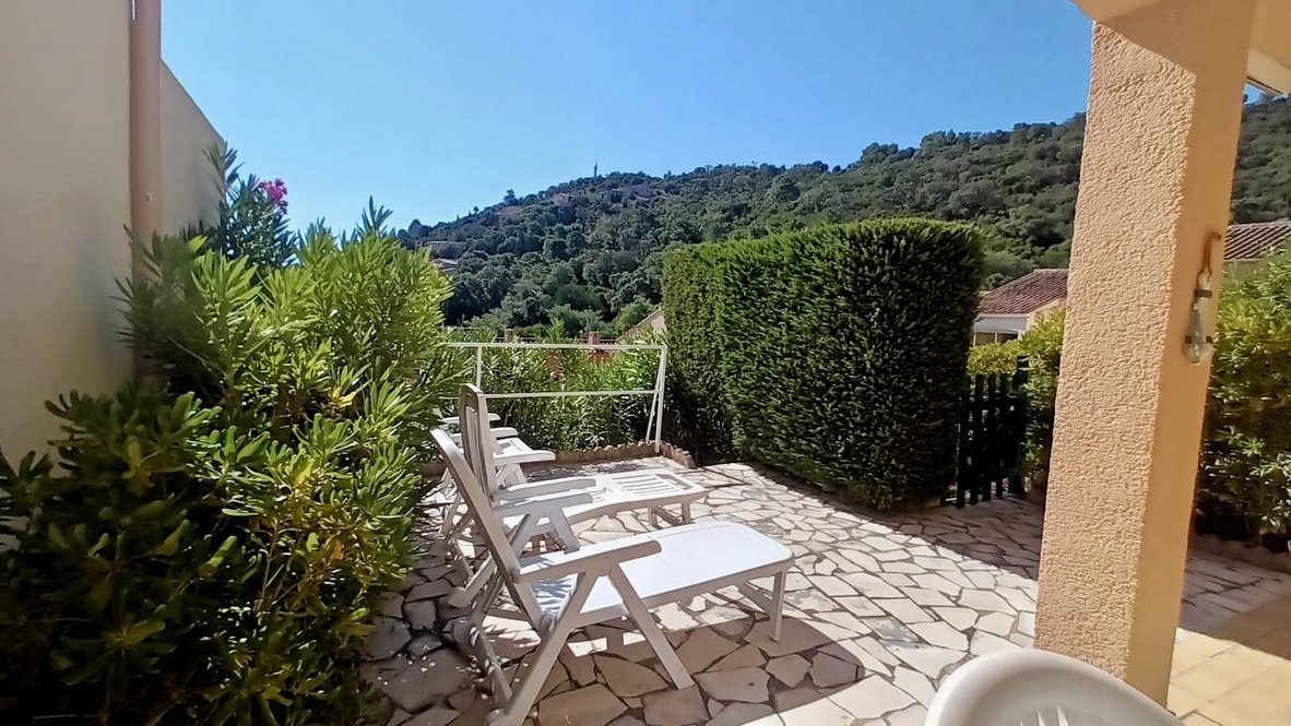 À flanc de colline, dans une résidence sécurisée avec piscine collective, charmant deux pièces en rez de jardin juste au dessus de la piscine comprenant une pièce principale avec un clic clac pour deux personnes, un coin cuisine, une chambre avec un lit double et placard, une salle d'eau et wc.