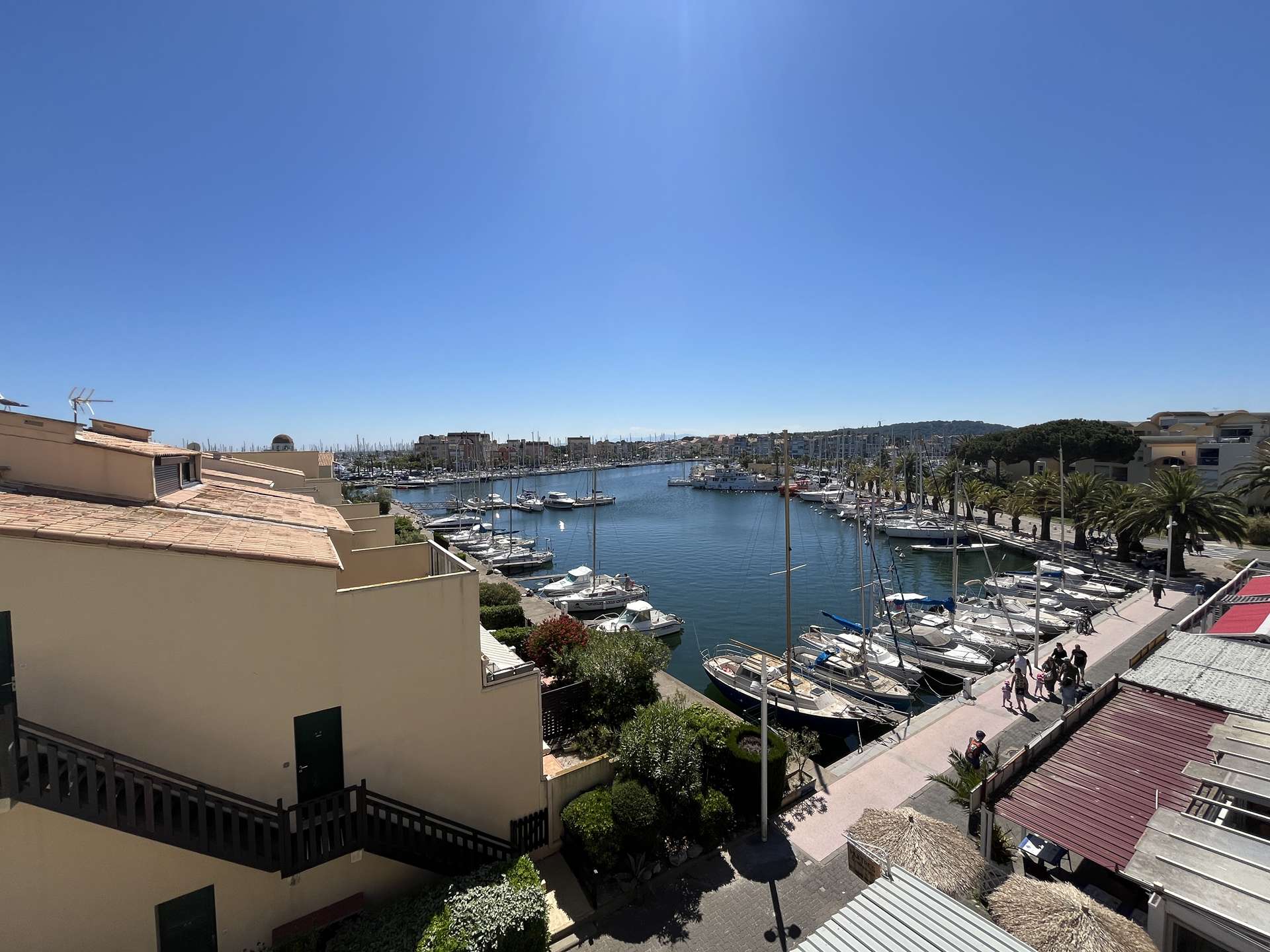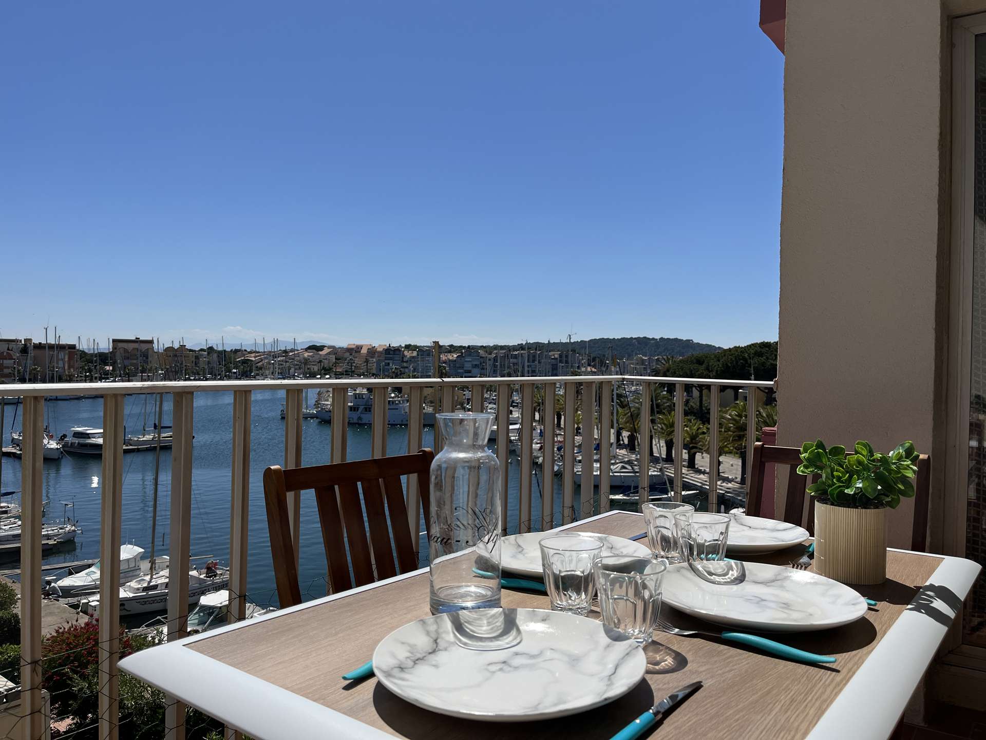 Les avantages de cette location saisonnière : vue panoramique sur la marina depuis la terrasse, place de parking privée.