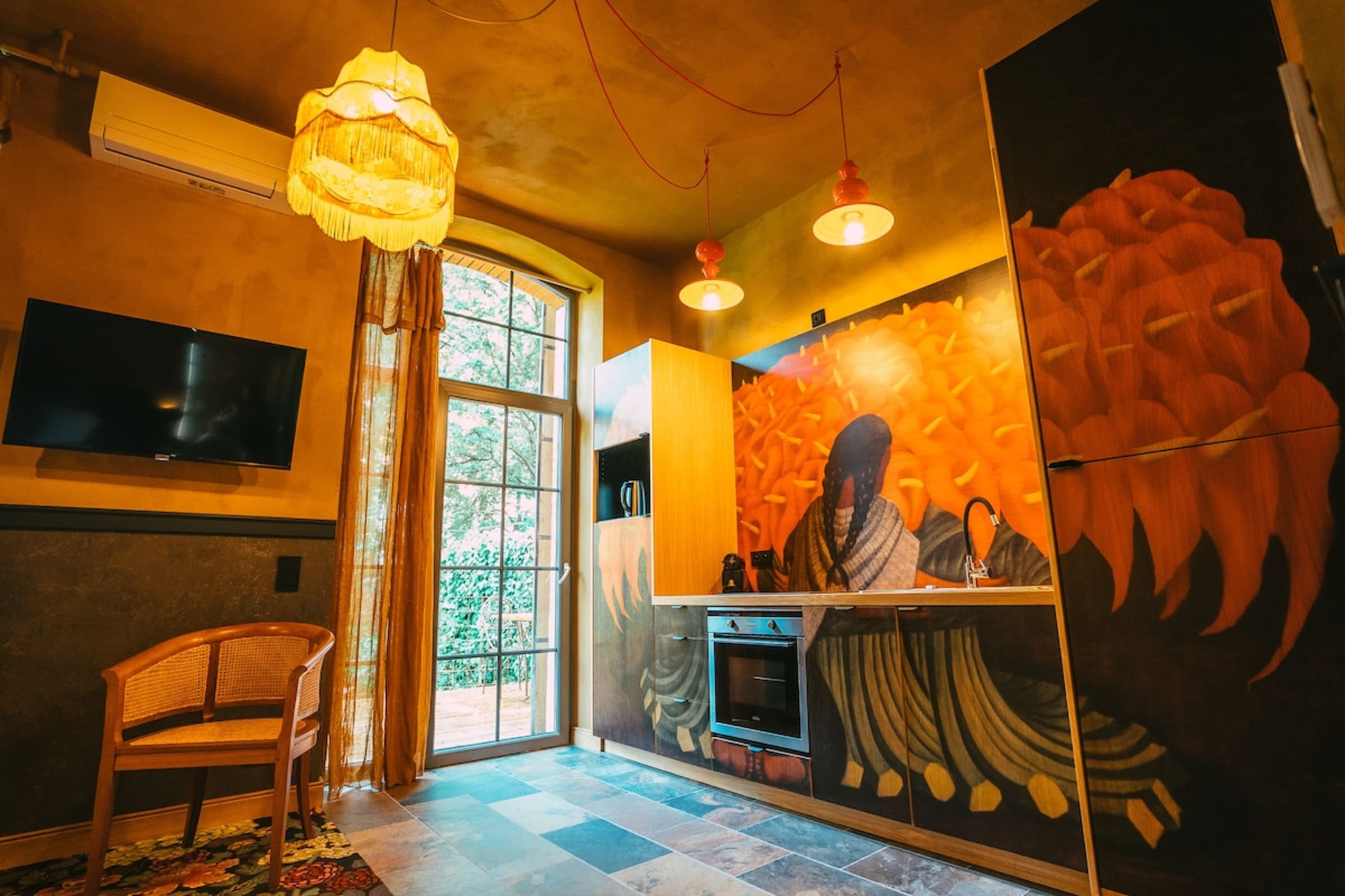 Décollez pour un voyage hors du temps ! Venez découvrir notre très bel hébergement "Diego". Ici, tout a été fait dans les moindres détails pour vous faire voyager sans avoir besoin d'aller au bout du monde ! Moquettes dessinées par nos soins, meubles sur mesure et décoration vintage chinée ici et là pour une ambiance chaleureuse, chic et décontractée ... rien n'a été laissé au hasard. Venez vous ressourcer dans un environnement haut en couleur et inspiré par l'un de nos personnages préféré : Diego Riviera ... Dans un écrin de verdure, profitez d'une terrasse privative ainsi que d'un jacuzzi ! Laissez-vous aller à la douceur et joie de vivre mexicaines le temps d'une parenthèse au " Domaine Bohème".
