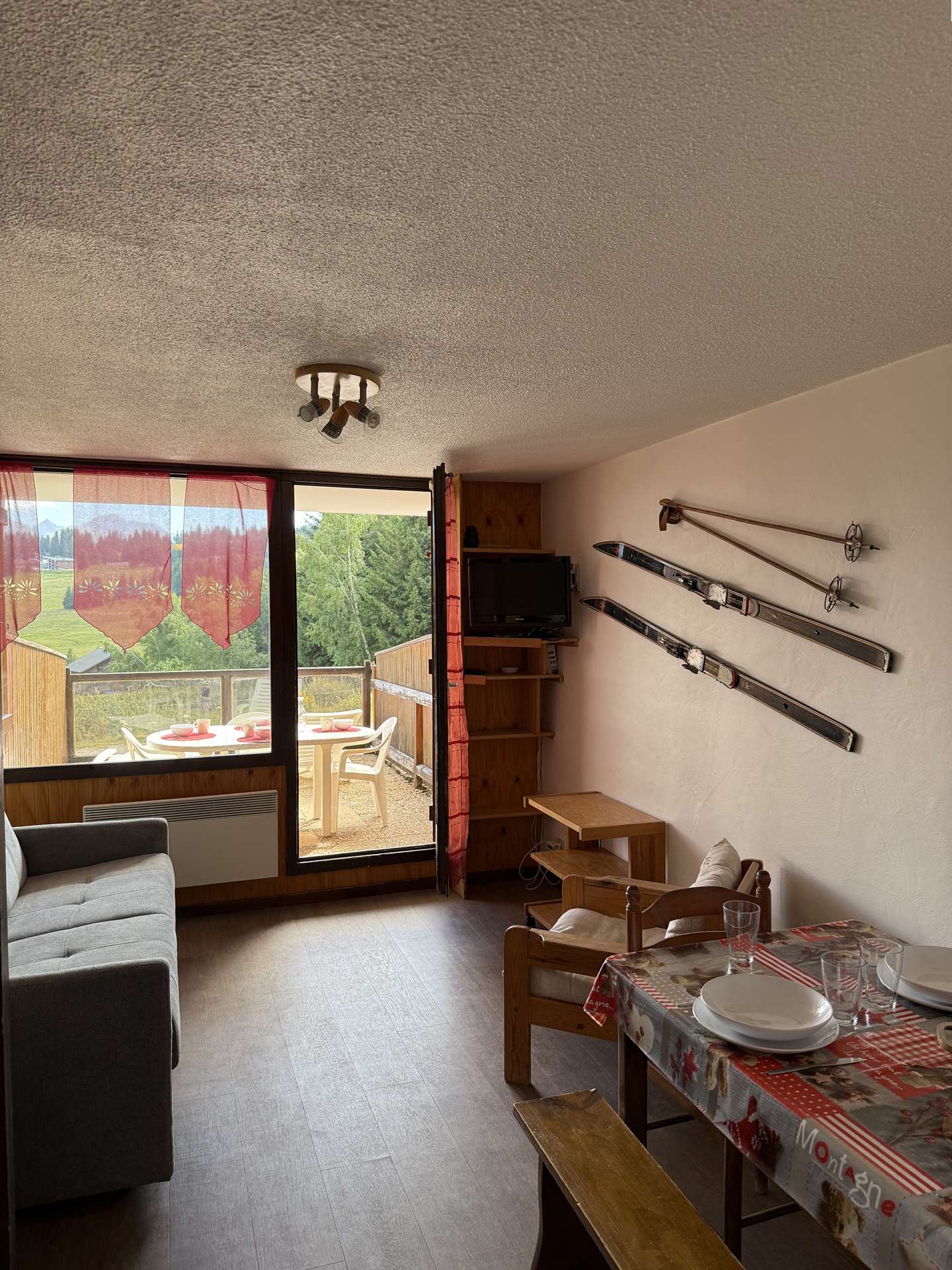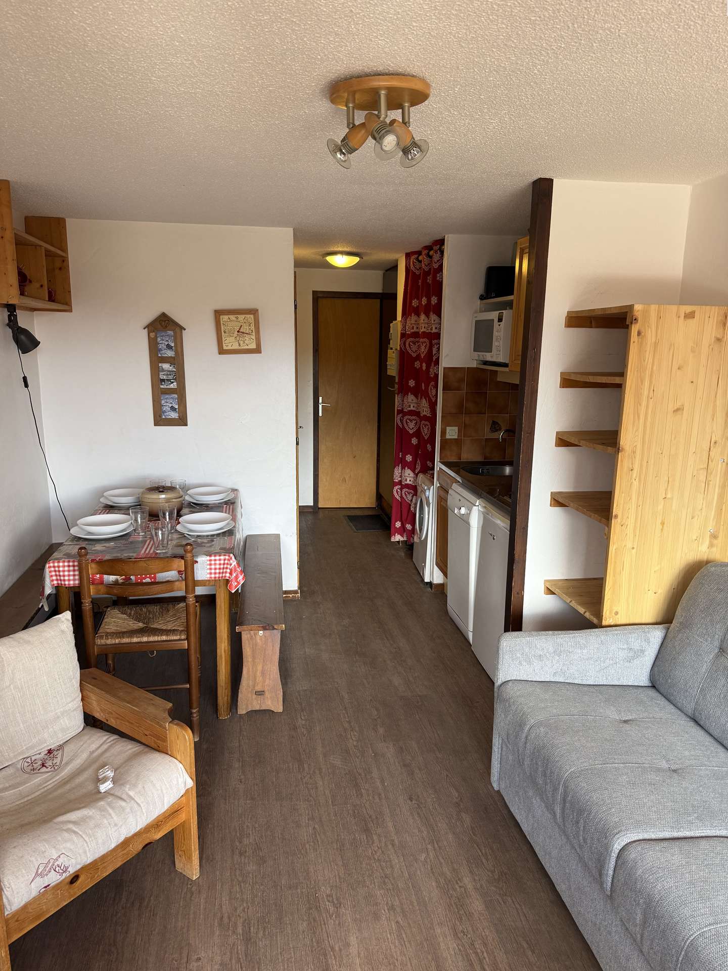 L'appartement comprend une kitchenette équipée, un séjour avec un banquette BZ 140, une chambre avec lits superposés 2x90, une salle d'eau et un WC séparé.